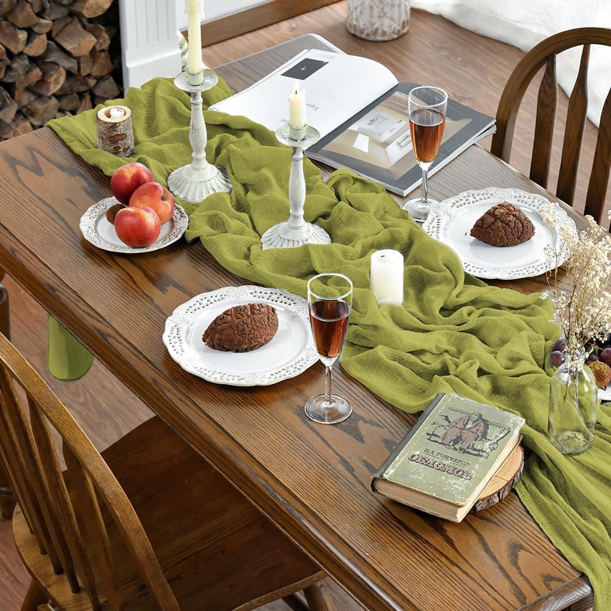 Artoid Mode Boho Cheesecloth Gauze Dusty Pink Wedding Table Runner, 120 Inch Seasonal Fabric Kitchen Dining Holiday Table Decor for Home Party Indoor(Grass Green)