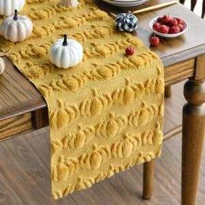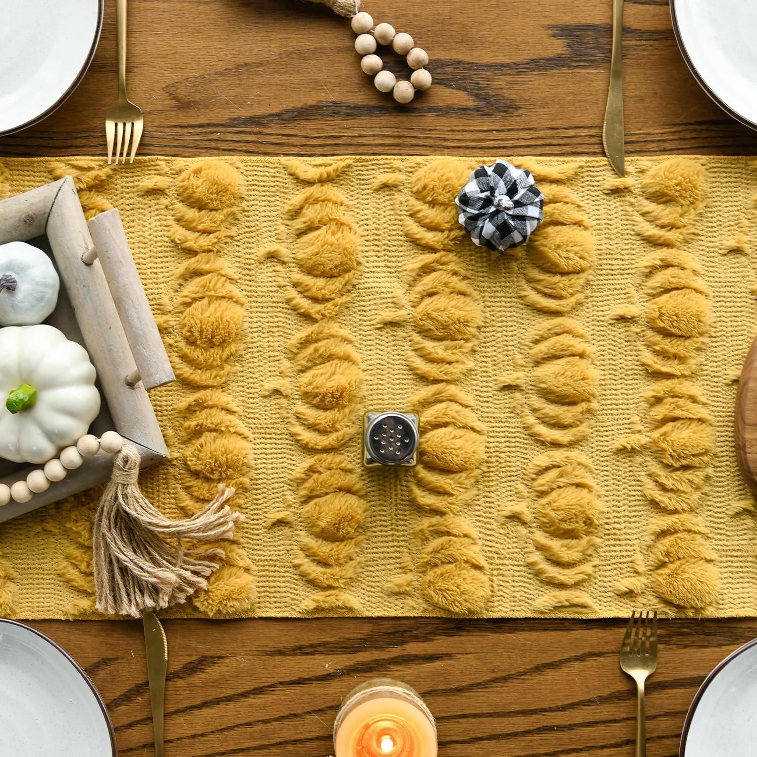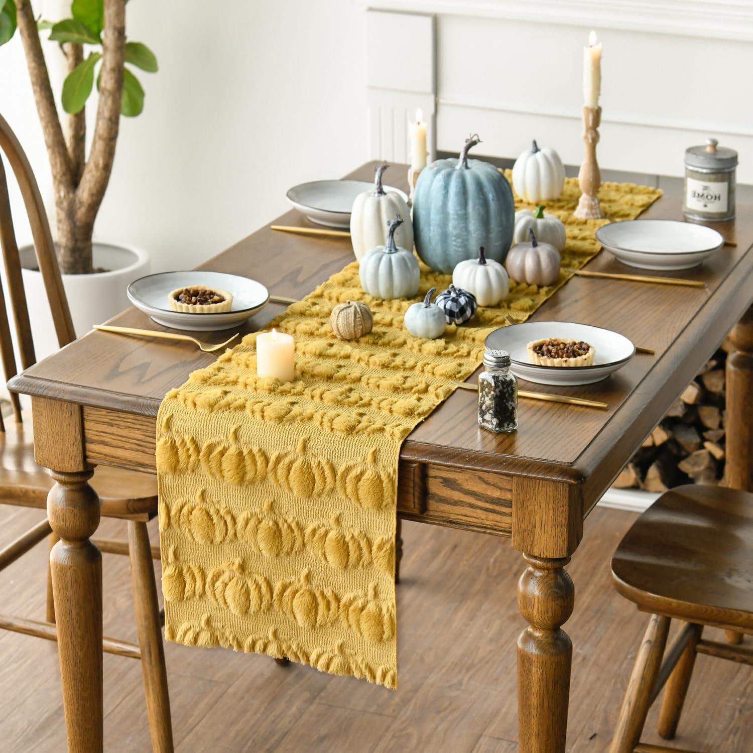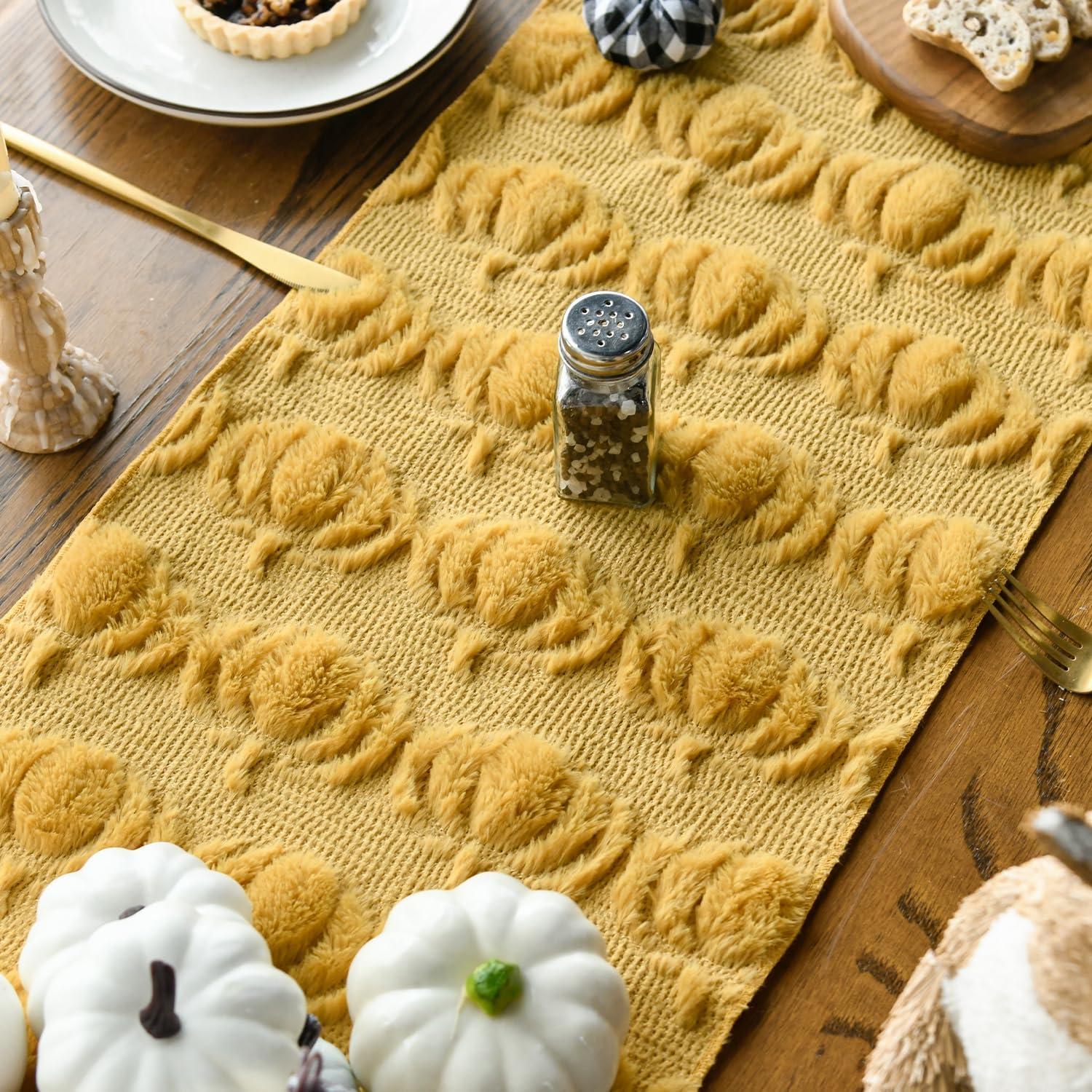 Artoid Mode Beige Soft Plush Faux Fur Jacquard Pumpkins Fall Table Runner, Seasonal Autumn Kitchen Dining Table Decoration for Home Party Decor 13×72 Inch(Ginger)