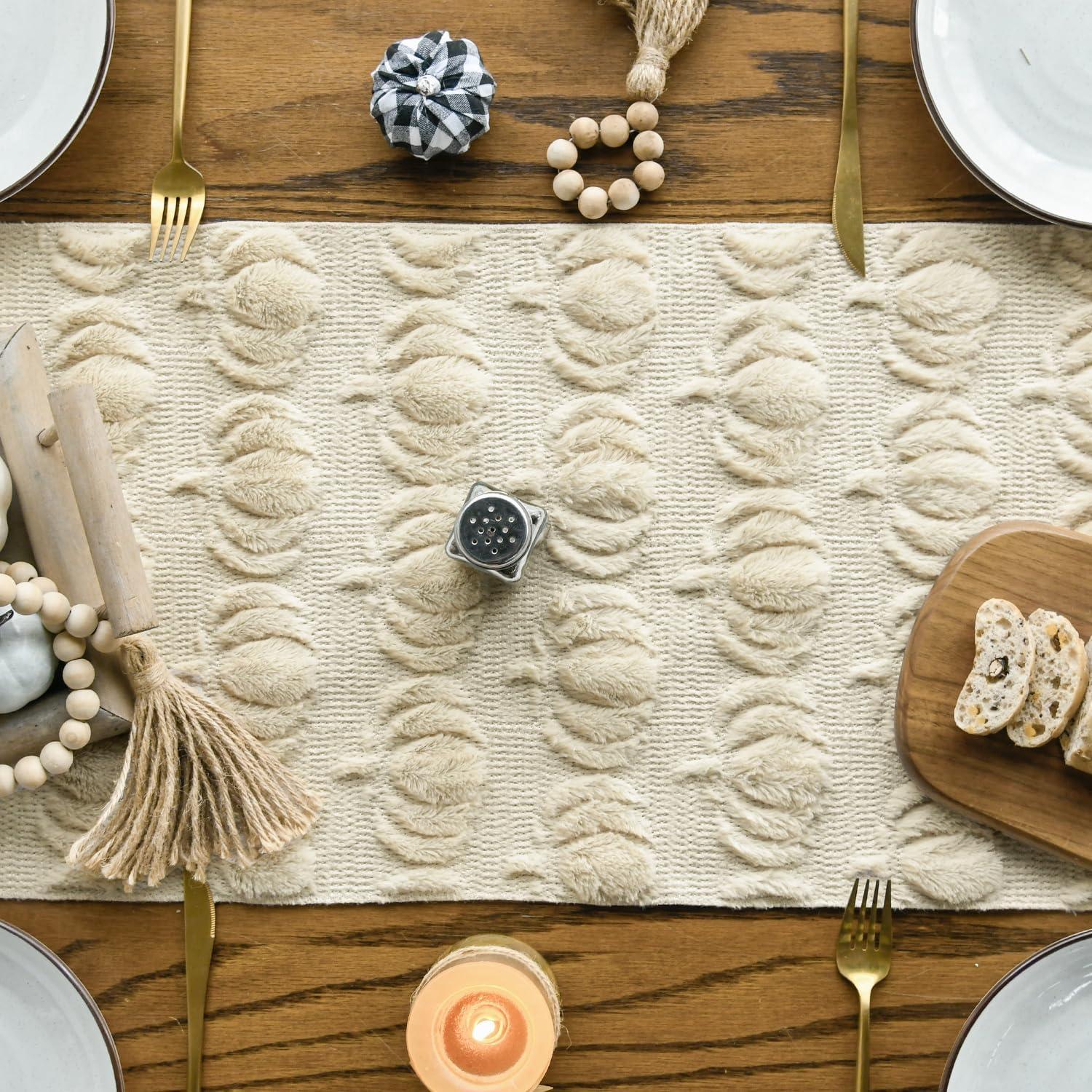 Artoid Mode Beige Soft Plush Faux Fur Jacquard Pumpkins Fall Table Runner, Seasonal Autumn Kitchen Dining Table Decoration for Home Party Decor 13×72 Inch(Beige)