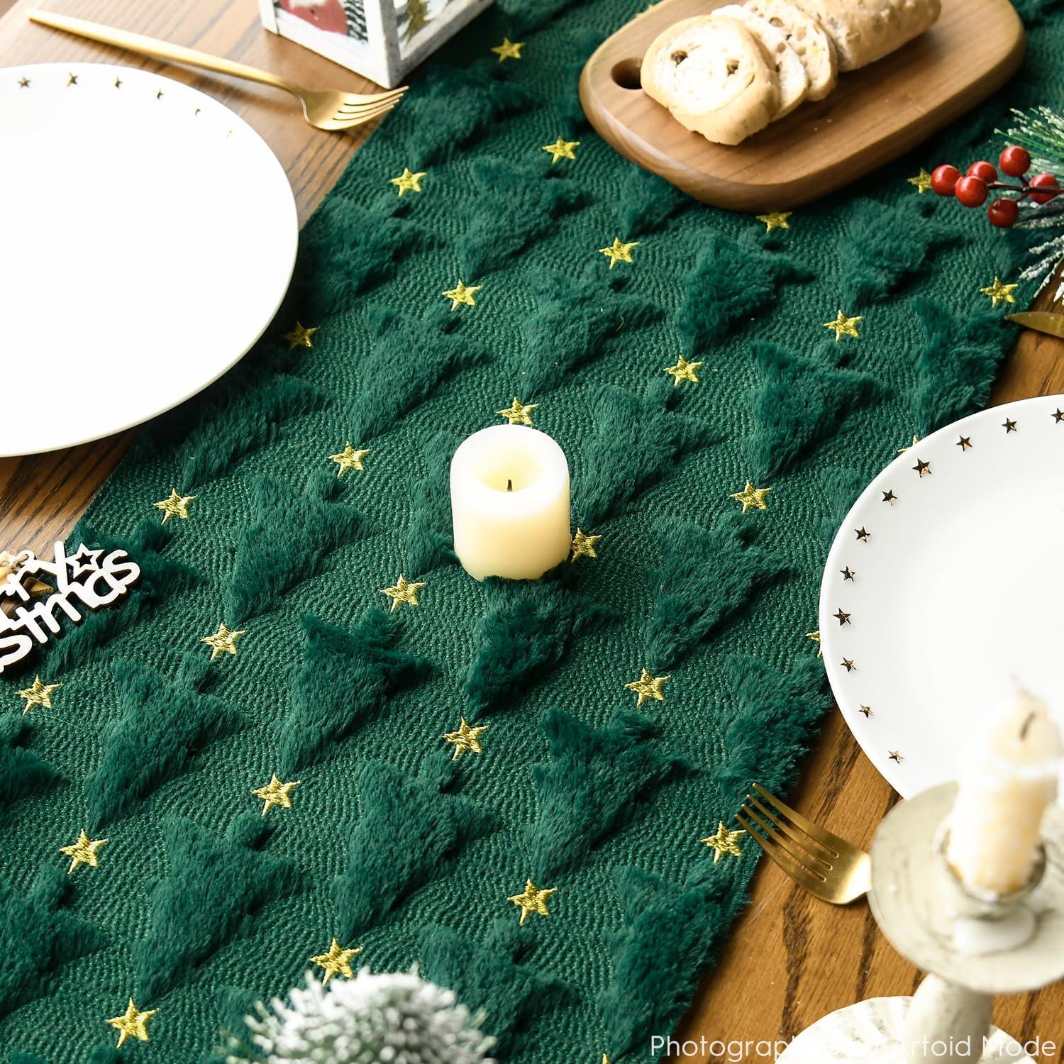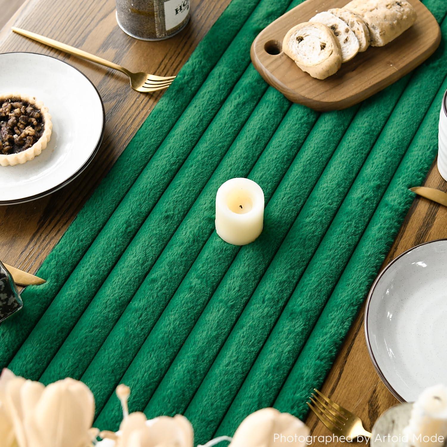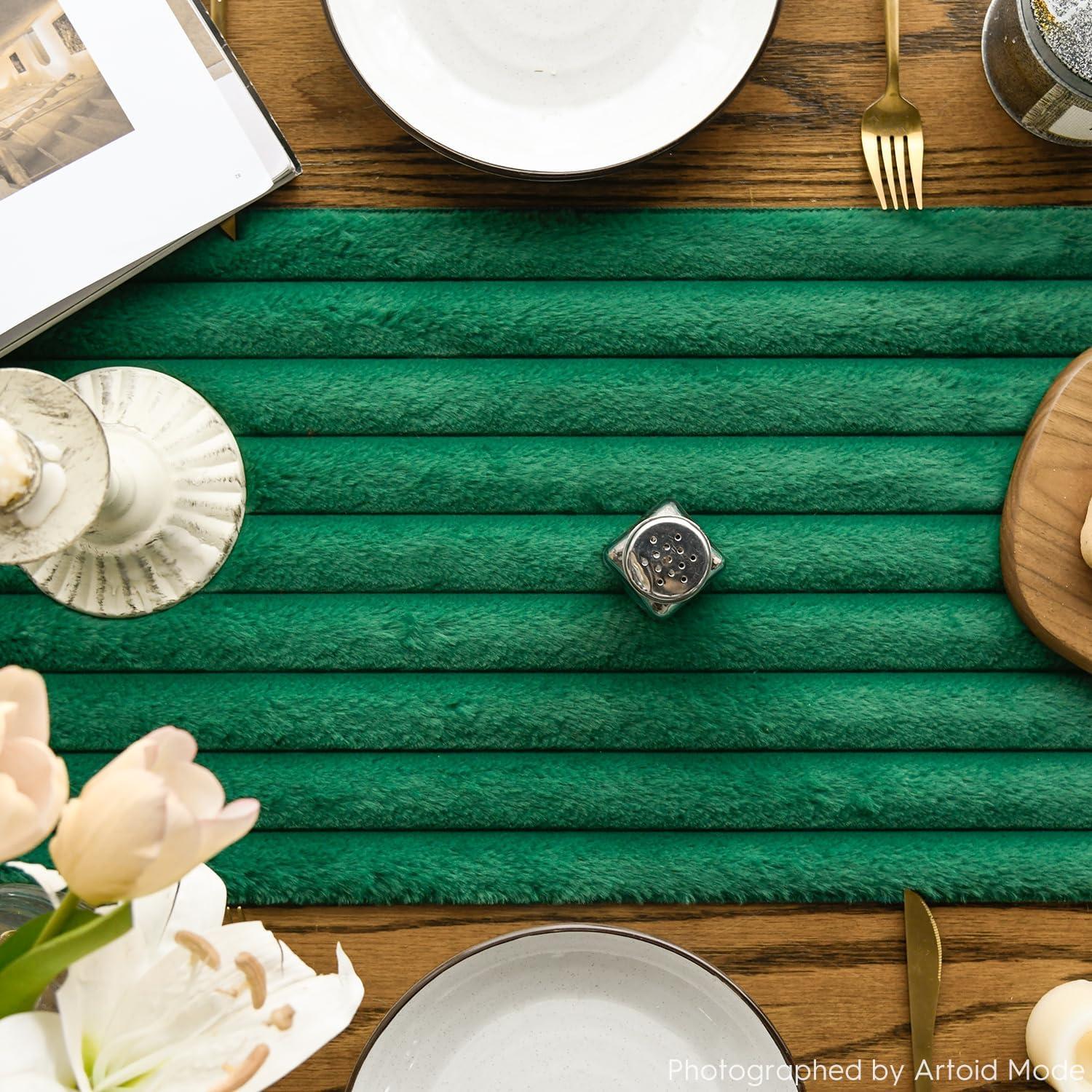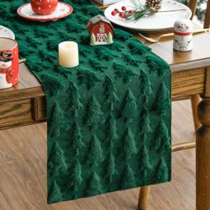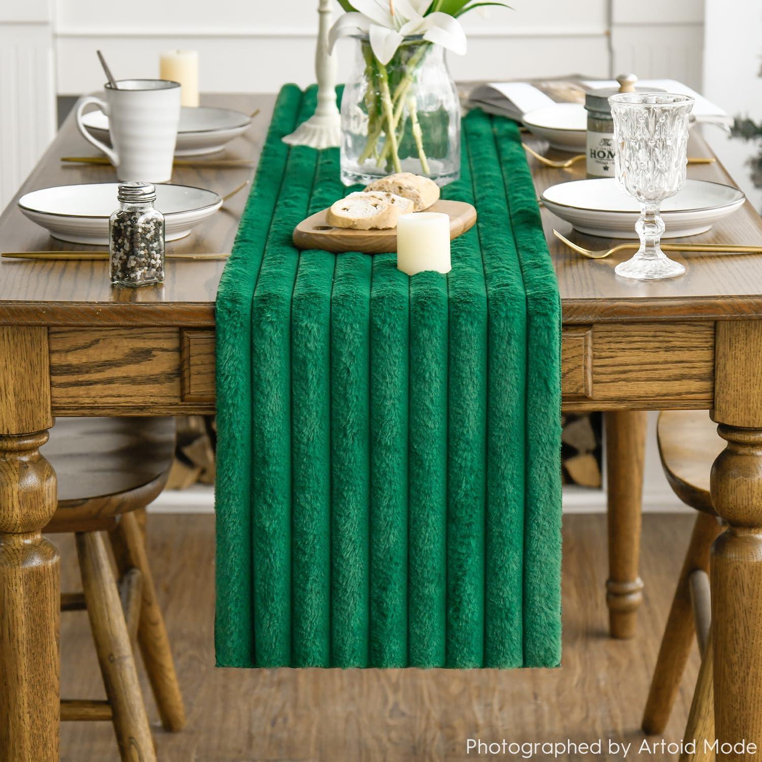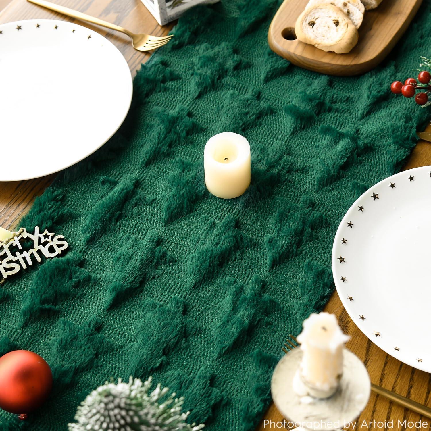 Artoid Mode Red Soft Plush Faux Fur Jacquard Table Runner, Holiday Seasonal Kitchen Dining Table Decoration for Home Party Decor 13×72 Inch(Forest Green)