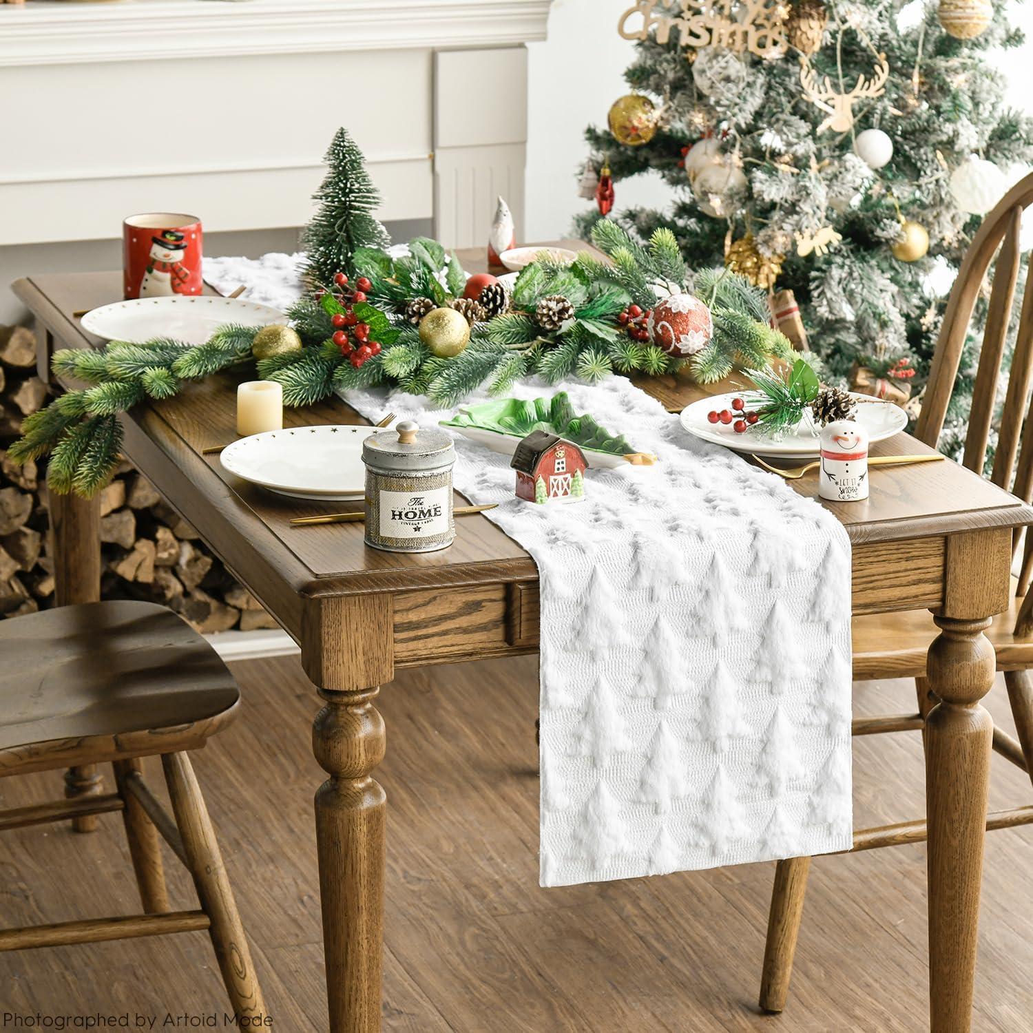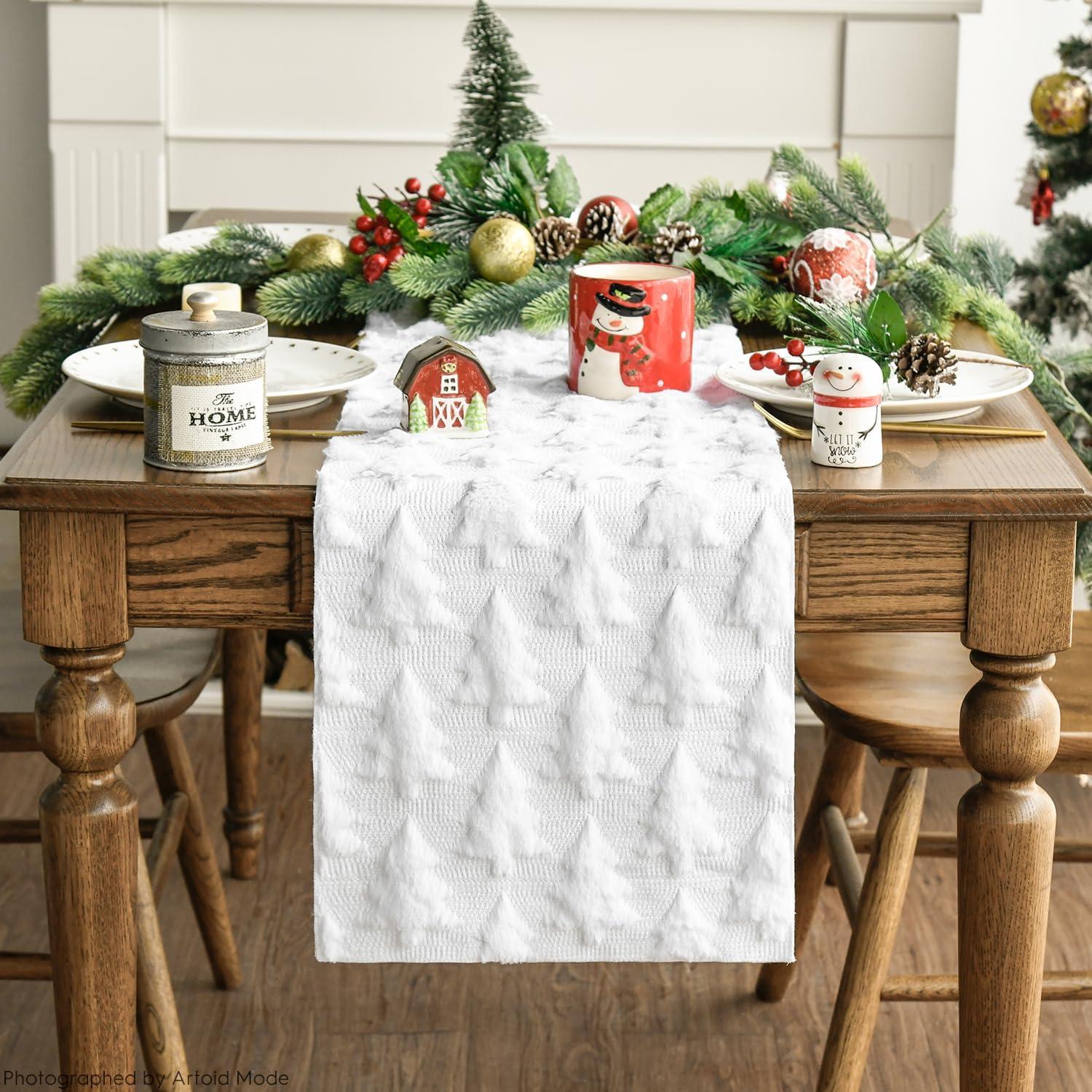 Artoid Mode Christmas Trees Green Soft Plush Faux Fur Jacquard Christmas Table Runner, Holiday Kitchen Dining Table Decoration for Home Party Decor 13×72 Inch(White)