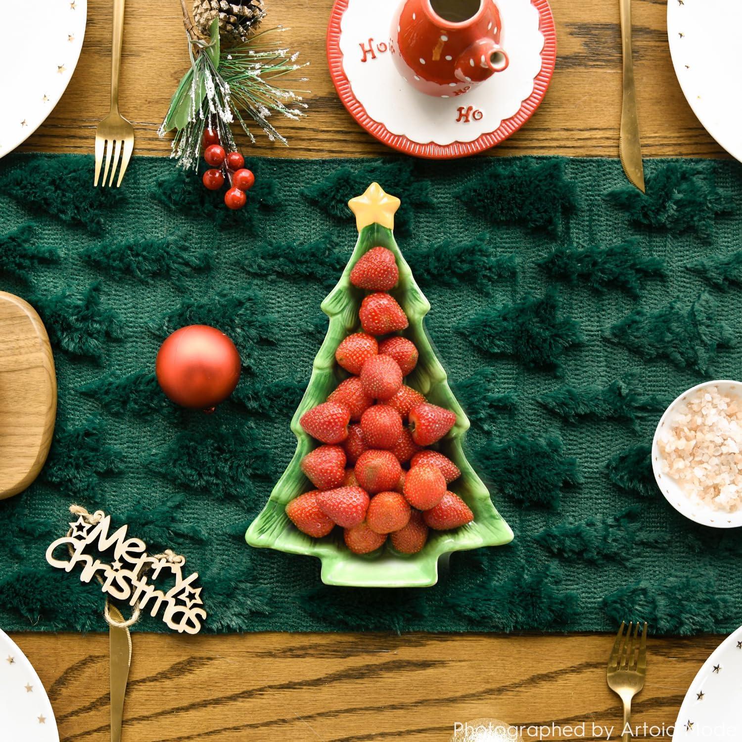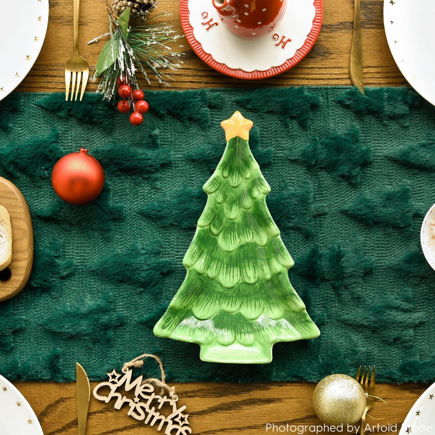 Artoid Mode Christmas Trees Green Soft Plush Faux Fur Jacquard Christmas Table Runner, Holiday Kitchen Dining Table Decoration for Home Party Decor 13×72 Inch(Green)