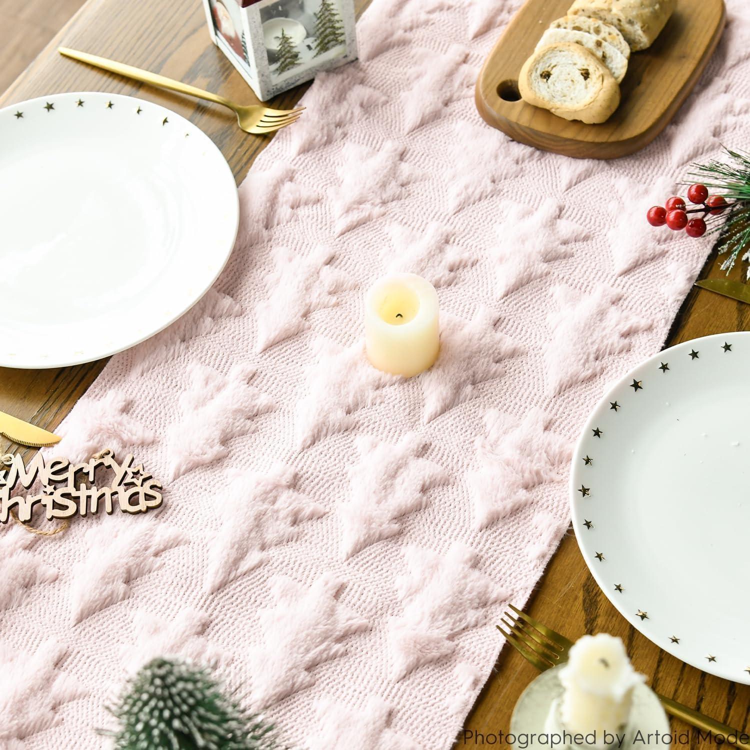 Artoid Mode Christmas Trees Green Soft Plush Faux Fur Jacquard Christmas Table Runner, Holiday Kitchen Dining Table Decoration for Home Party Decor 13×72 Inch(Pink)