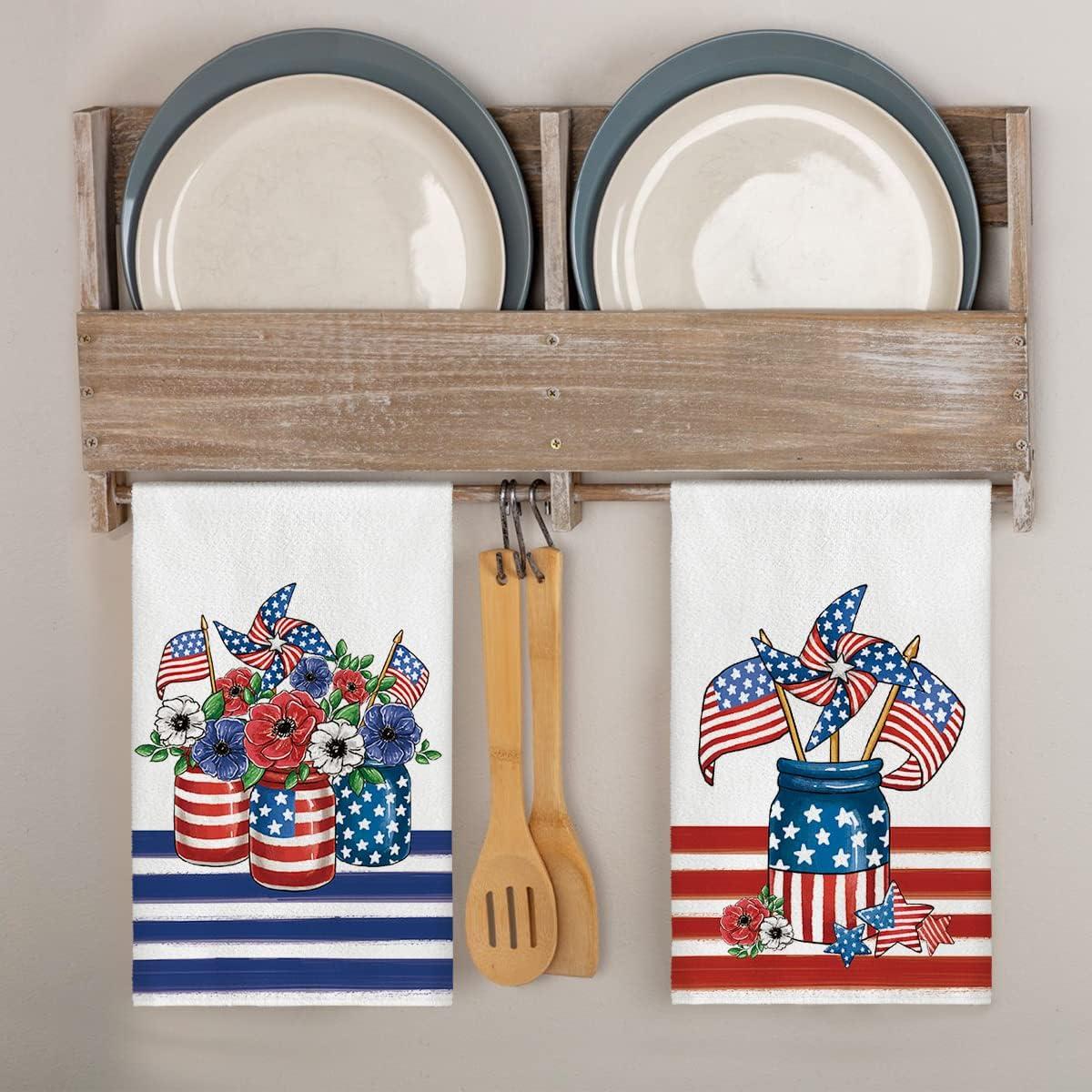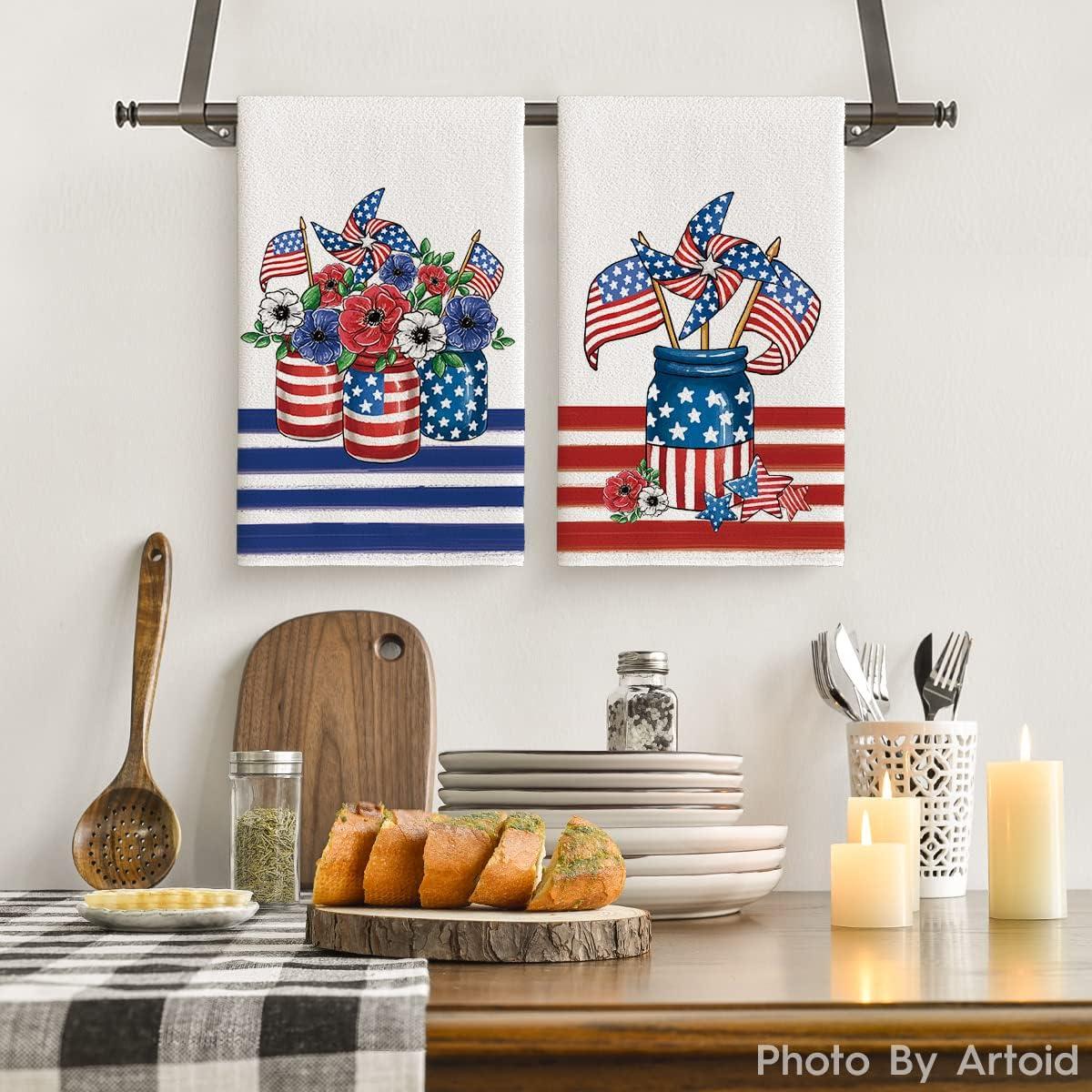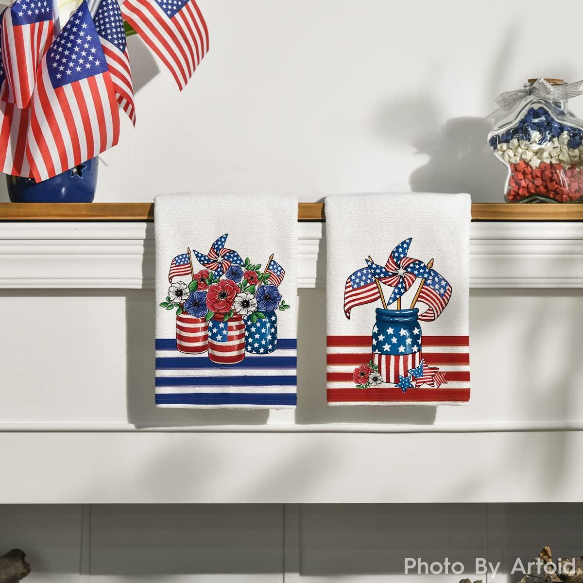 Artoid Mode America Flag Vase Windmill 4th of July Kitchen Towels Dish Towels, 18×26 Inch Patriotic Memorial Day Decoration Hand Towels Set of 2