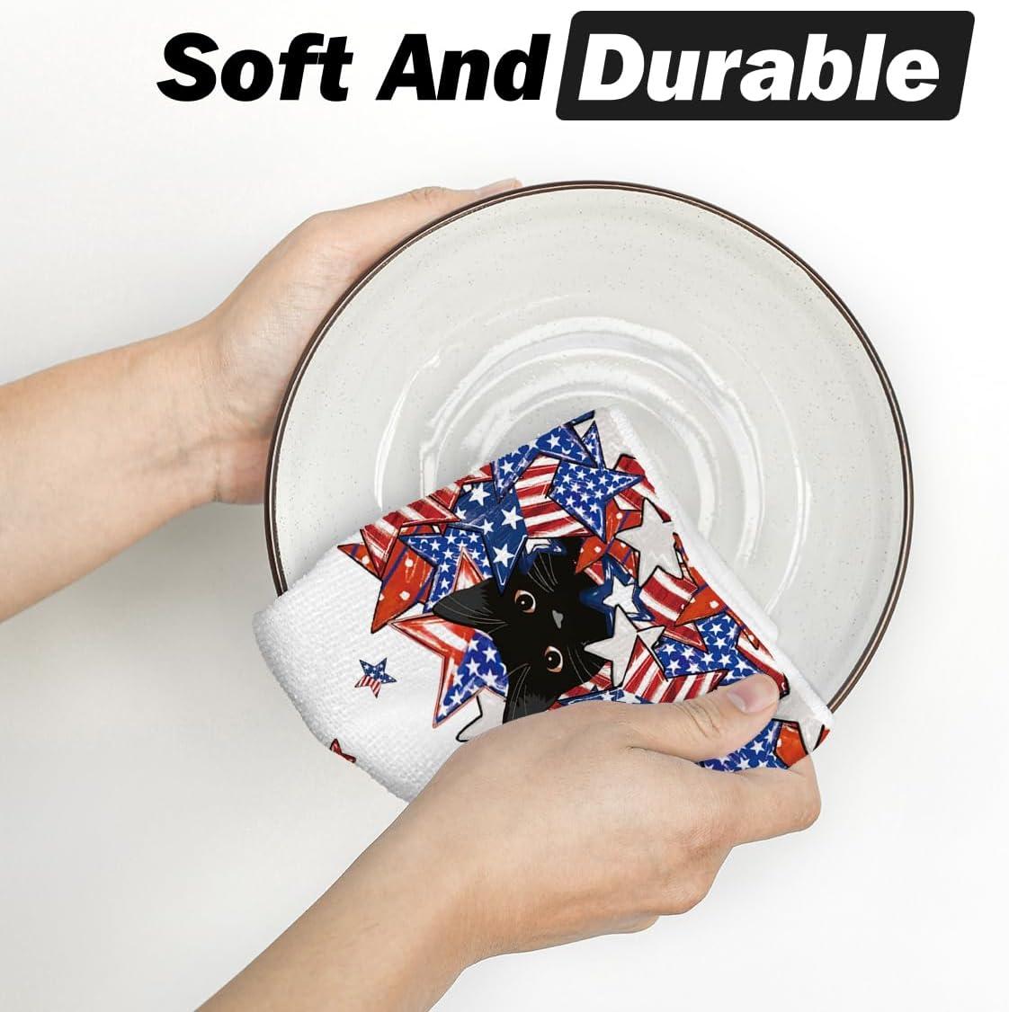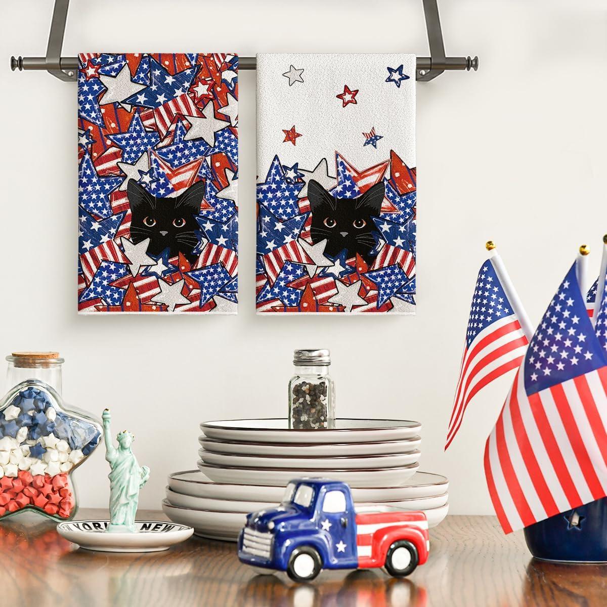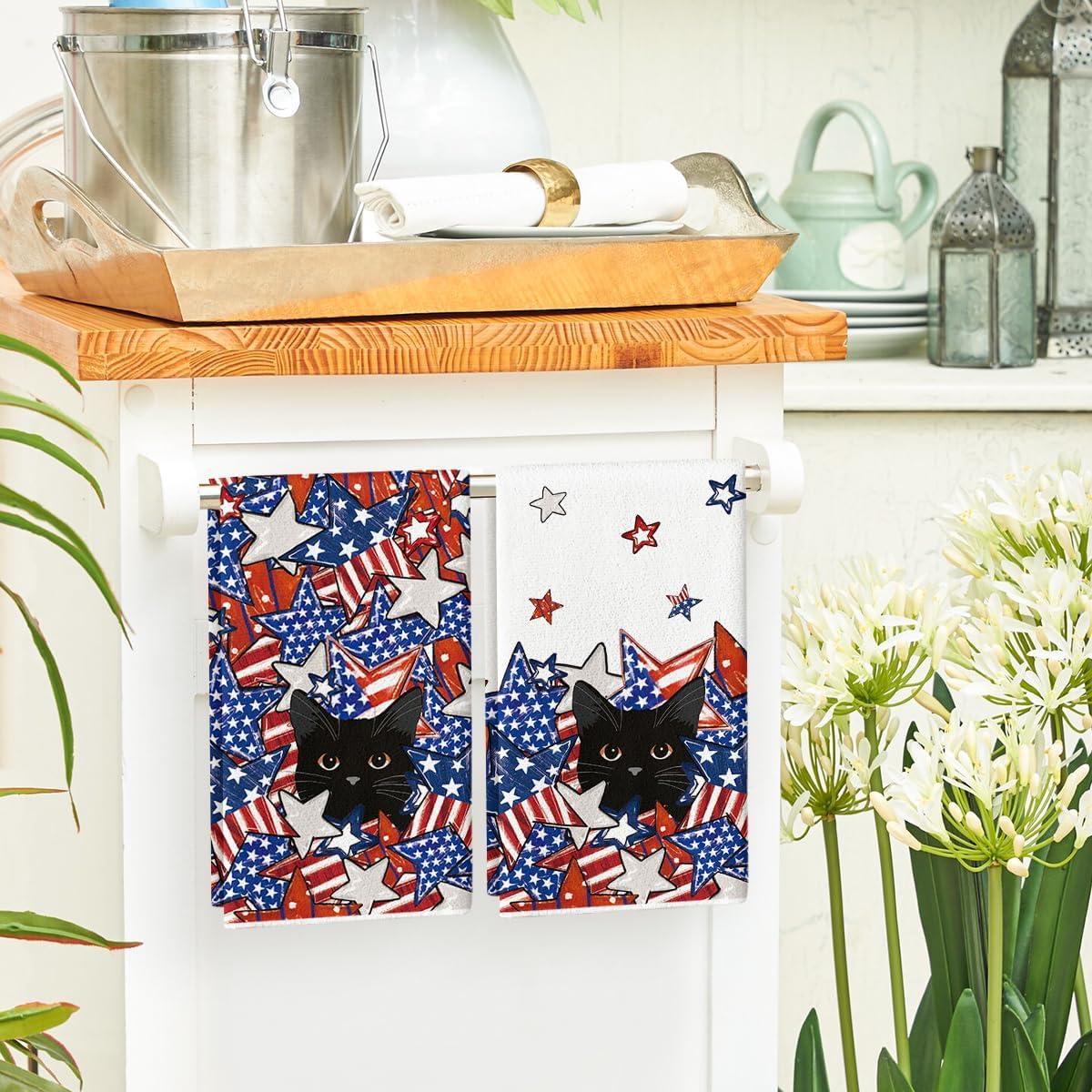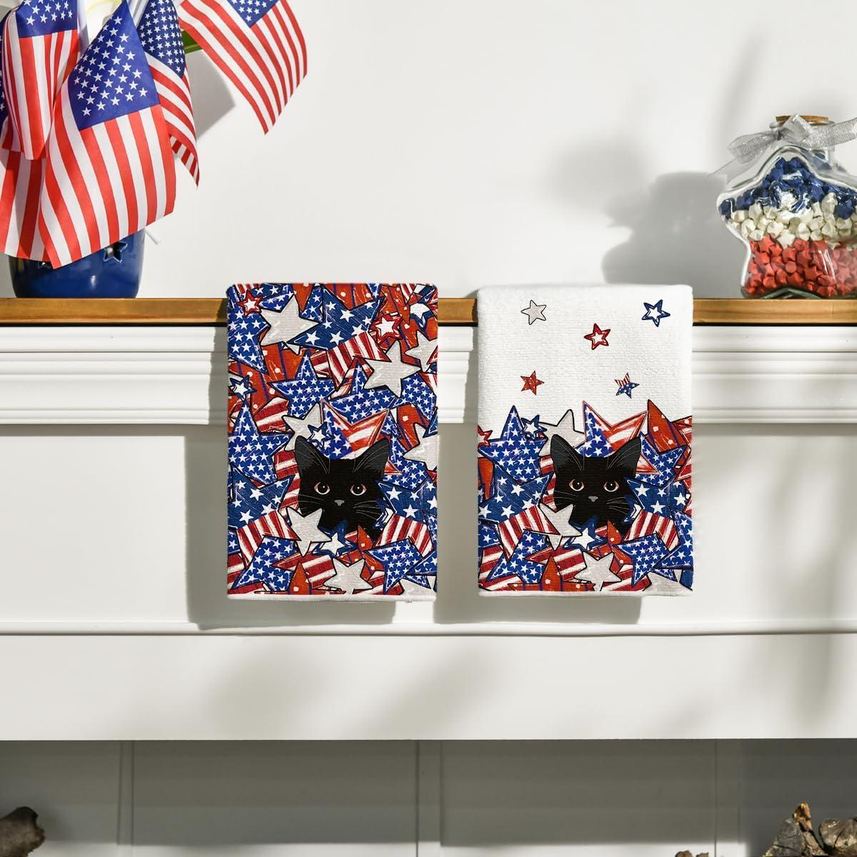 Artoid Mode American Flag Stars Black Cats Patriotic 4th of July Kitchen Towels Dish Towels, 18×26 Inch Memorial Day Decoration Hand Towels Set of 2