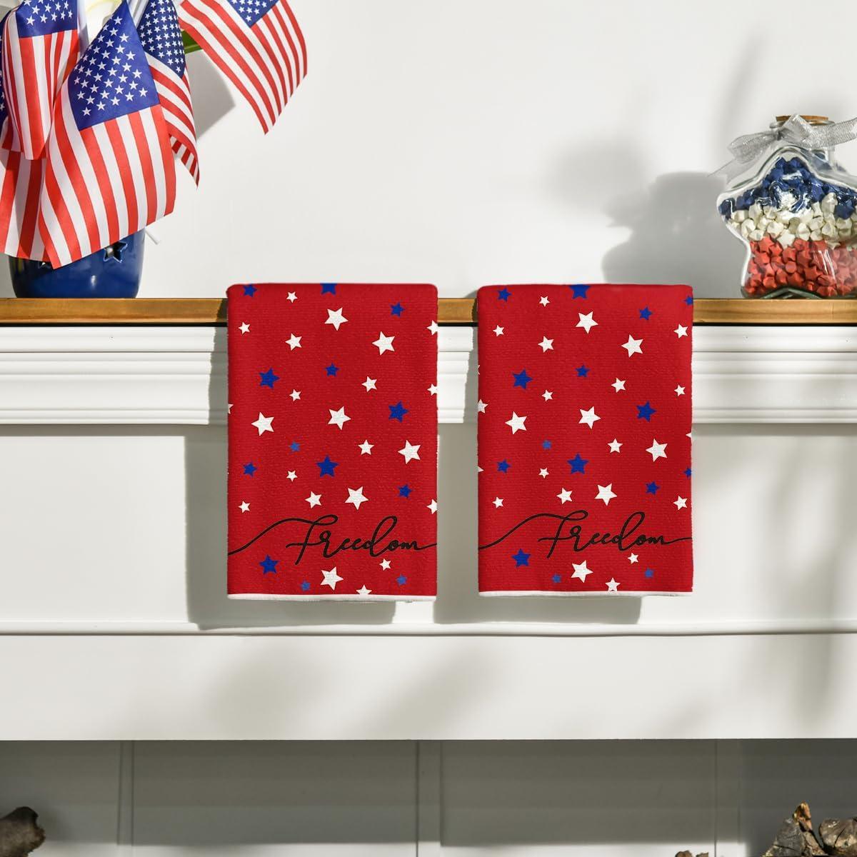 Artoid Mode Red Freedom Stars America Patriotic 4th of July Kitchen Towels Dish Towels, 18×26 Inch Memorial Day Decoration Hand Towels Set of 2