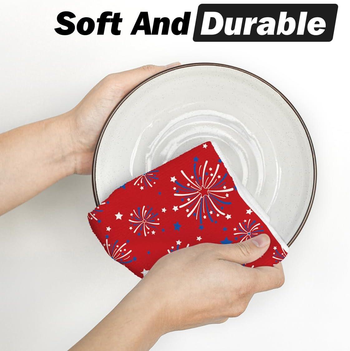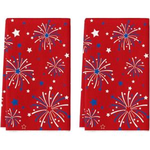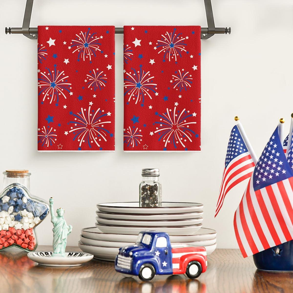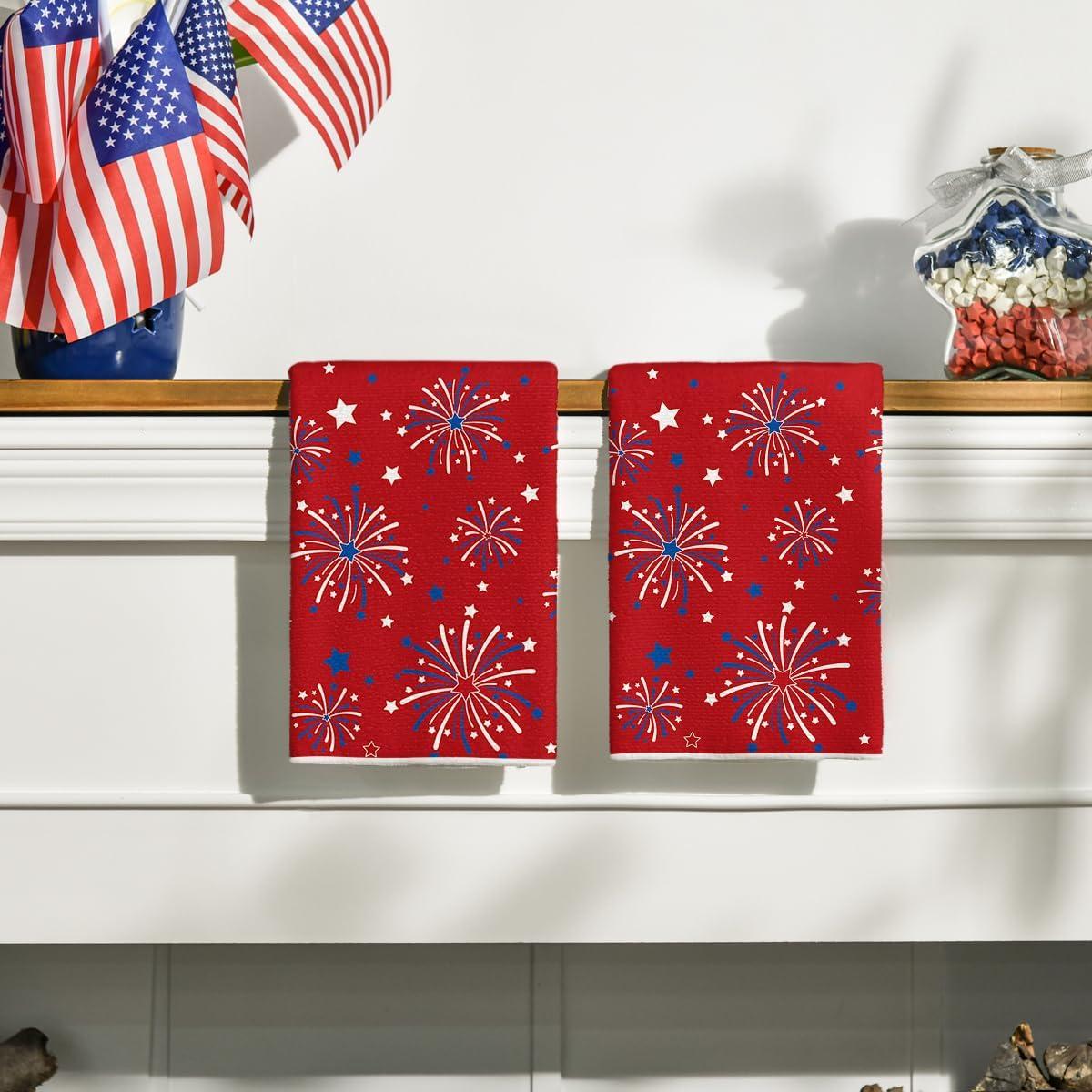 Artoid Mode Red Stars Firework America Patriotic 4th of July Kitchen Towels Dish Towels, 18×26 Inch Memorial Day Decoration Hand Towels Set of 2(Red)
