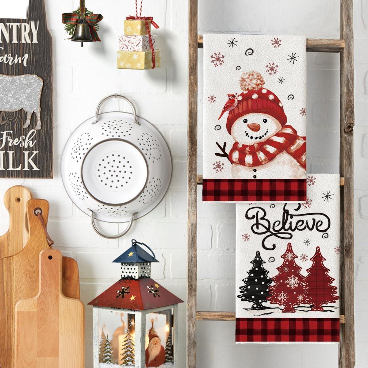 Artoid Mode Black Red Xmas Tree Snowman Christmas Kitchen Towels Dish Towels, 18×26 Inch Holiday Bird Believe Winter Decoration Hand Towels Set of 2(Red/Black)