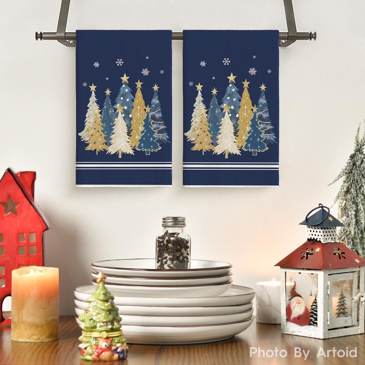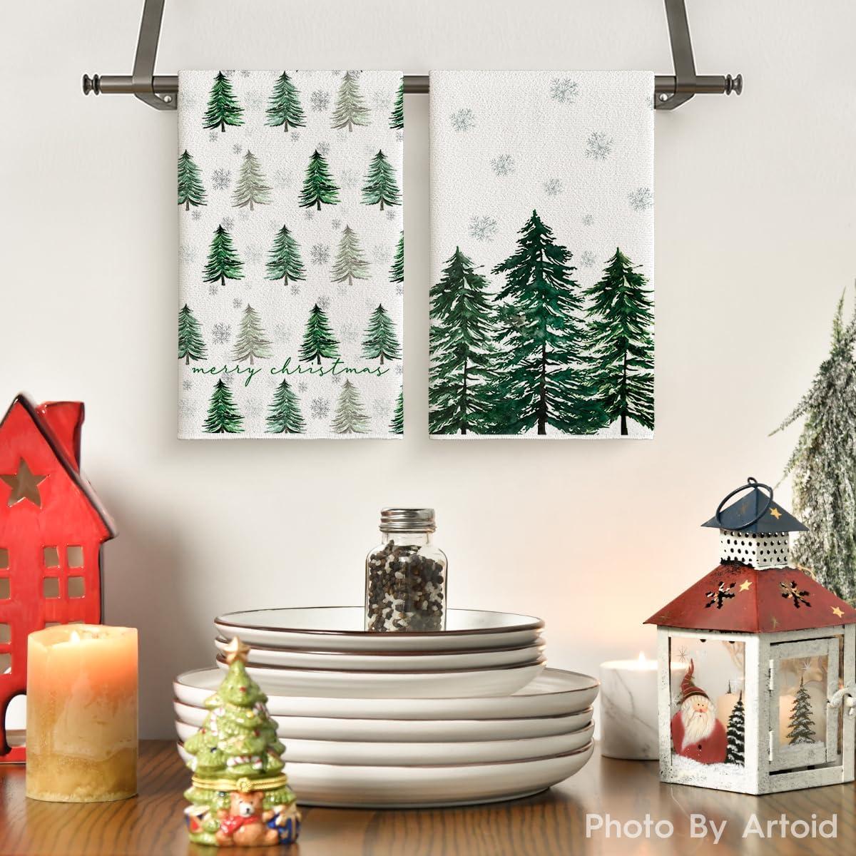 Artoid Mode Blue Xmas Tree Christmas Kitchen Towels Dish Towels, 18×26 Inch Farmhouse Holiday Snowflake Winter Decoration Cleaning Set of 2(Green)