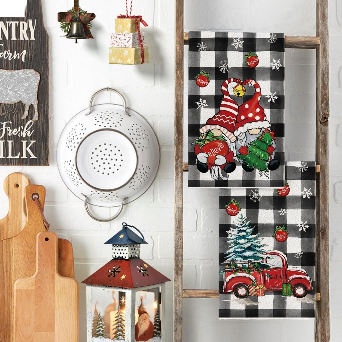 Artoid Mode Gnome Truck Christmas Kitchen Towels Dish Towels, 18×26 Inch Holiday Believe Xmas Tree Winter Decoration Hand Towels Set of 2(Black/Beige)