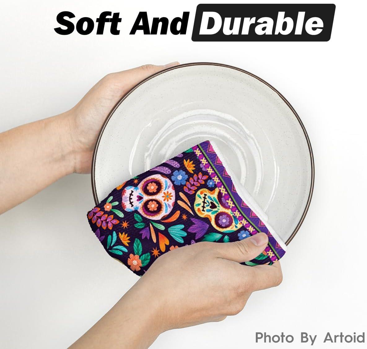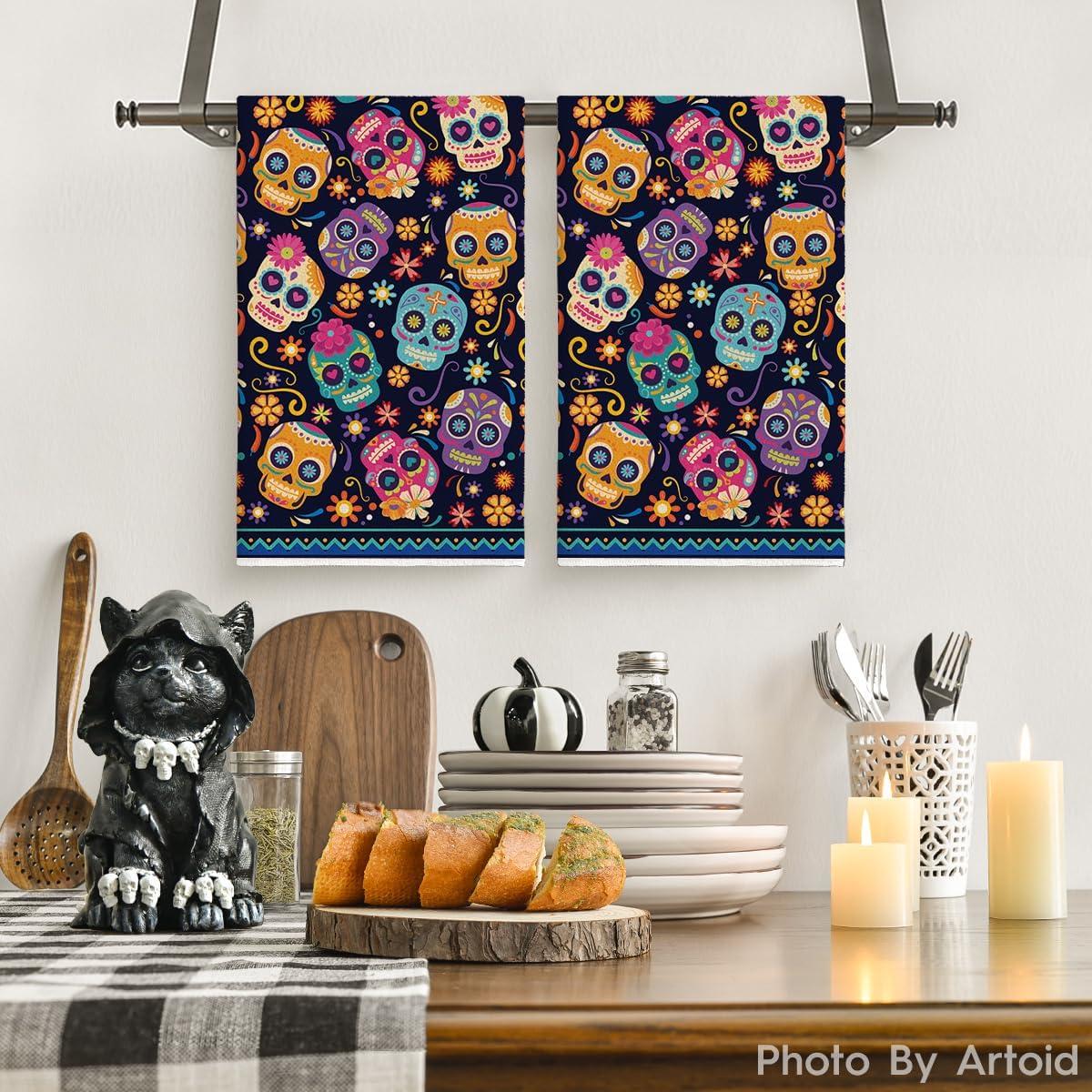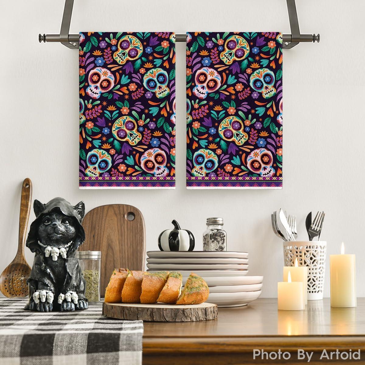 Artoid Mode Suger Skulls Floral Day of The Dead Kitchen Towels Dish Towels, 18×26 Inch Halloween Decoration Hand Towels Set of 2
