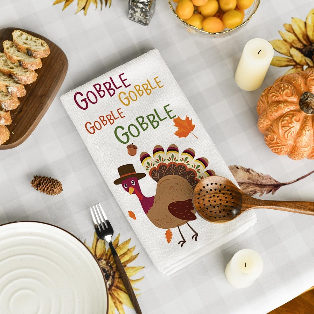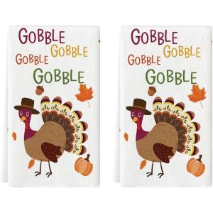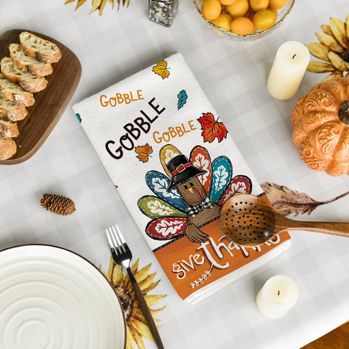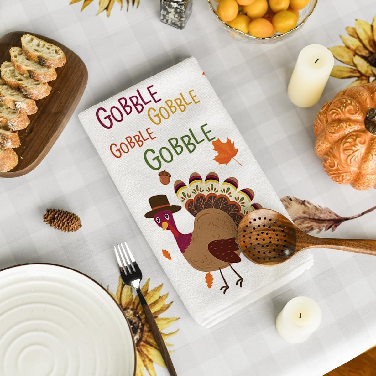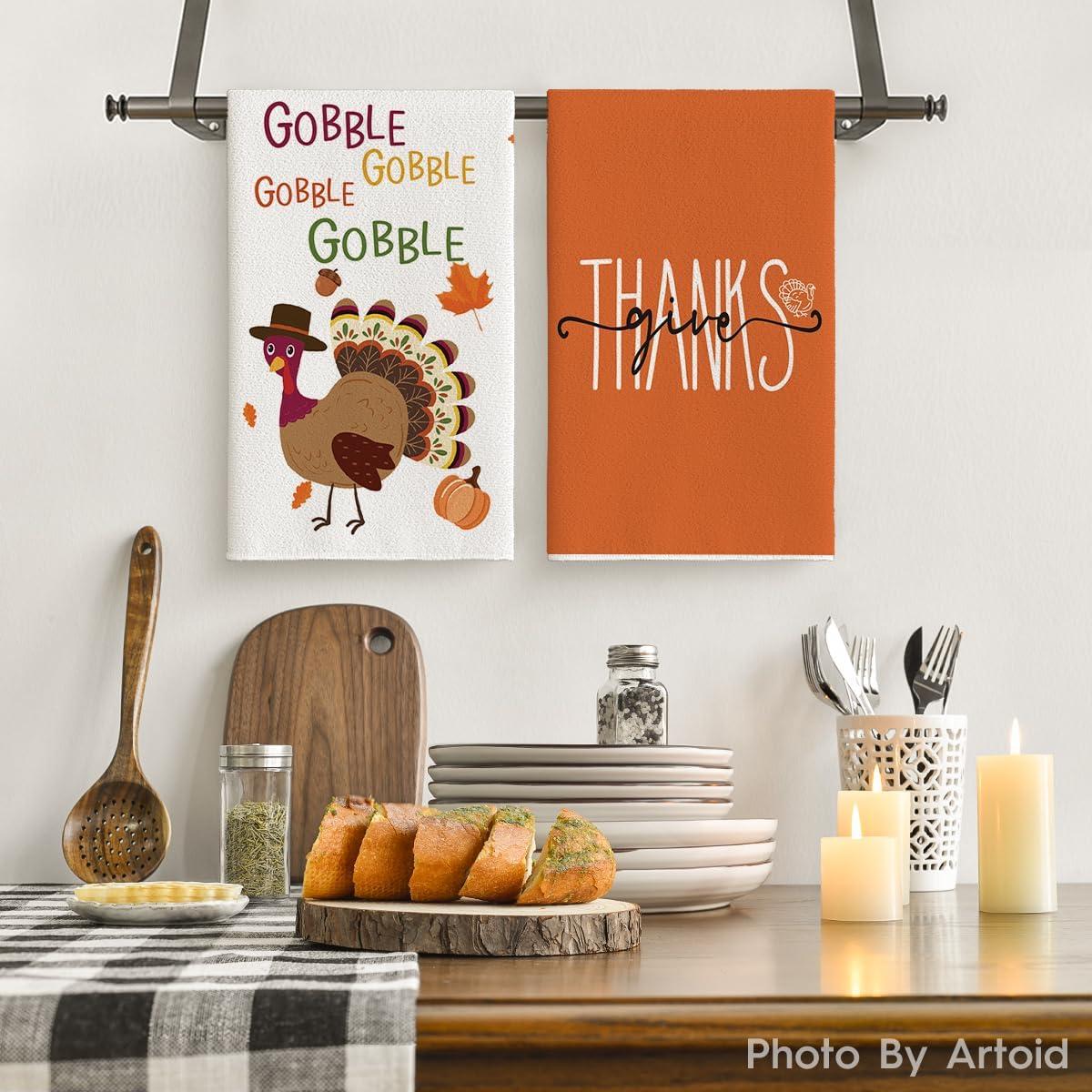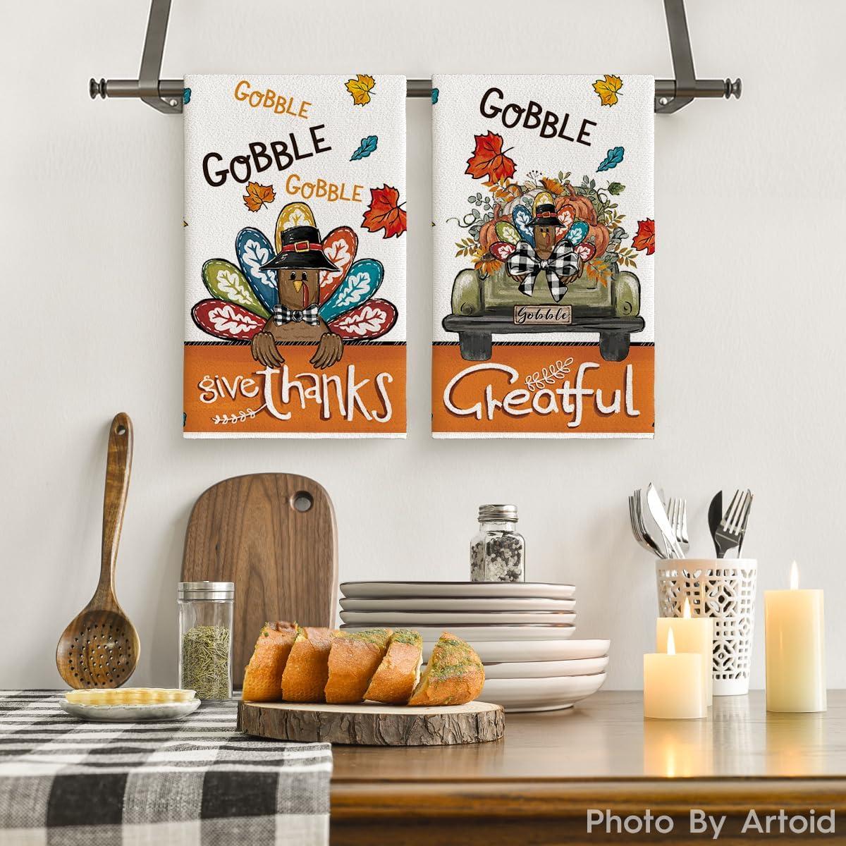 Artoid Mode Turkey Gobble Thanksgiving Kitchen Towels Dish Towels, 18×26 Inch Fall Pumpkin Decoration Hand Towels Set of 2