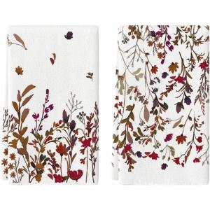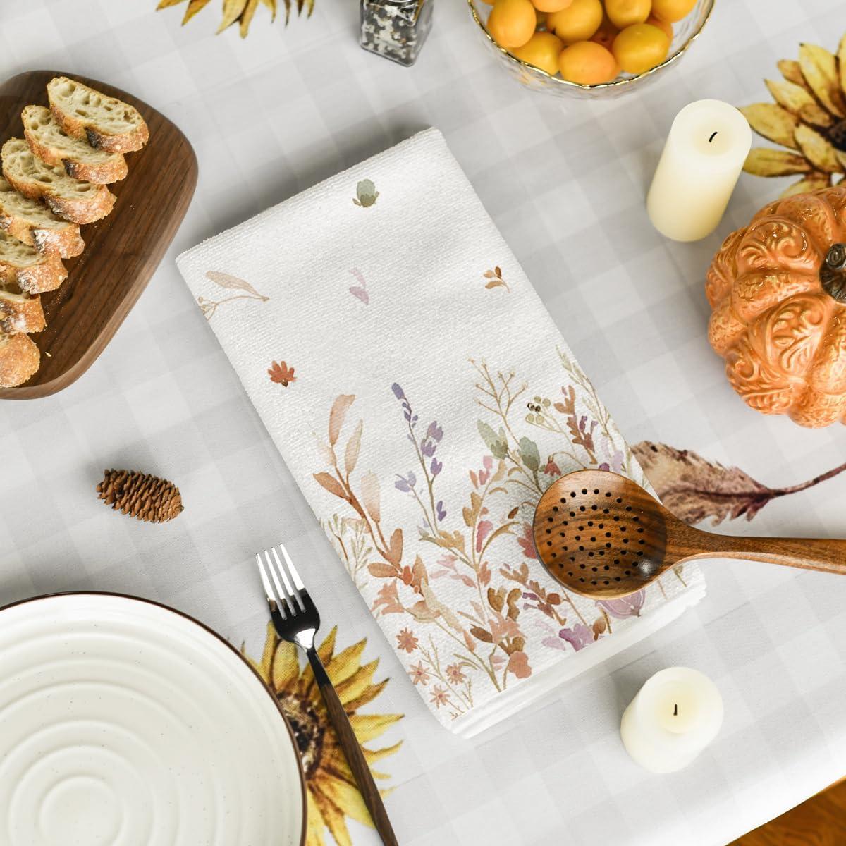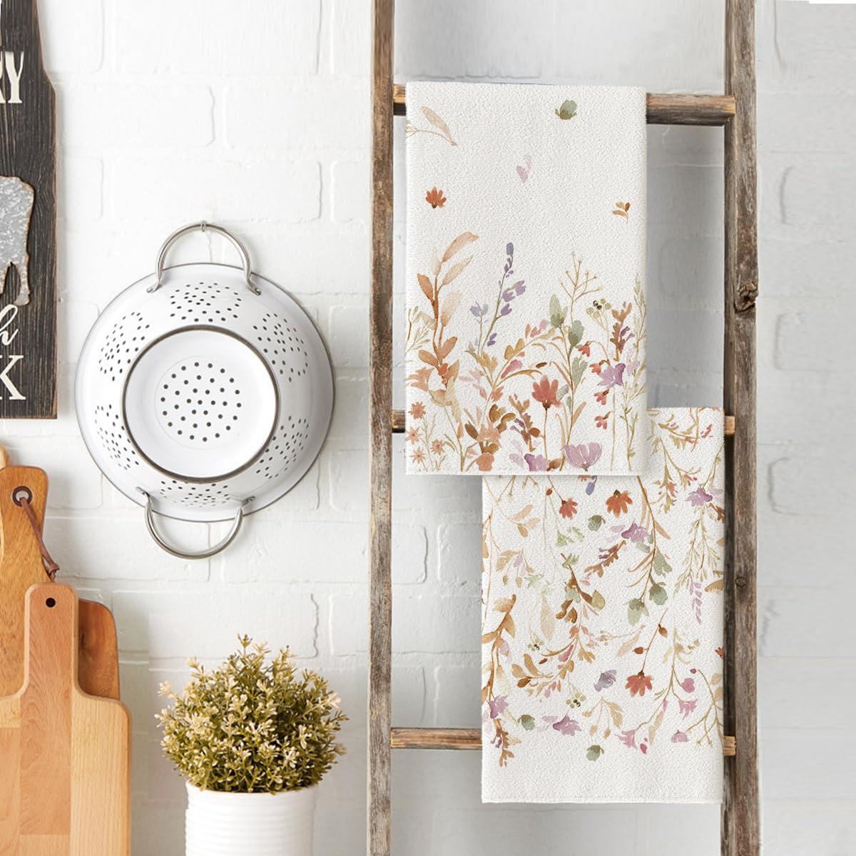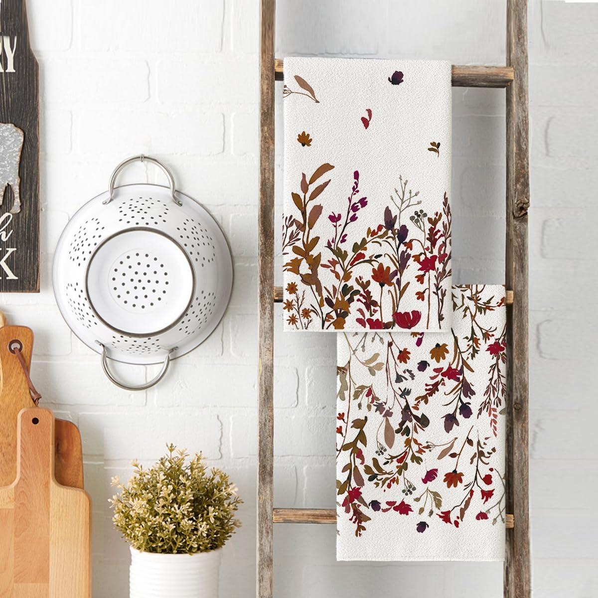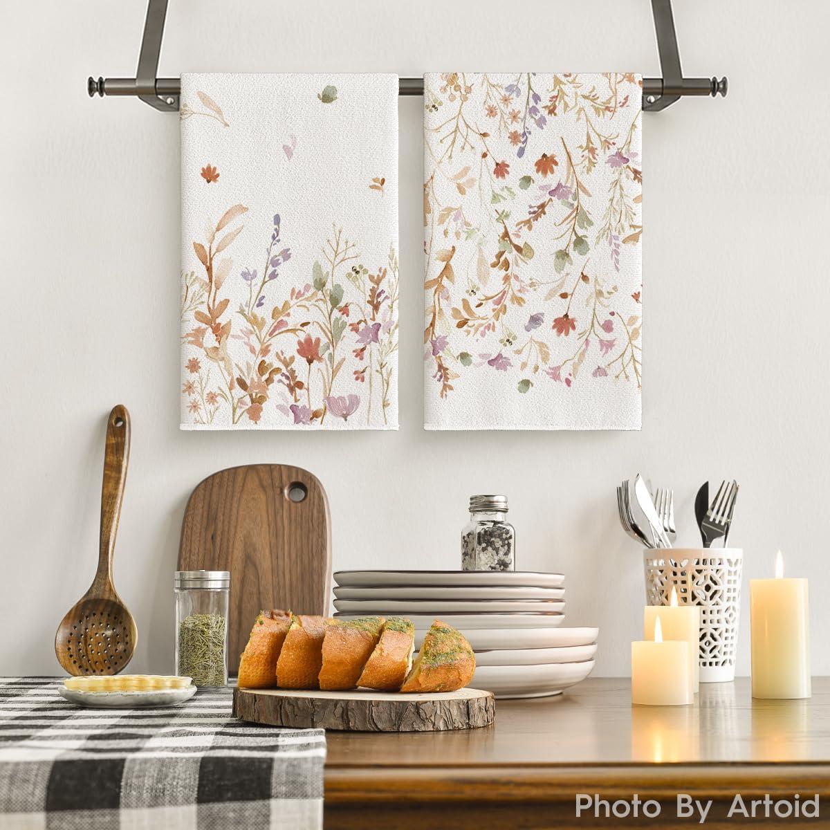 Artoid Mode Wildflower Floral Kitchen Towels Dish Towels, 18×26 Inch Leaves Holiday Decoration Hand Towels Set of 2(Beige)