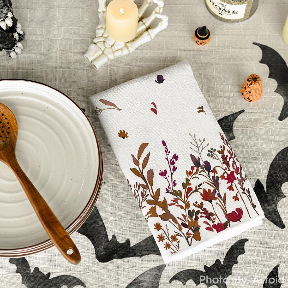 Artoid Mode Wildflower Floral Halloween Kitchen Towels Dish Towels, 18×26 Inch Farmhouse Leaves Decoration Hand Towels Set of 2(Black)