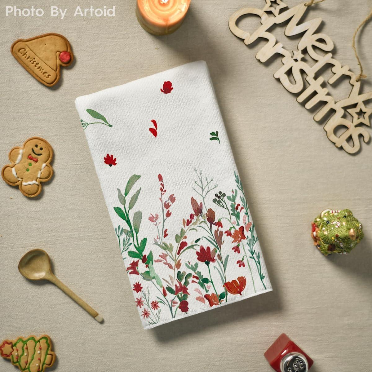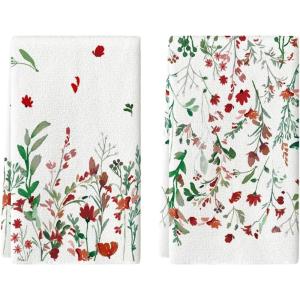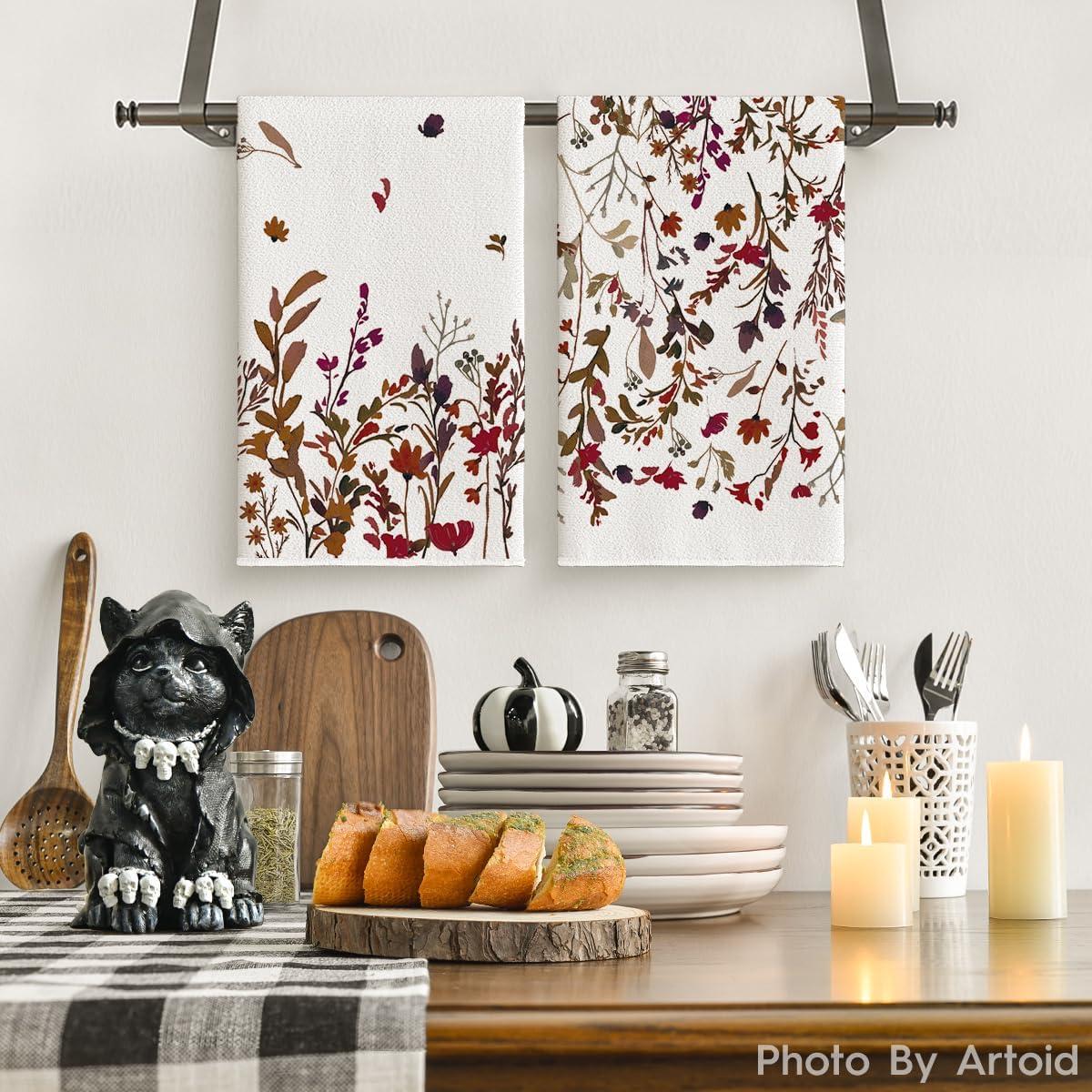 Artoid Mode Wildflower Floral Halloween Kitchen Towels Dish Towels, 18×26 Inch Farmhouse Leaves Decoration Hand Towels Set of 2(Green/Red)