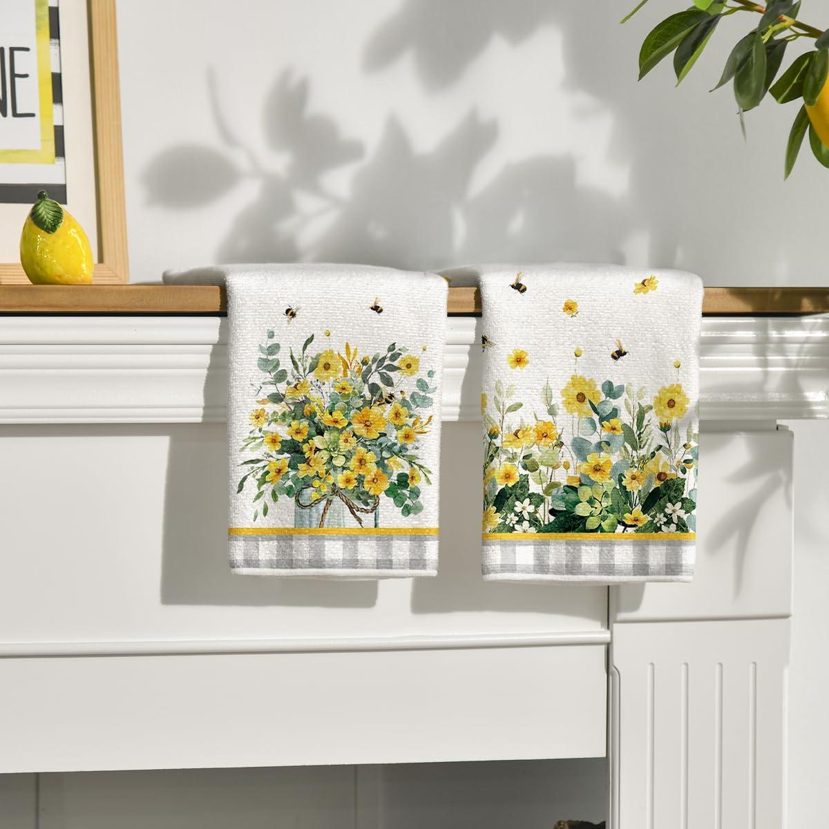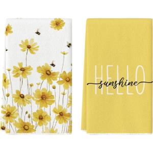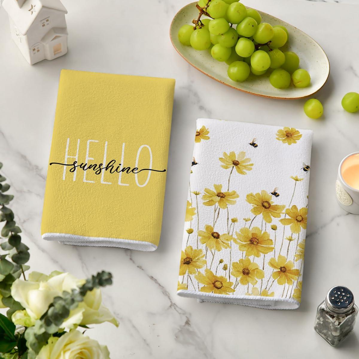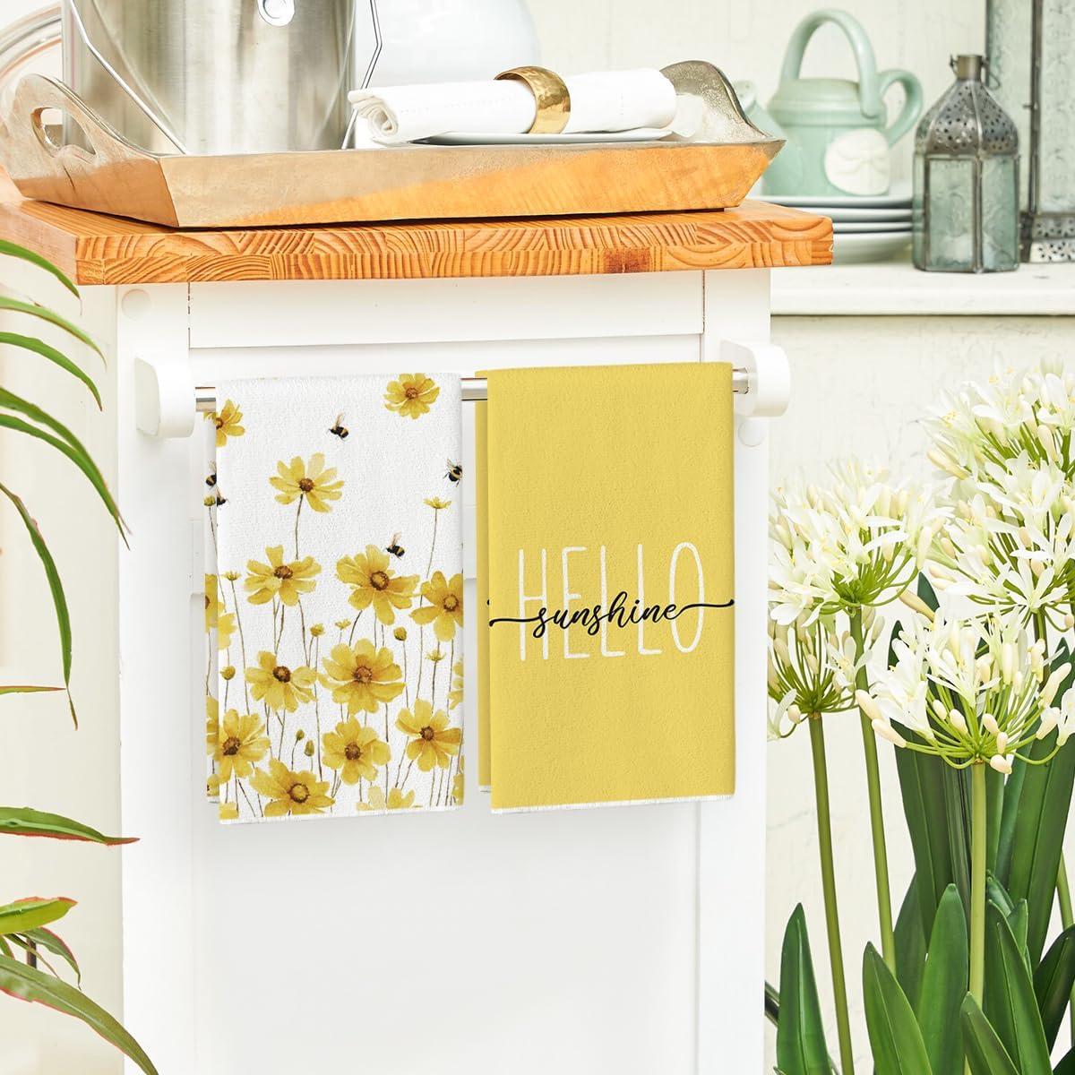Artoid Mode Yellow Flowers Bee Hello Sunshine Spring Kitchen Towels Dish Towels, 18×26 Inch Summer Holiday Decoration Hand Towels Set of 2(Yellow)