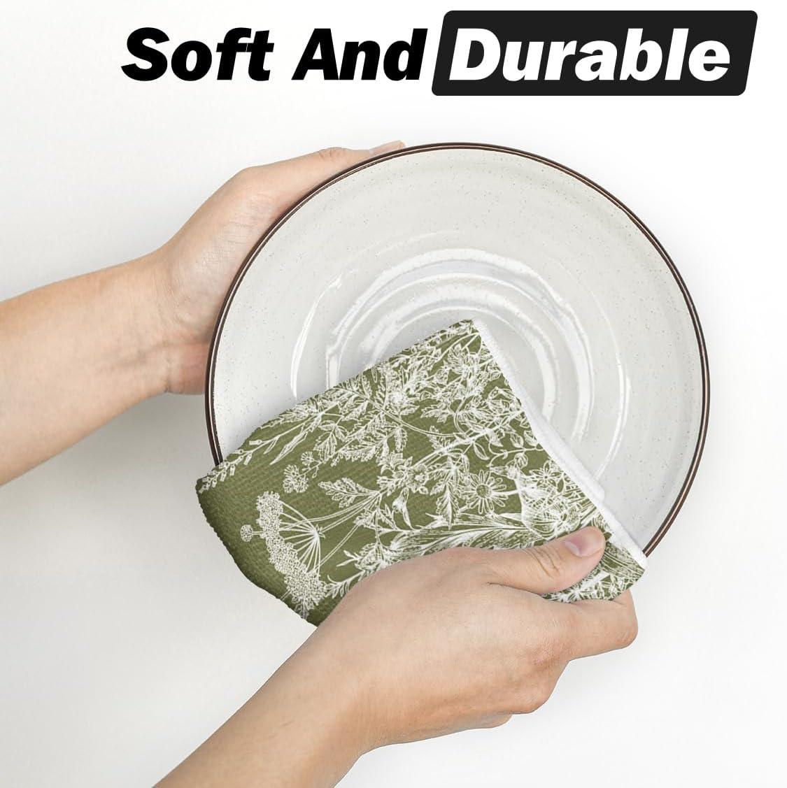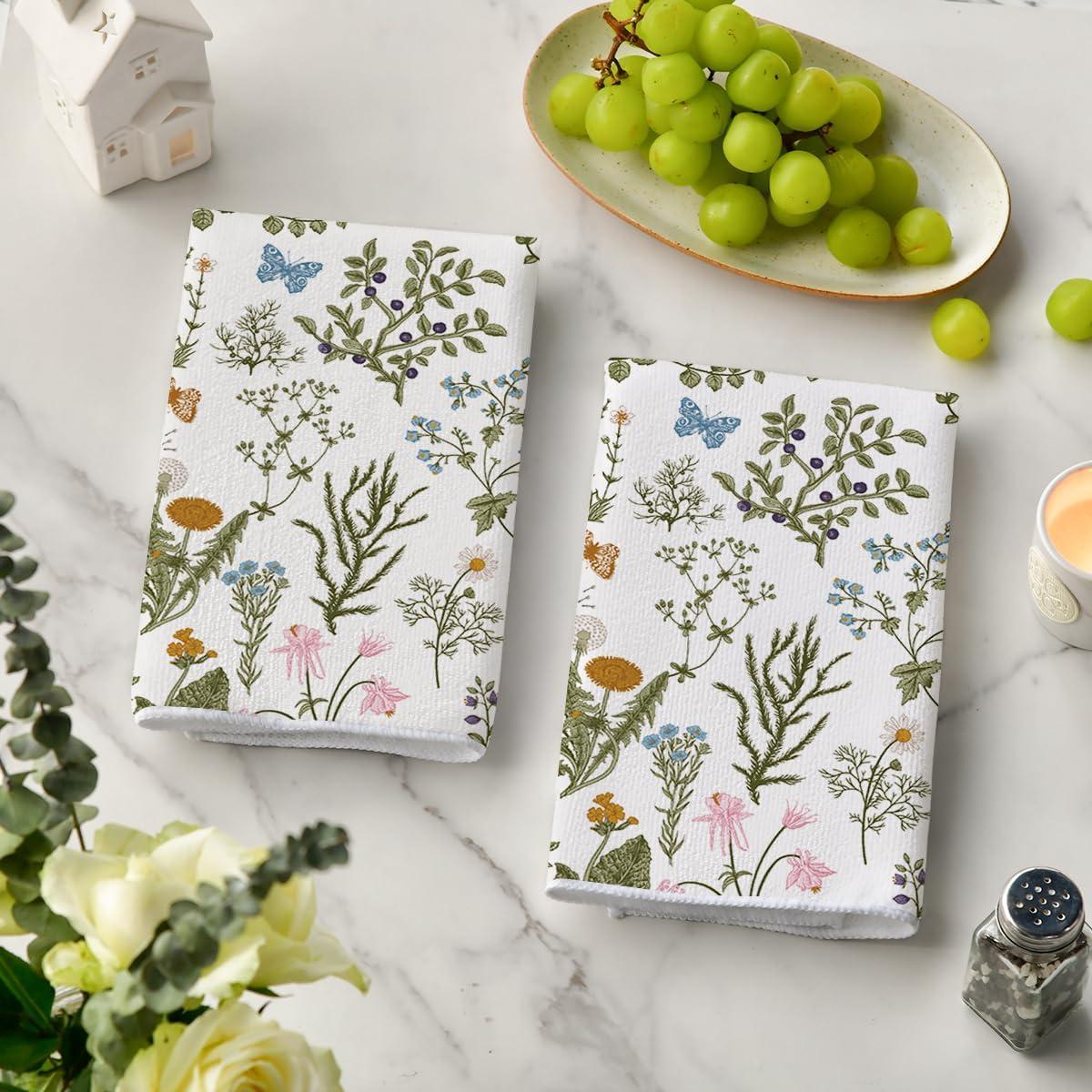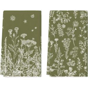 Artoid Mode Wildflower Floral Kitchen Towels Dish Towels, 18×26 Inch Leaves Holiday Decoration Hand Towels Set of 2(Green)