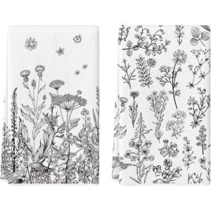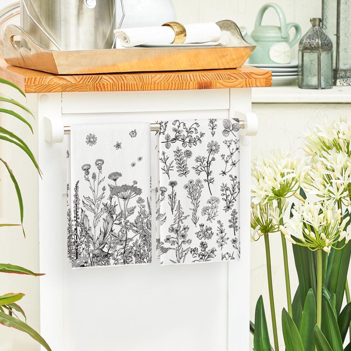 Artoid Mode Wildflower Floral Kitchen Towels Dish Towels, 18×26 Inch Leaves Holiday Decoration Hand Towels Set of 2(Grey)