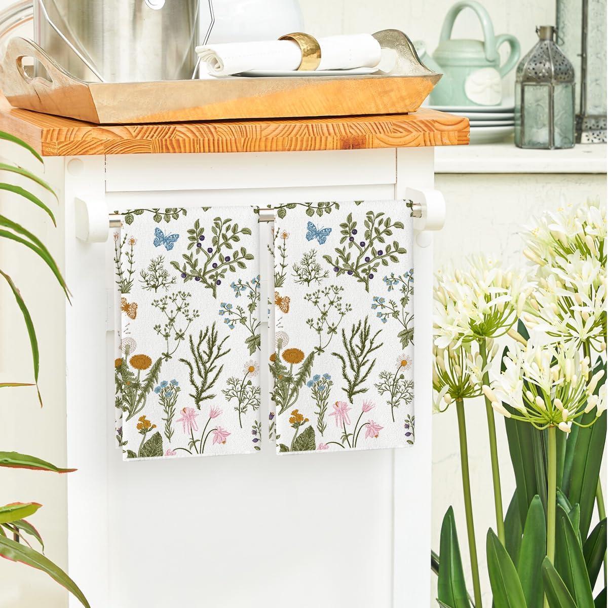 Artoid Mode Floral Leaves Butterfly Spring Kitchen Towels Dish Towels, 18×26 Inch Seasonal Summer Decoration Hand Towels Set of 2