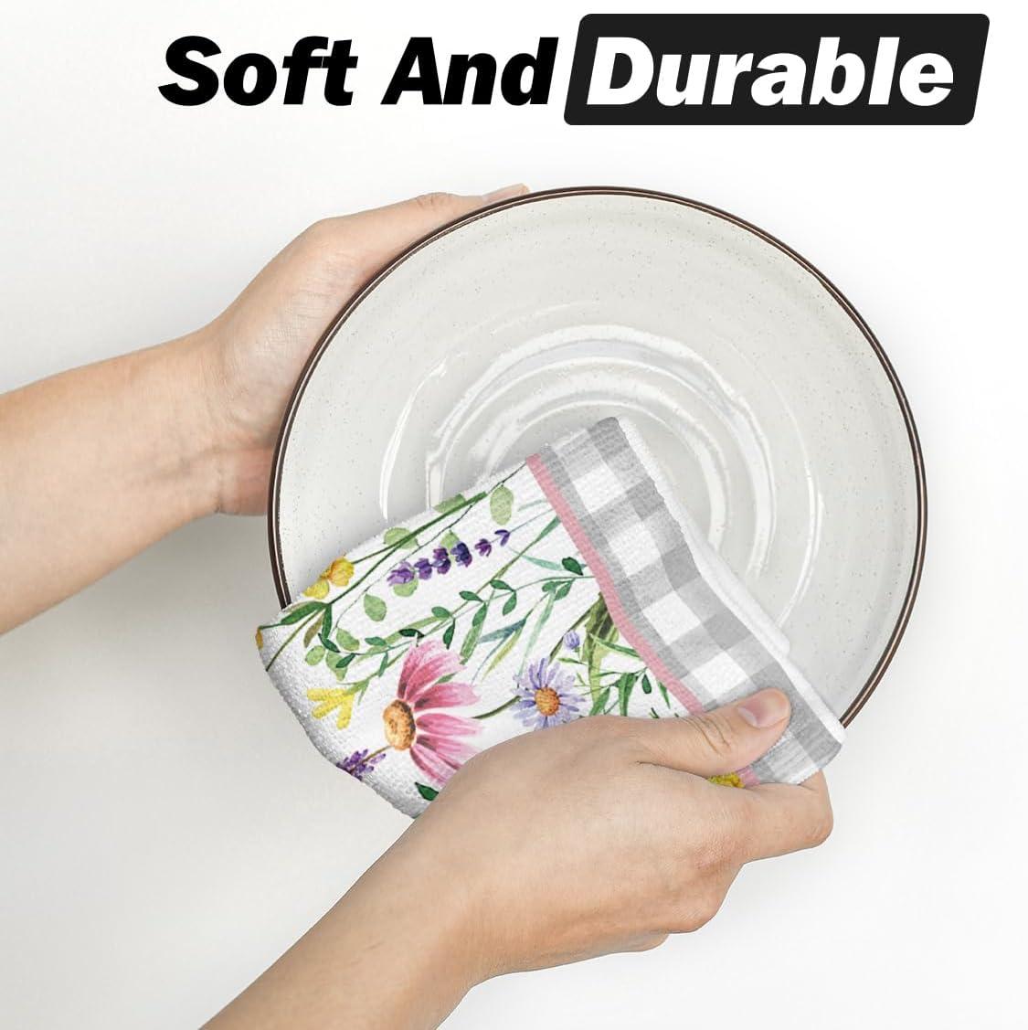 Artoid Mode Buffalo Plaid Wildflower Bloom Vase Spring Kitchen Towels Dish Towels, 18×26 Inch Farmhouse Summer Floral Decoration Hand Towels Set of 2