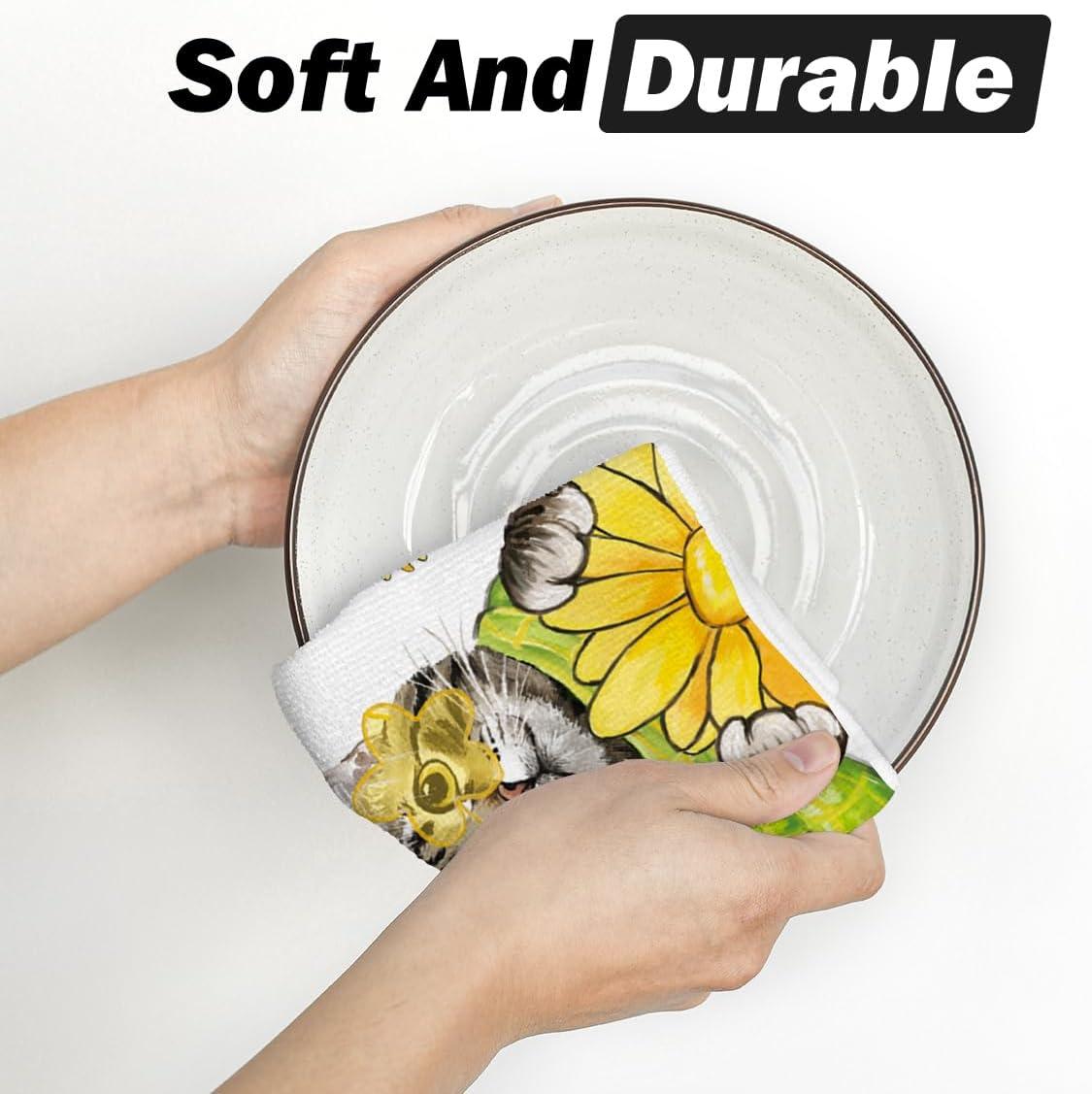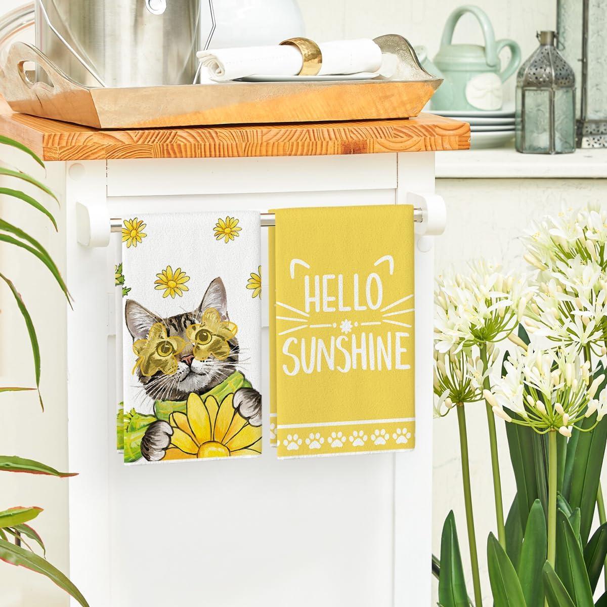 Artoid Mode Yellow Flowers Cat Hello Sunshine Kitchen Towels Dish Towels, 18×26 Inch Spring Summer Holiday Decoration Hand Towels Set of 2