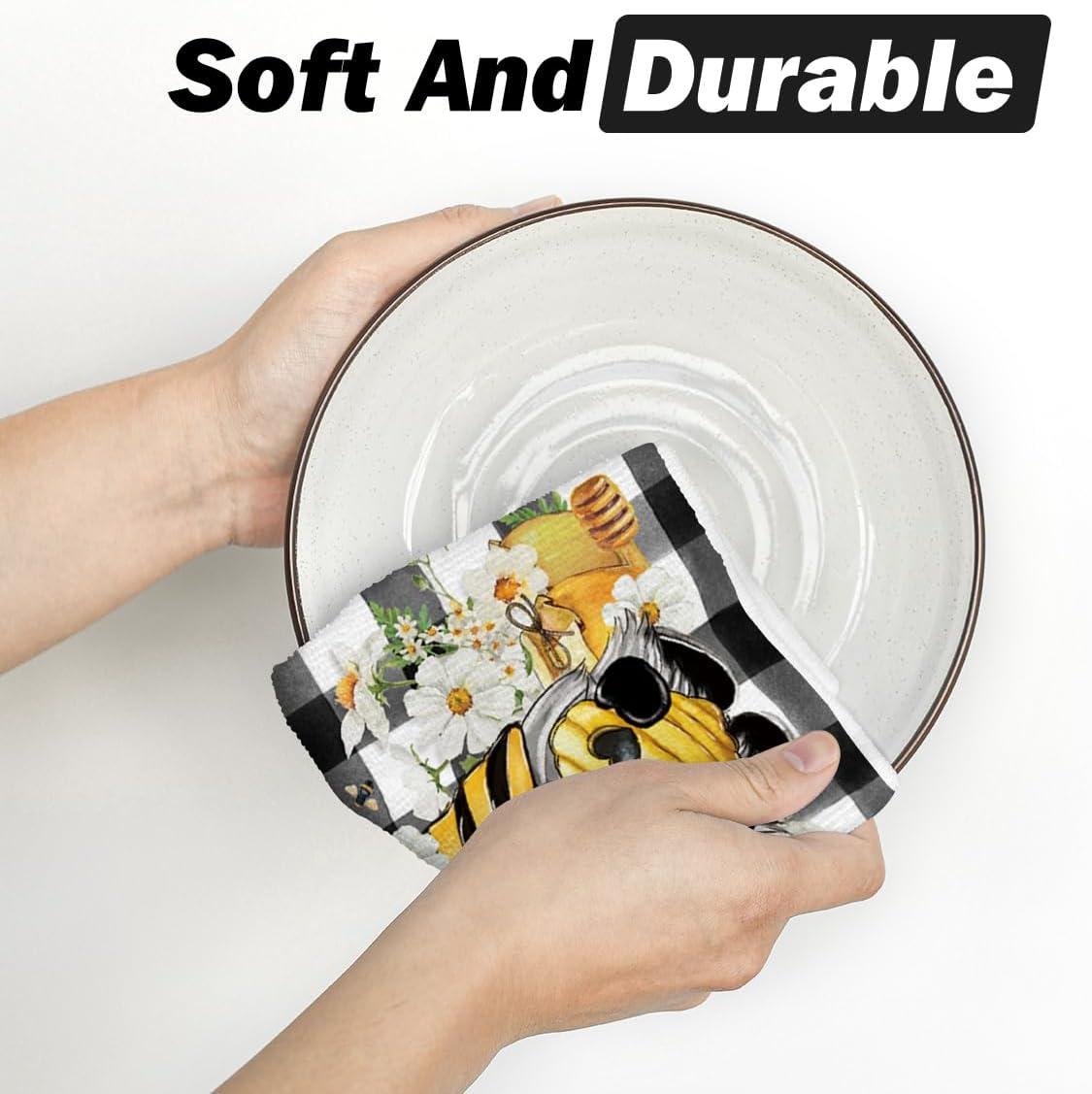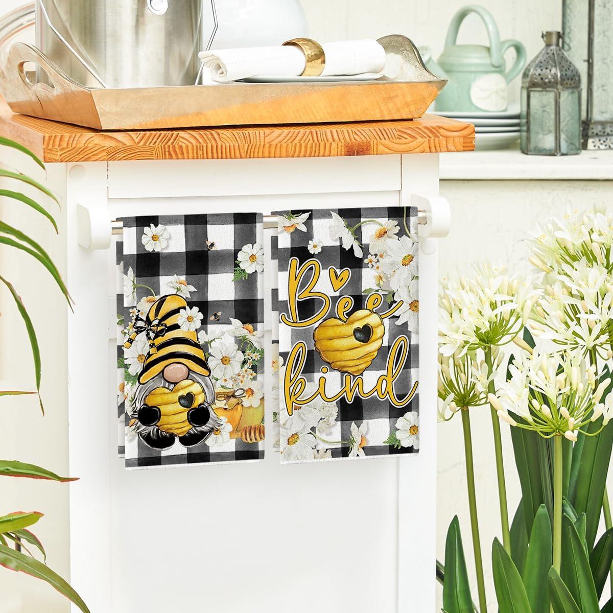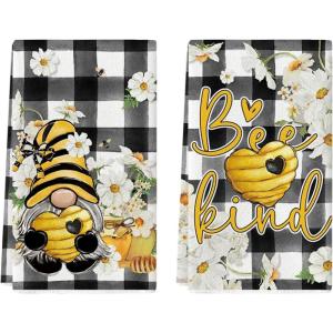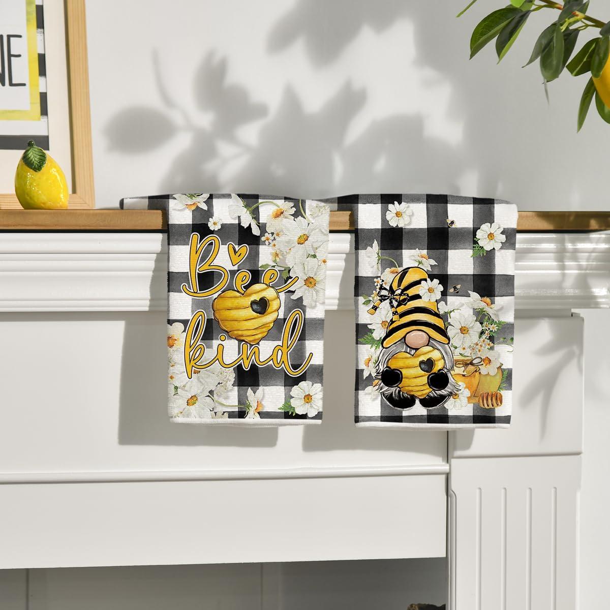 Artoid Mode Buffalo Plaid Gnome Bee Summer Kitchen Towels Dish Towels, 18×26 Inch Seasonal Summer Decoration Hand Towels Set of 2