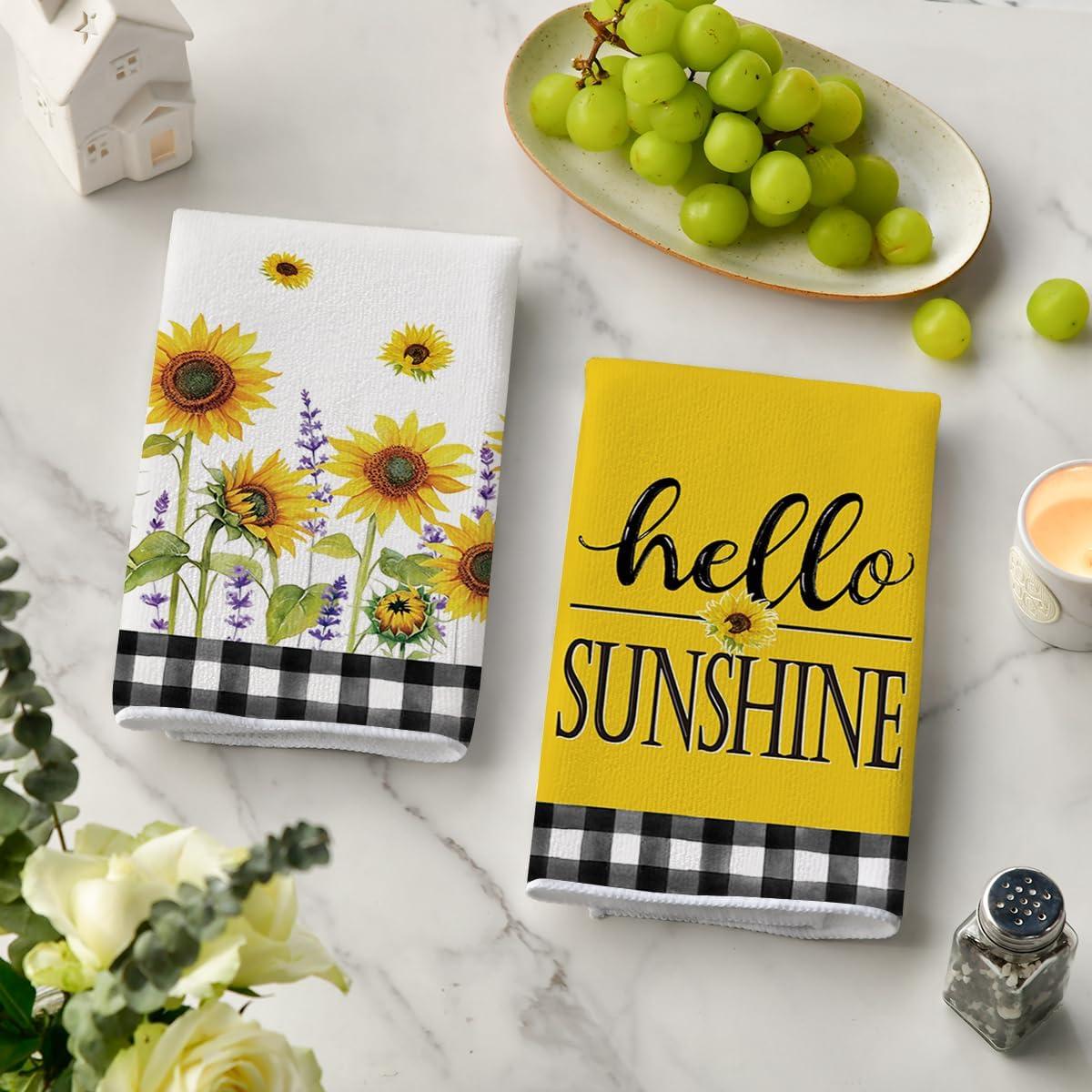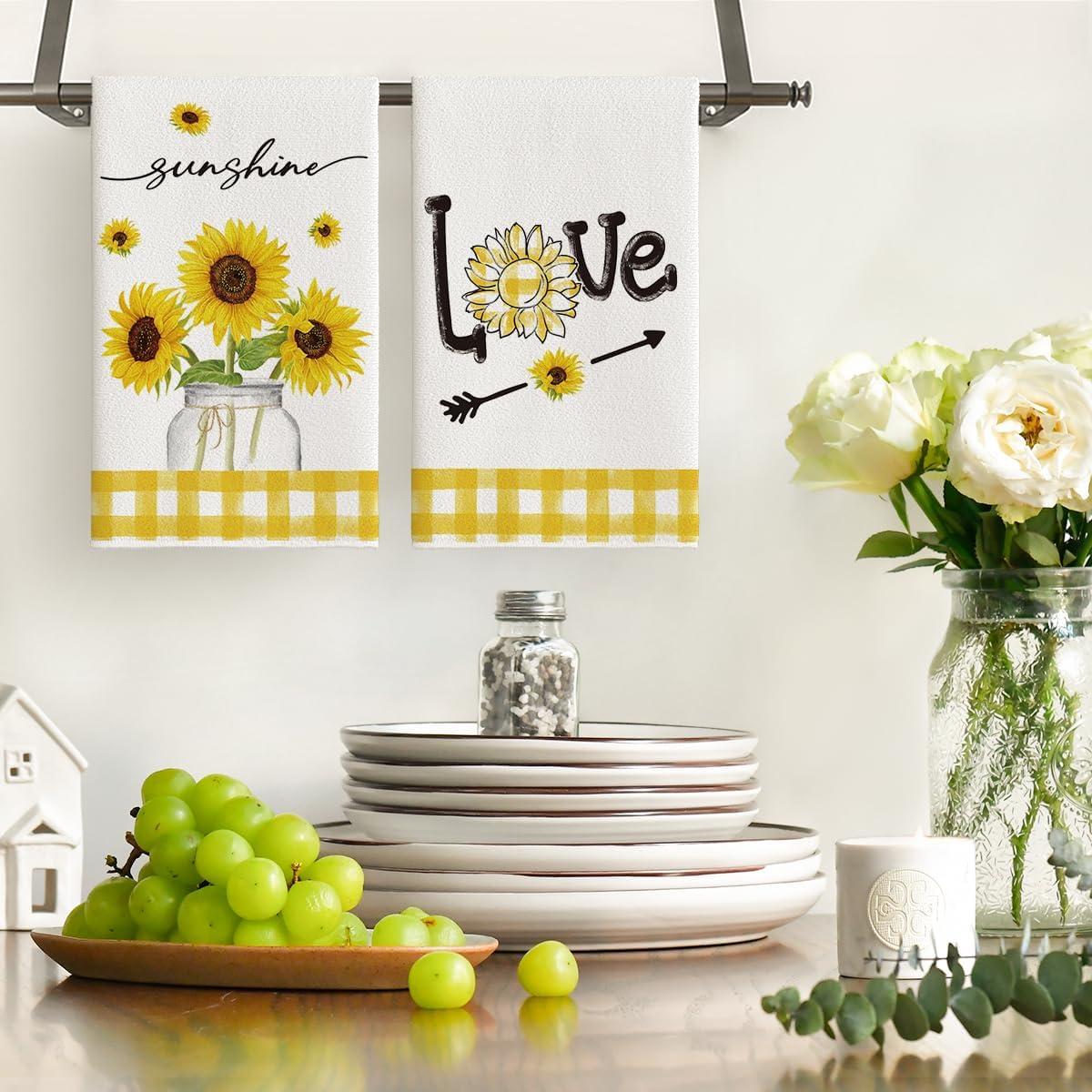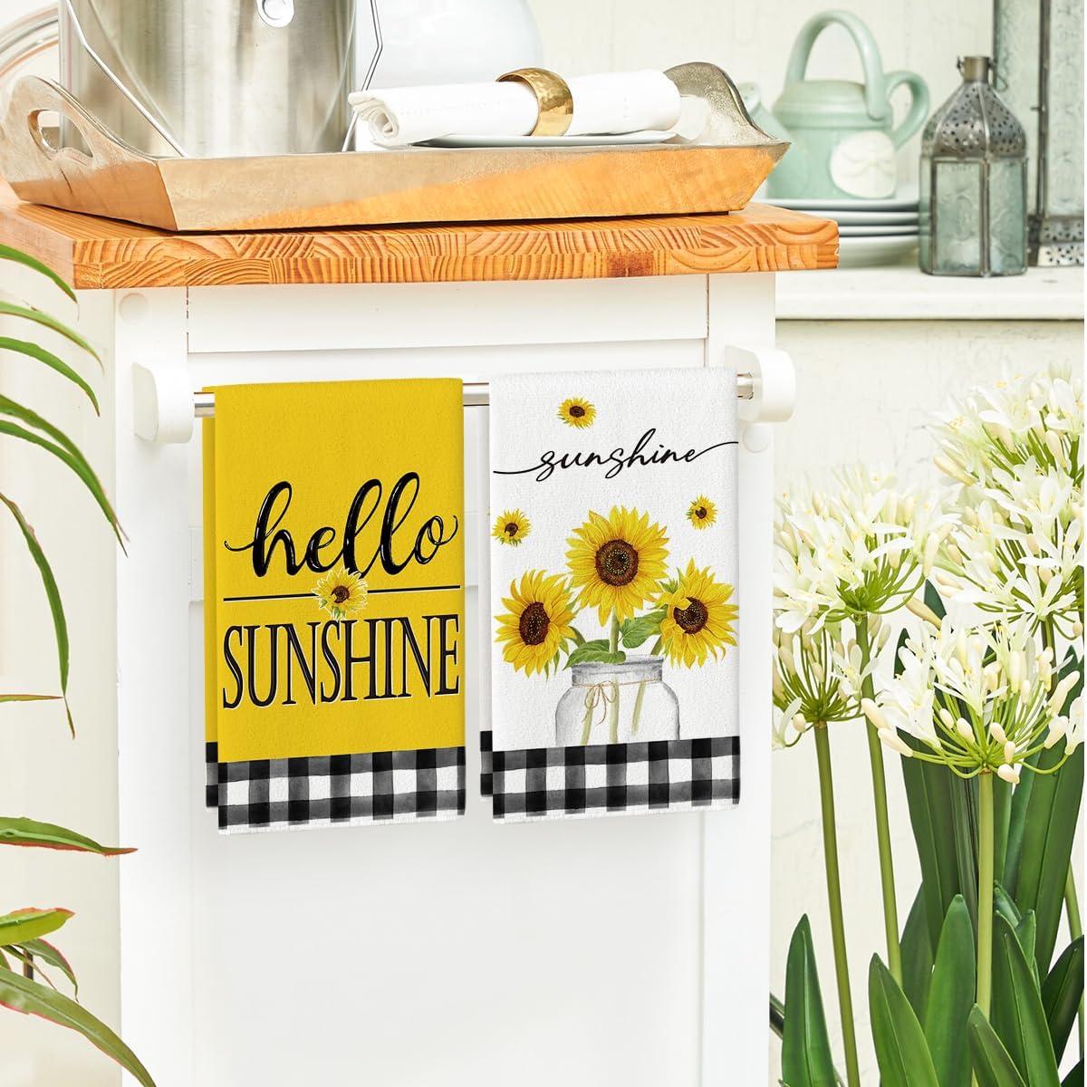 Artoid Mode Buffalo Plaid Hello Sunshine Sunflowers Love Summer Kitchen Towels Dish Towels, 18×26 Inch Farmhouse Decoration Hand Towels Set of 4(Yellow/White)