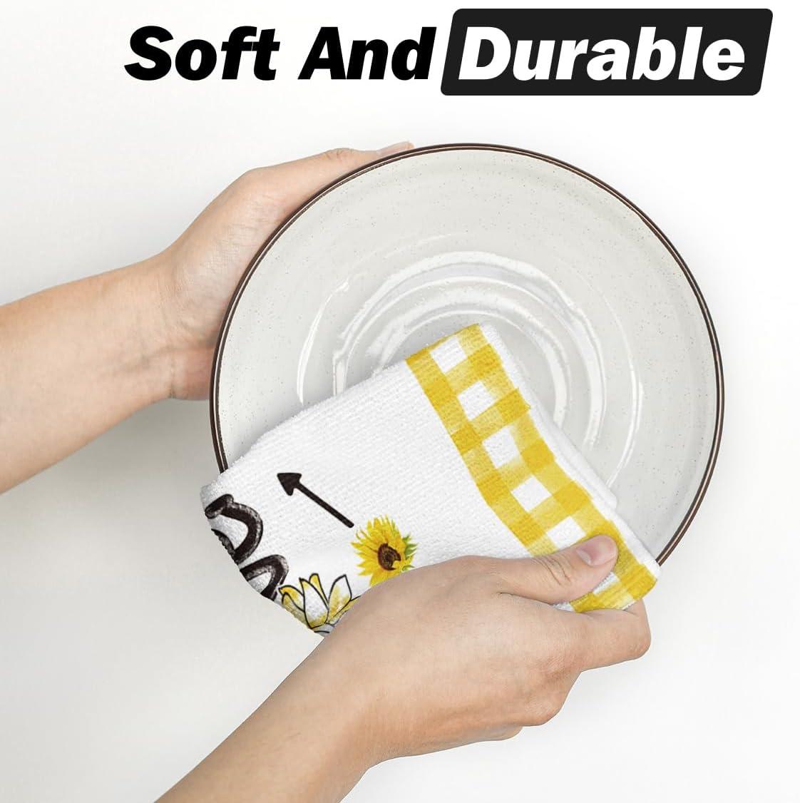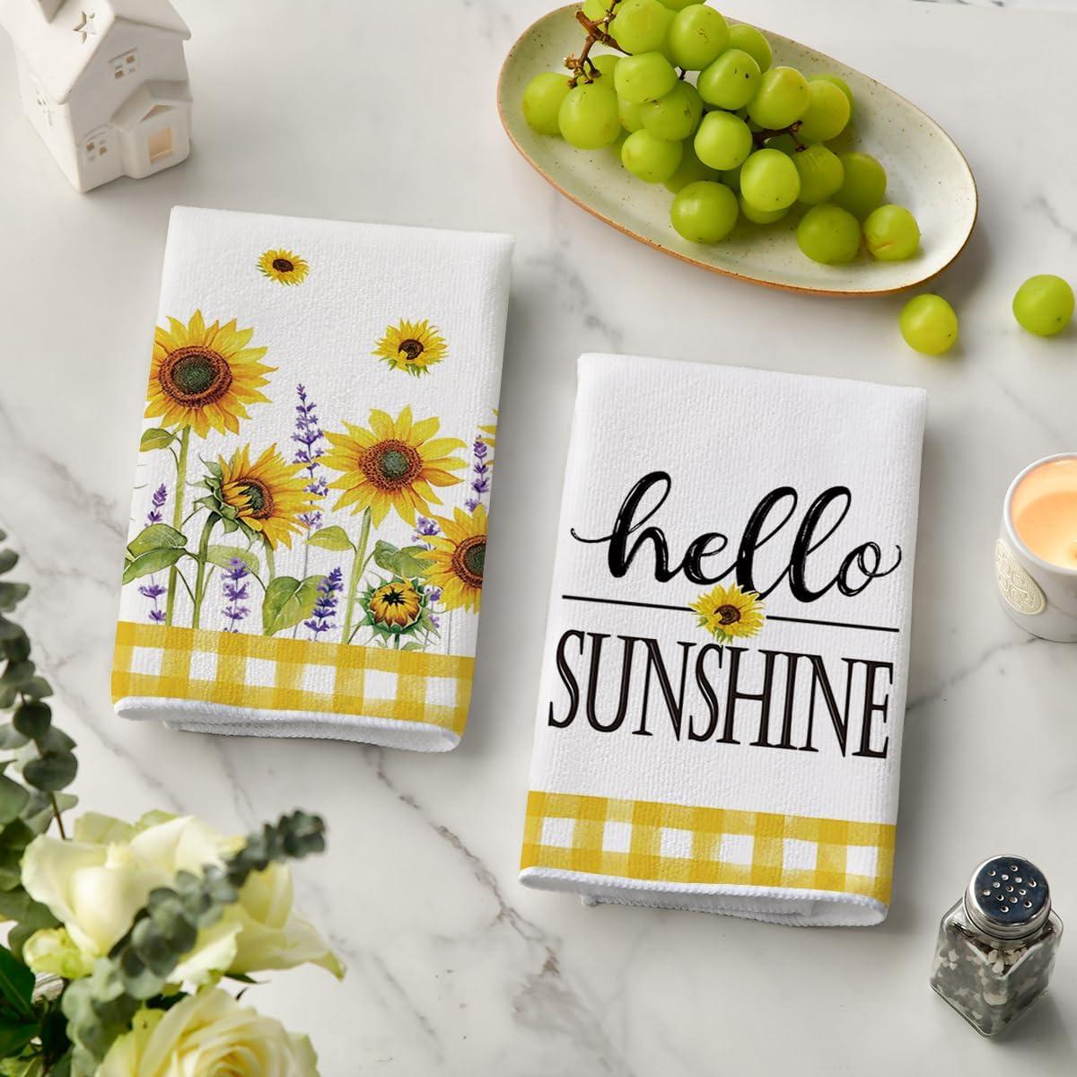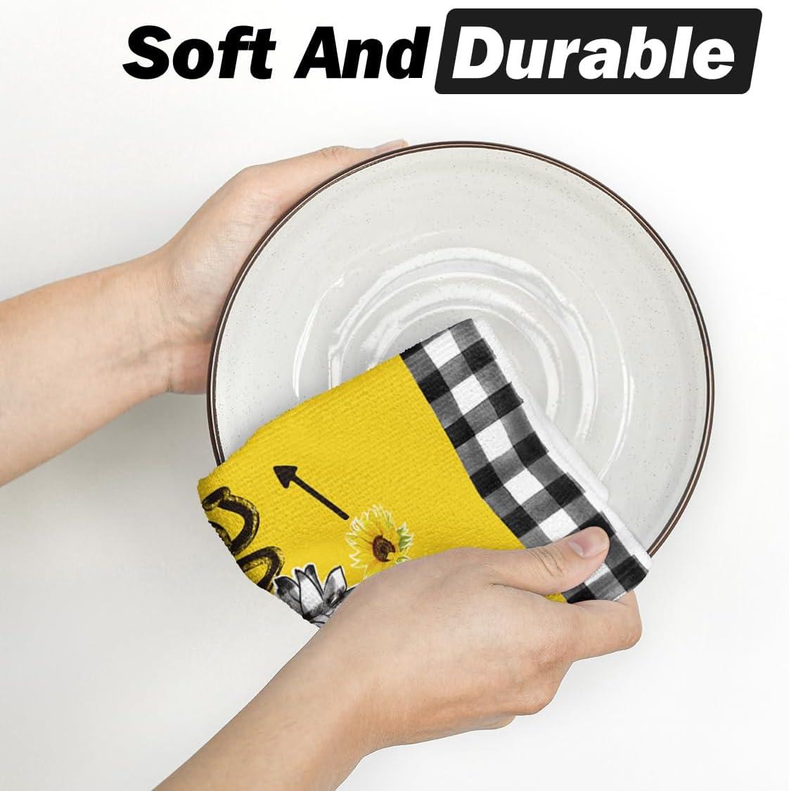 Artoid Mode Buffalo Plaid Hello Sunshine Sunflowers Love Summer Kitchen Towels Dish Towels, 18×26 Inch Farmhouse Decoration Hand Towels Set of 4(Yellow/White)