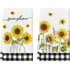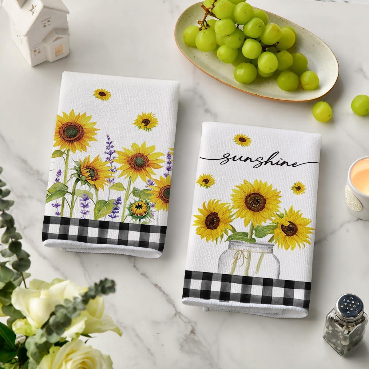 Artoid Mode Buffalo Plaid Sunflowers Sunshine Summer Kitchen Towels Dish Towels, 18×26 Inch Farmhouse Summer Decoration Hand Towels Set of 2(Black/White)