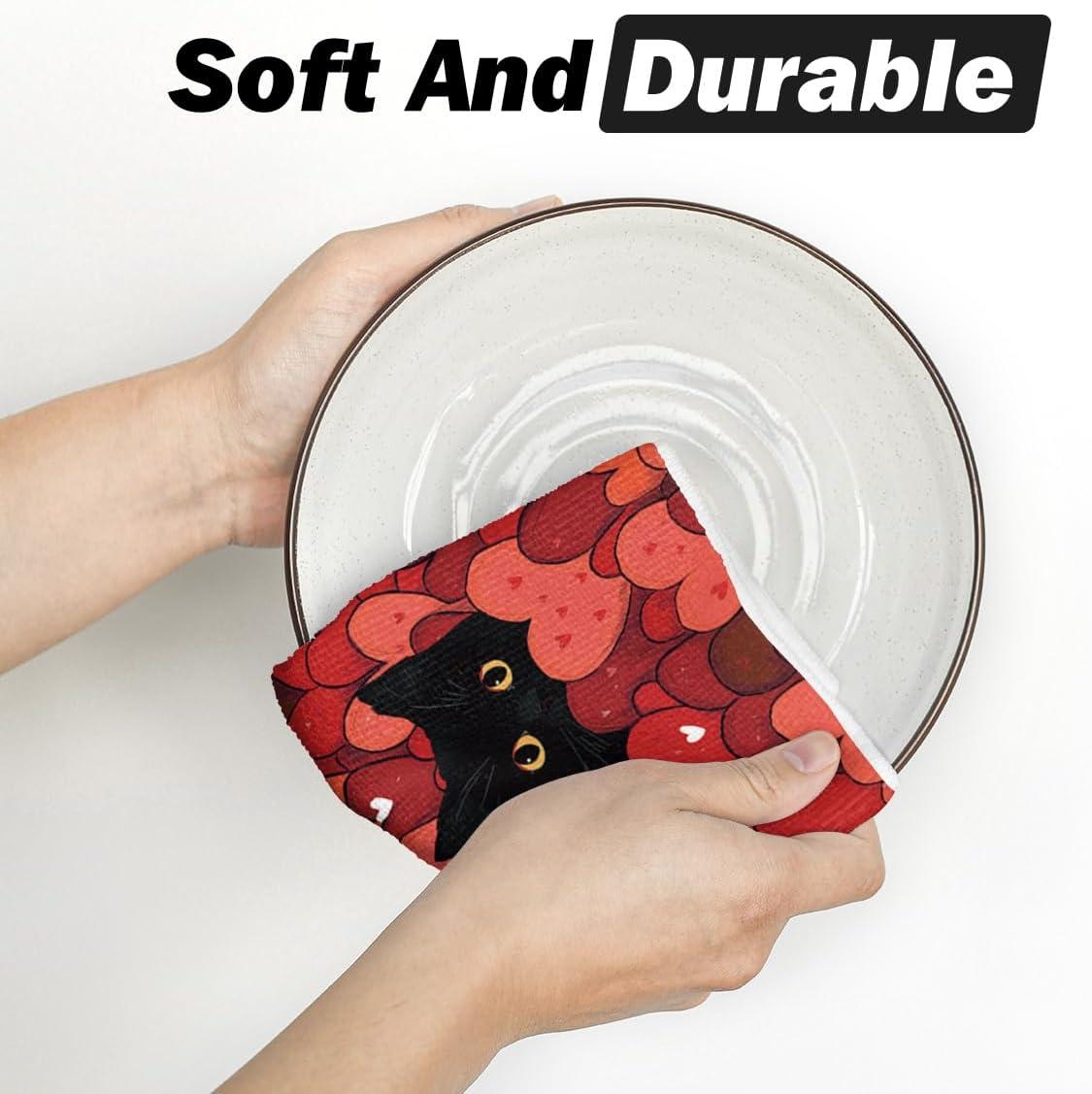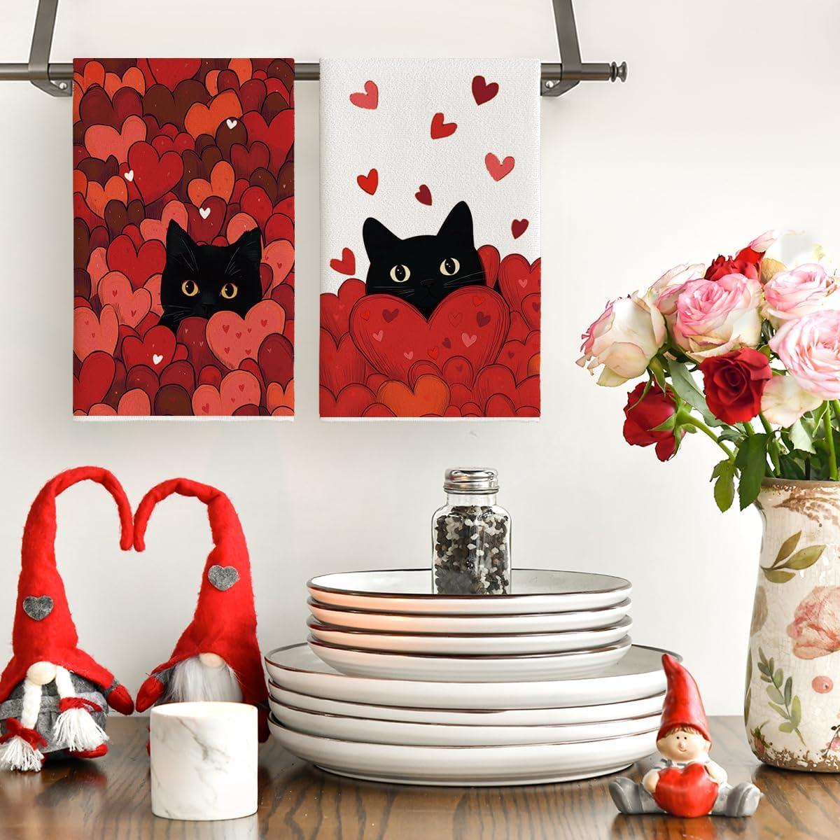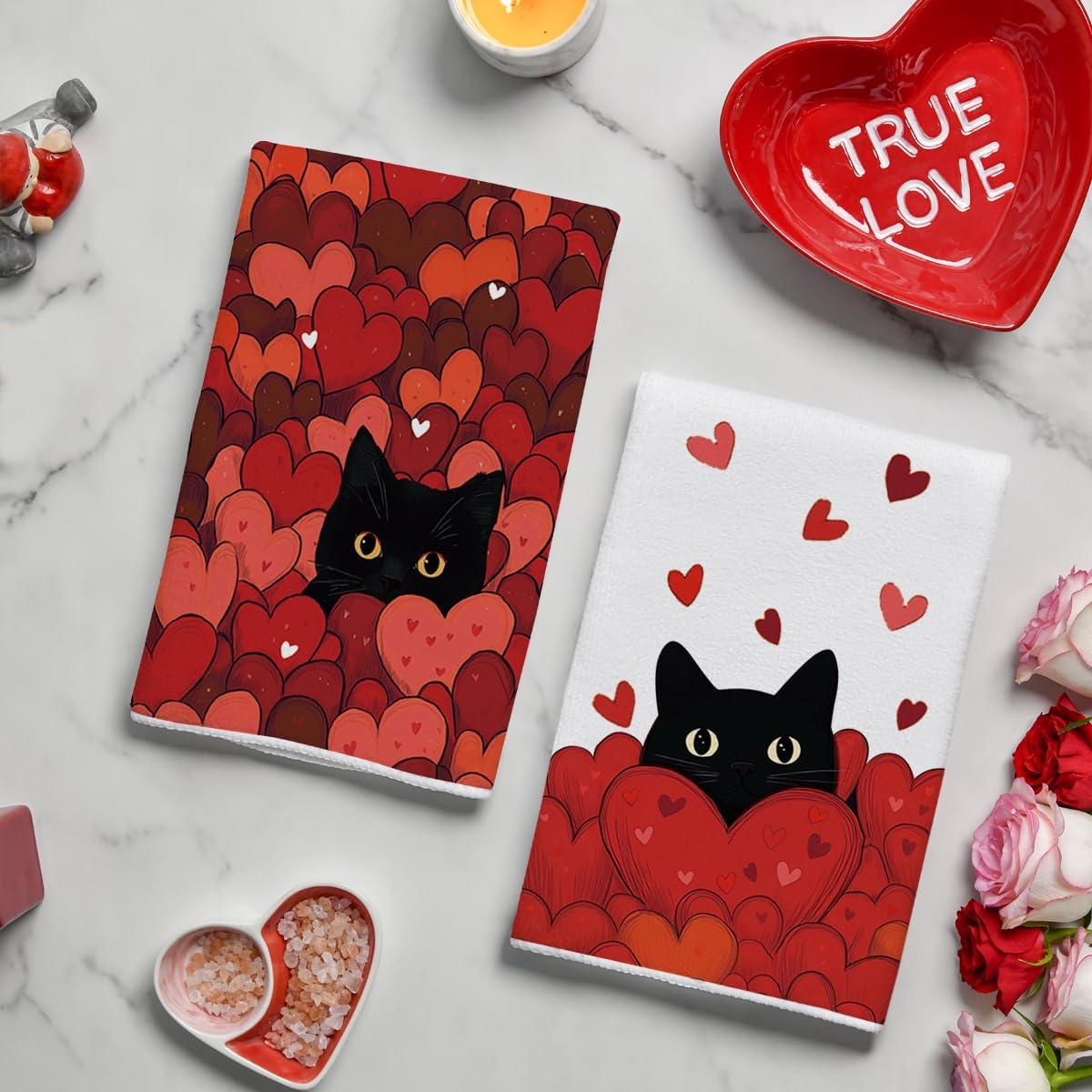 Artoid Mode Black Cats Red Hearts Valentine’s Kitchen Towels Dish Towels, 18×26 Inch Wedding Farmhouse Decoration Hand Towels Set of 2(Red)