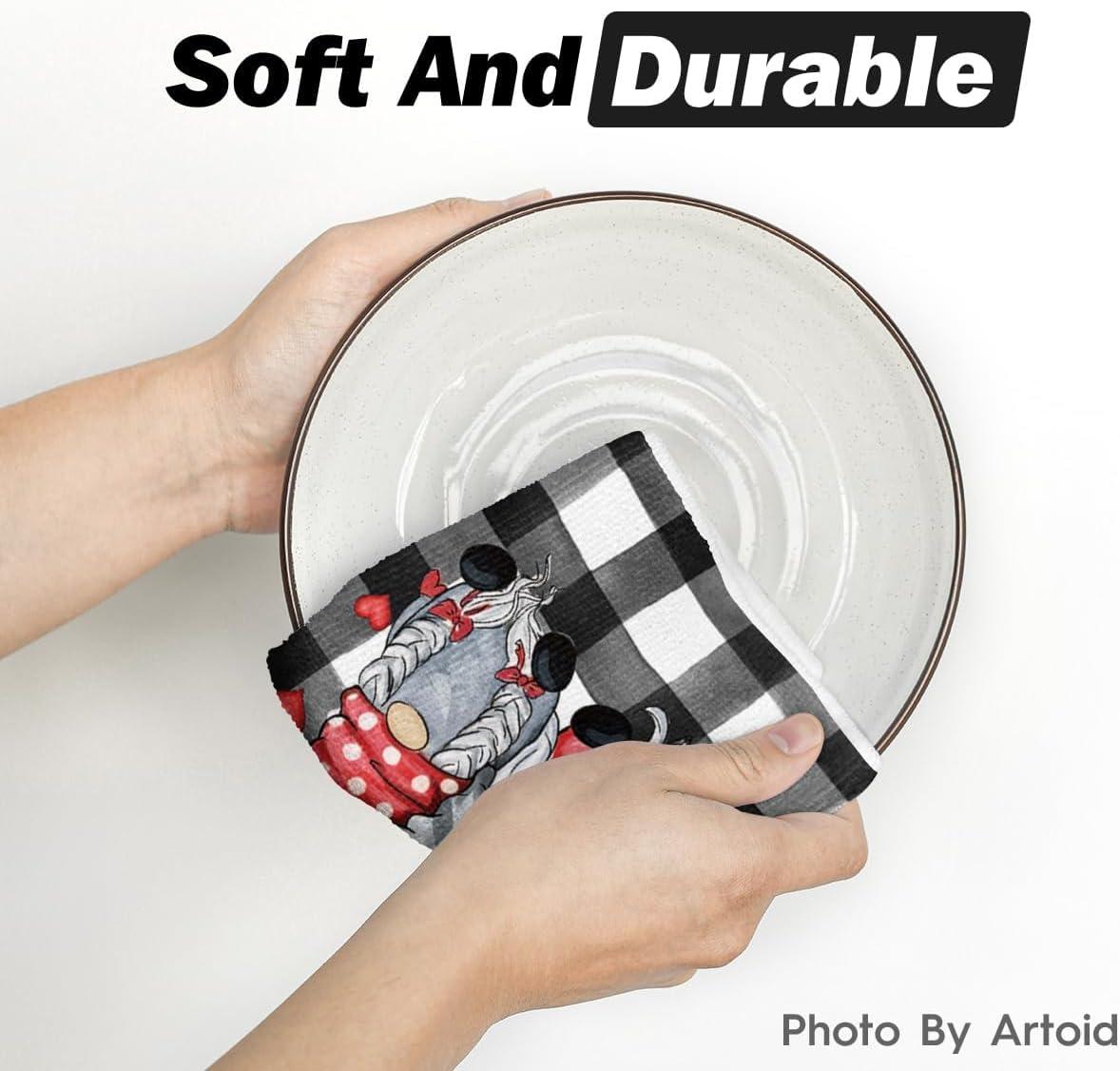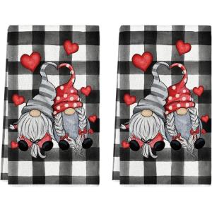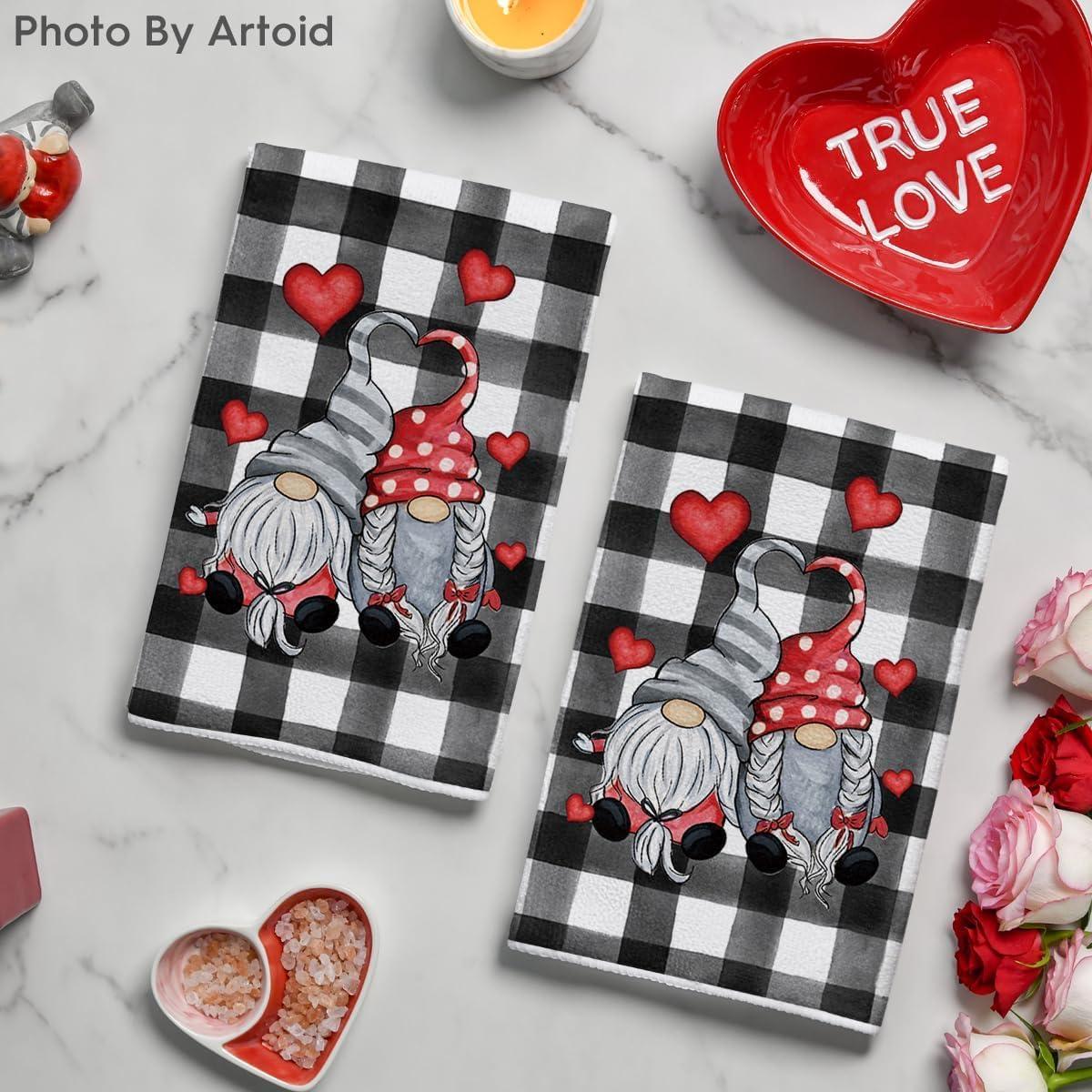 Artoid Mode Buffalo Plaid Gnomes Love Valentine’s Kitchen Towels Dish Towels, 18×26 Inch Anniversary Wedding Decoration Hand Towels Set of 2(Black/White)