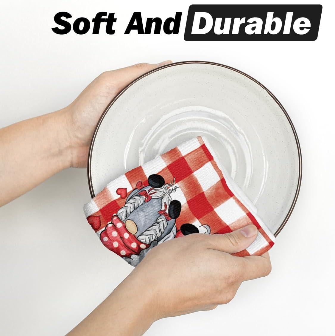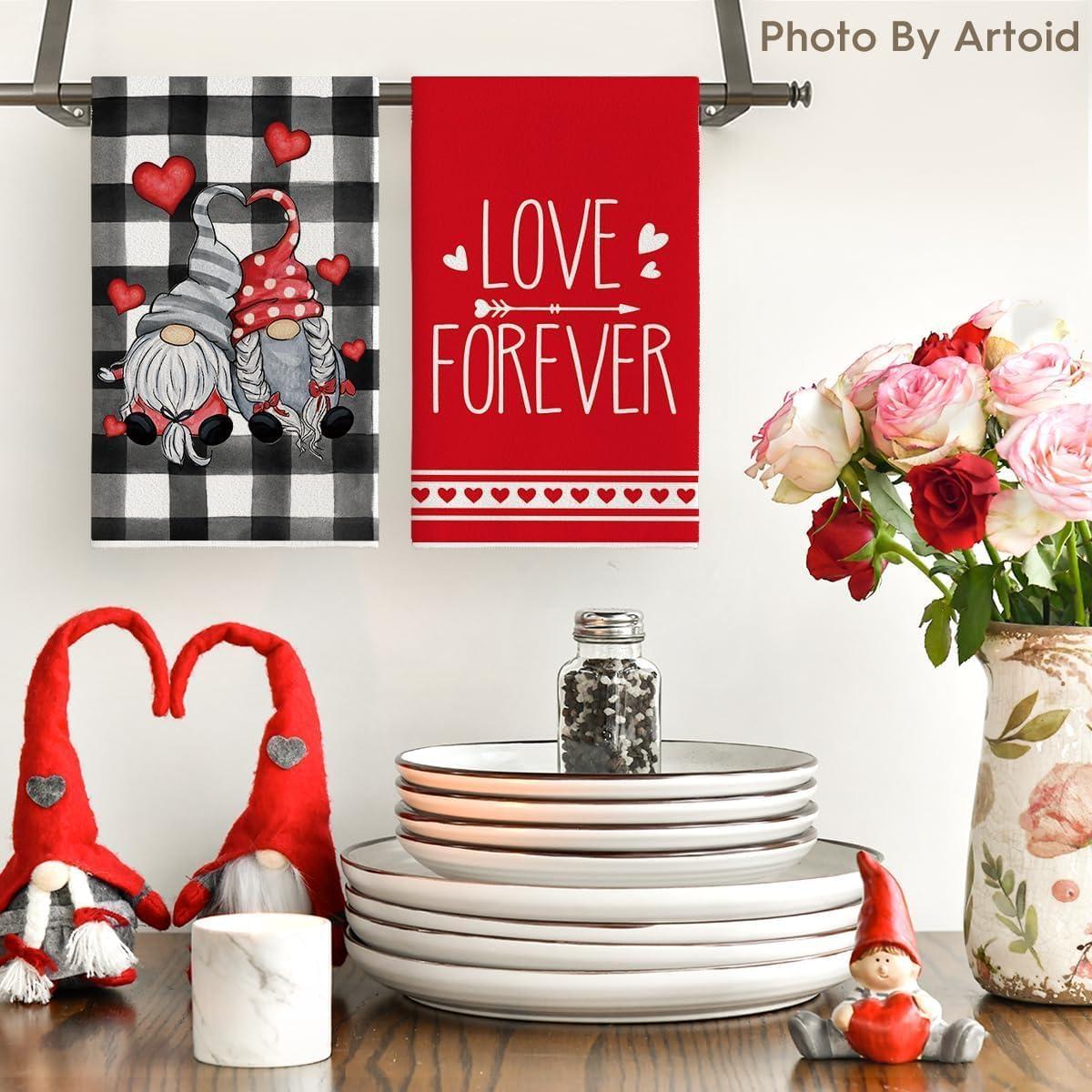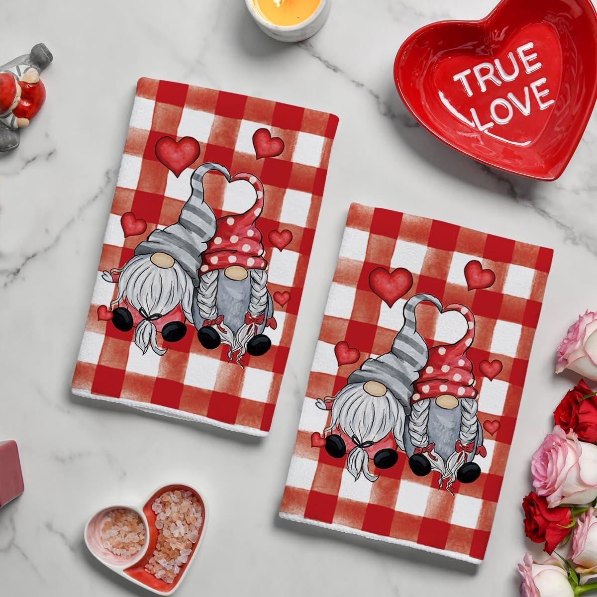 Artoid Mode Buffalo Plaid Gnomes Love Valentine’s Kitchen Towels Dish Towels, 18×26 Inch Anniversary Wedding Decoration Hand Towels Set of 2(Red/Black)