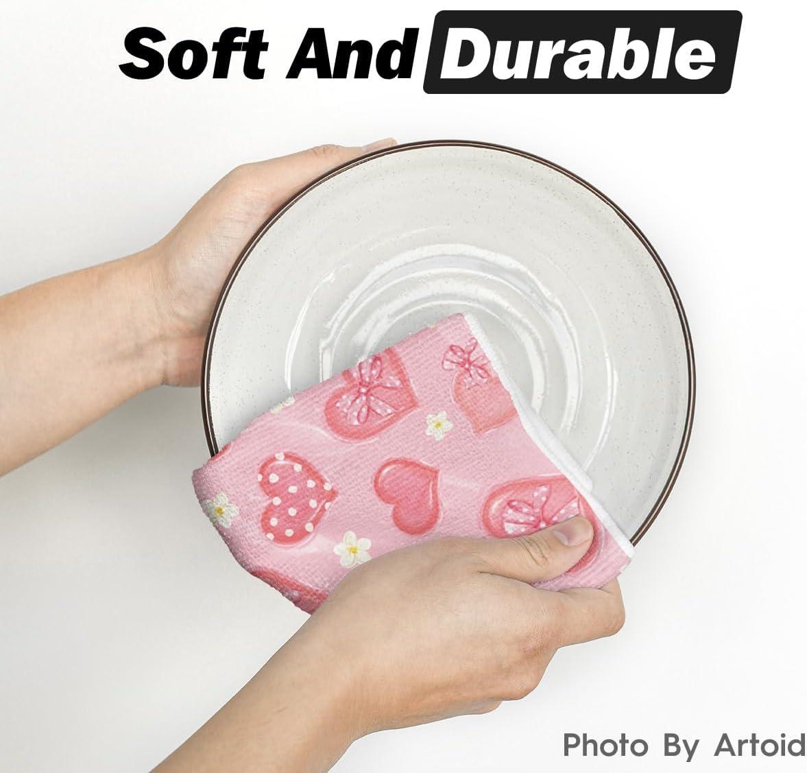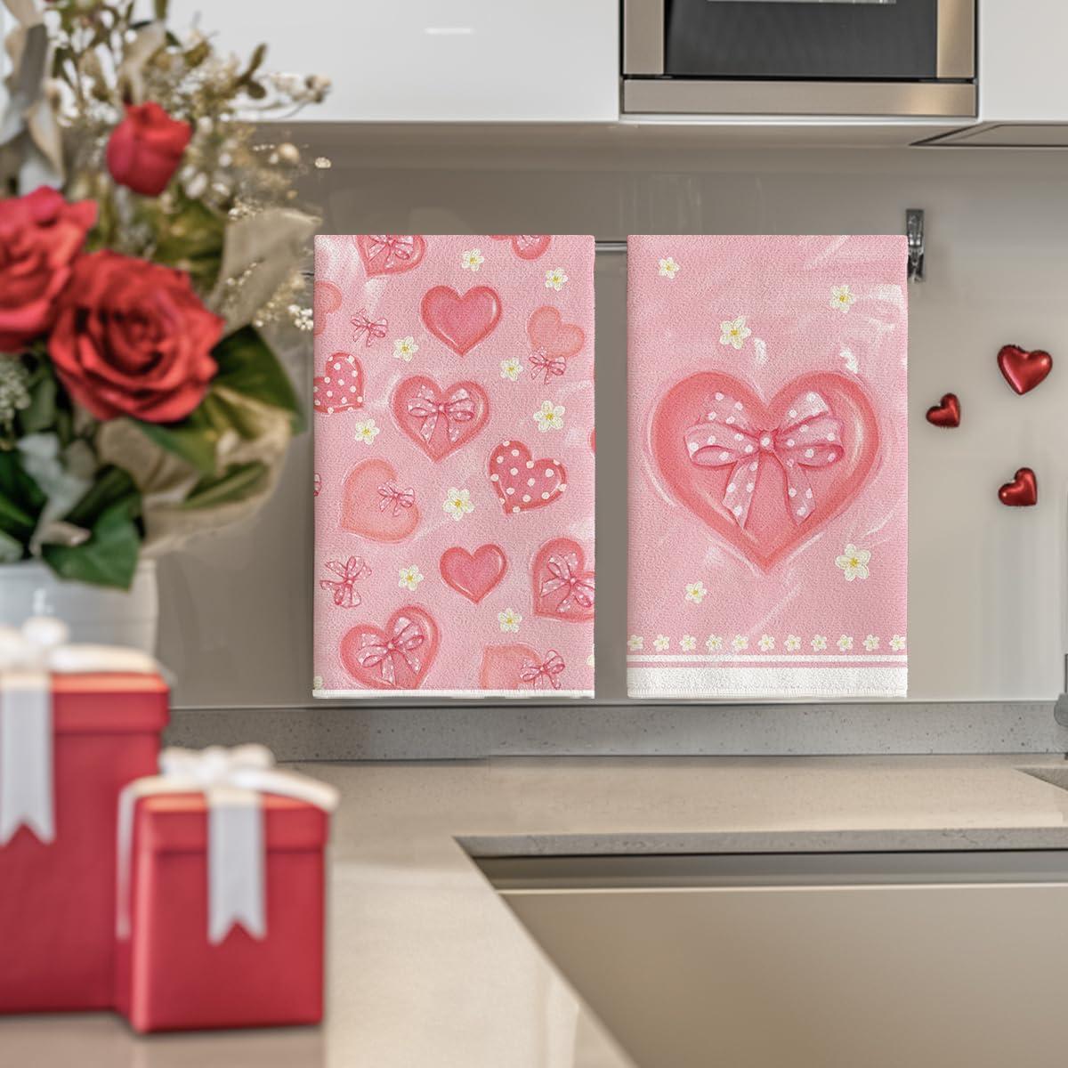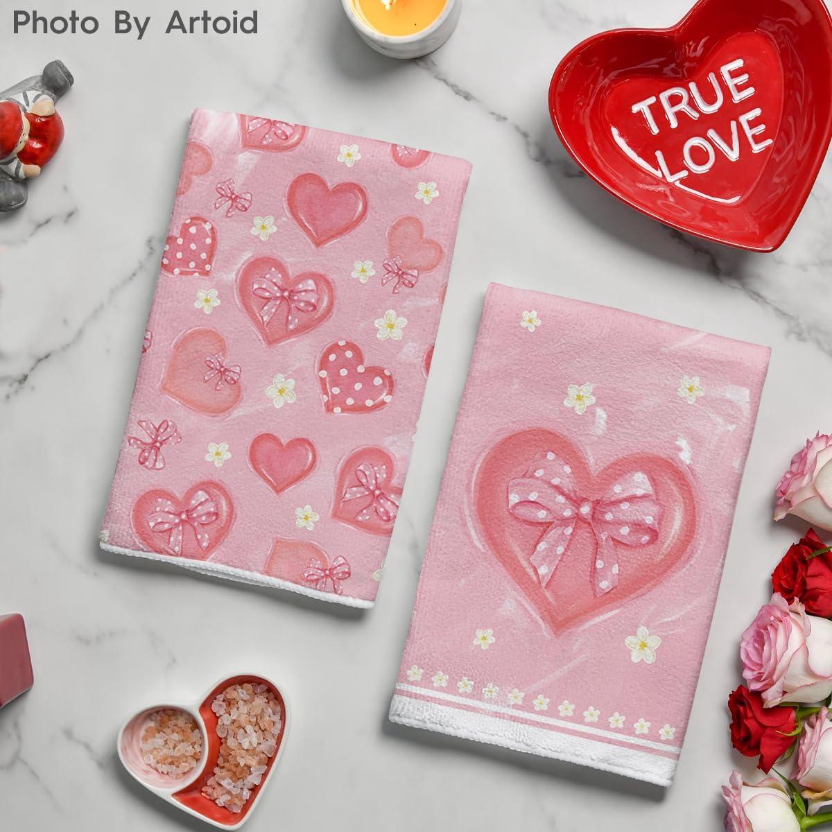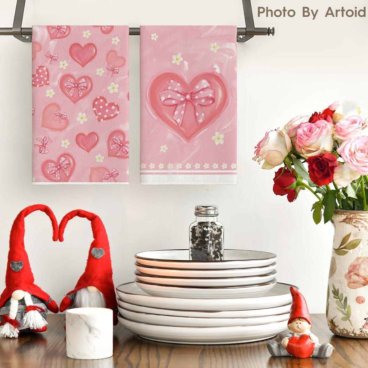 Artoid Mode Pink Bow Tie Heart Flower Valentine’s Kitchen Towels Dish Towels, 18×26 Inch Farmhouse Wedding Decoration Hand Towels Set of 2