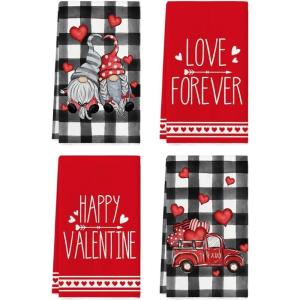 Artoid Mode Buffalo Plaid Gnomes Truck Hello Valentine Kitchen Towels Dish Towels, 18×26 Inch Seasonal Valentine’s Day Decoration Hand Towels Set of 4(Red)
