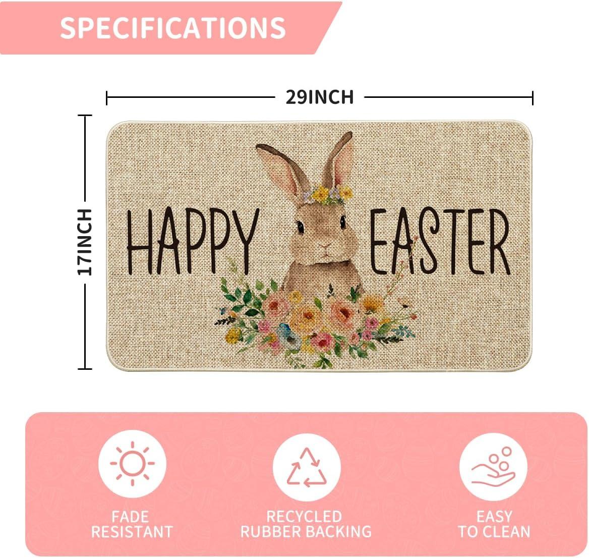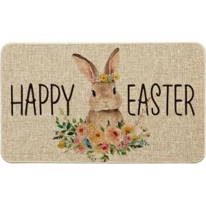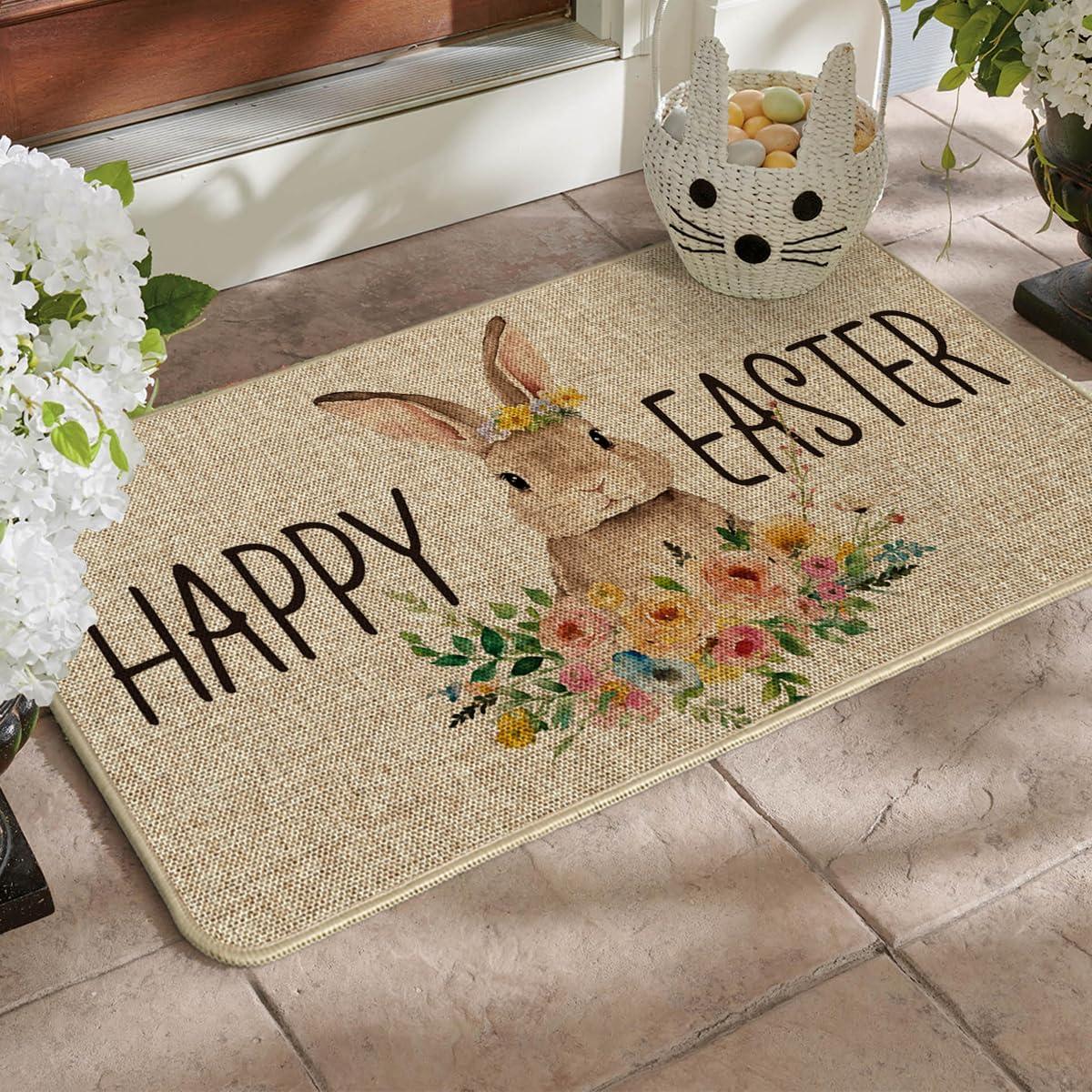 Artoid Mode Cute Rabbit Flowers Happy Easter Welcome Decorative Doormat, Seasonal Spring Low-Profile Rug Switch Mat for Indoor Outdoor 17×29 Inch