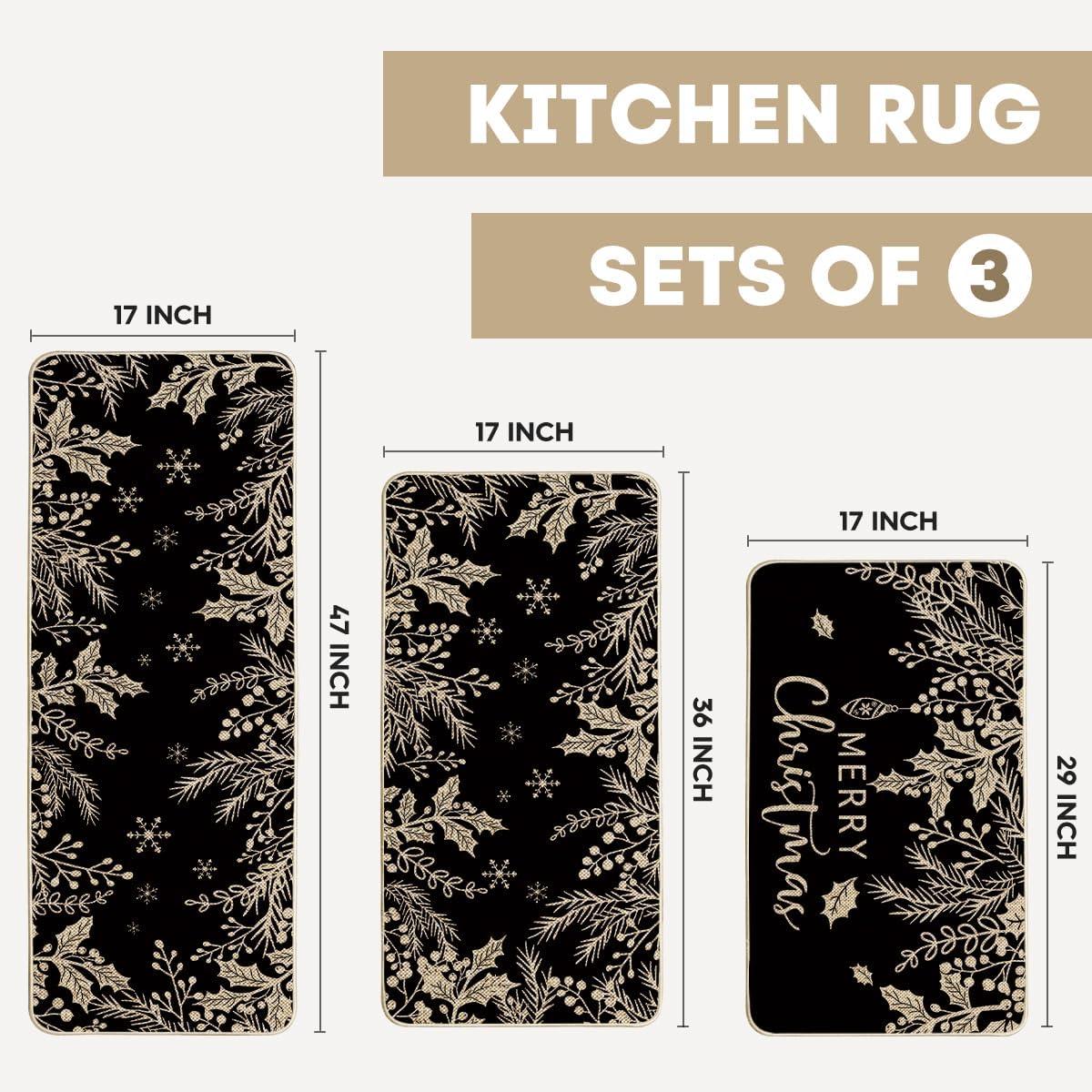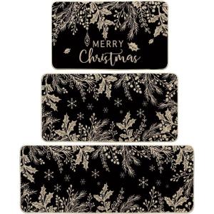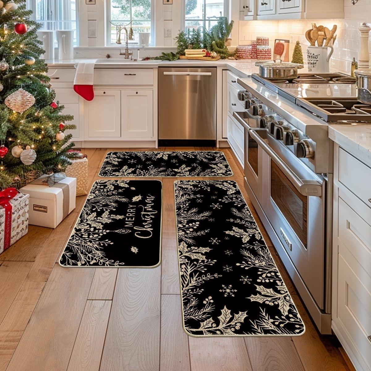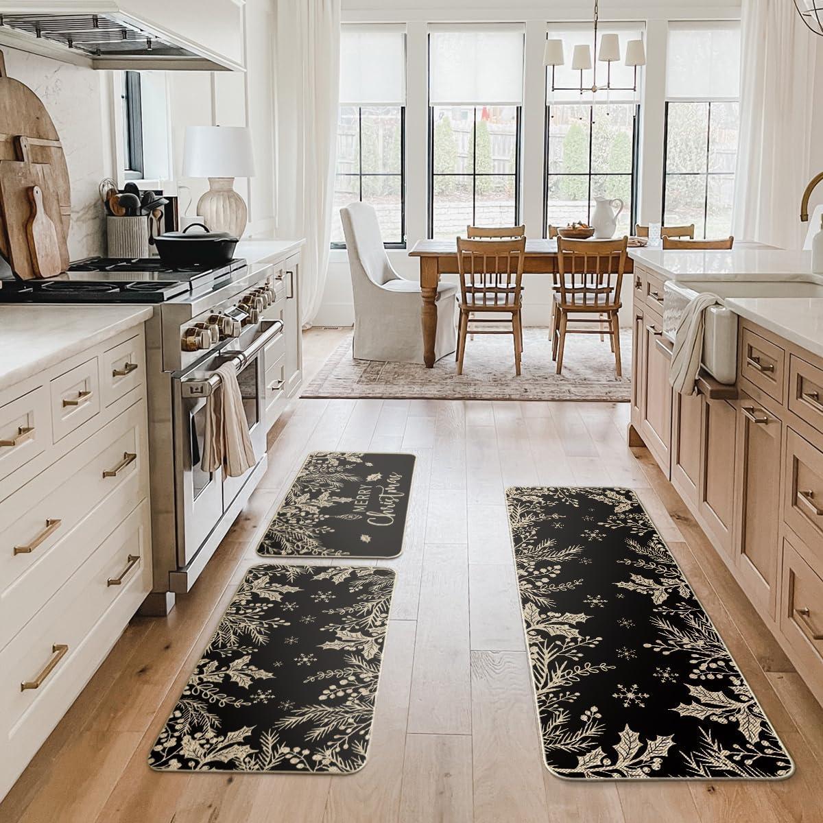 Artoid Mode Black Holly Pine Branches Merry Christmas Kitchen Mats Set of 2, Winter Decor Low-Profile Kitchen Rugs for Floor – 17×29 and 17×47 Inch(Black)