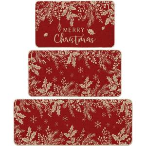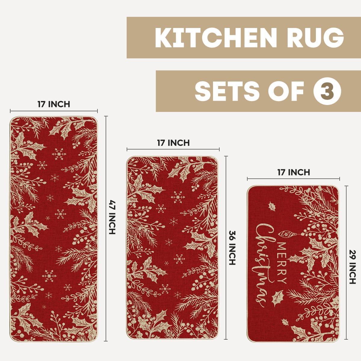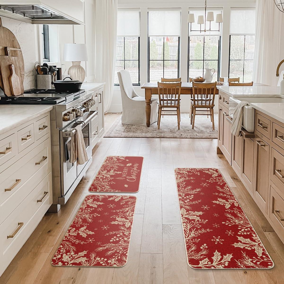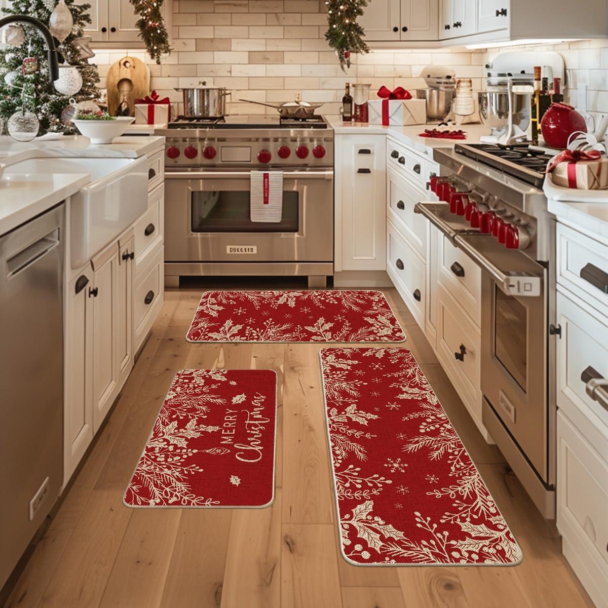 Artoid Mode Black Holly Pine Branches Merry Christmas Kitchen Mats Set of 2, Winter Decor Low-Profile Kitchen Rugs for Floor – 17×29 and 17×47 Inch(Red)