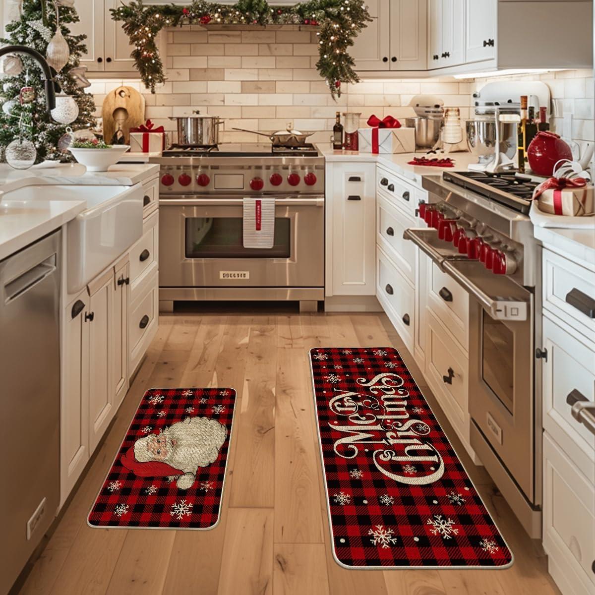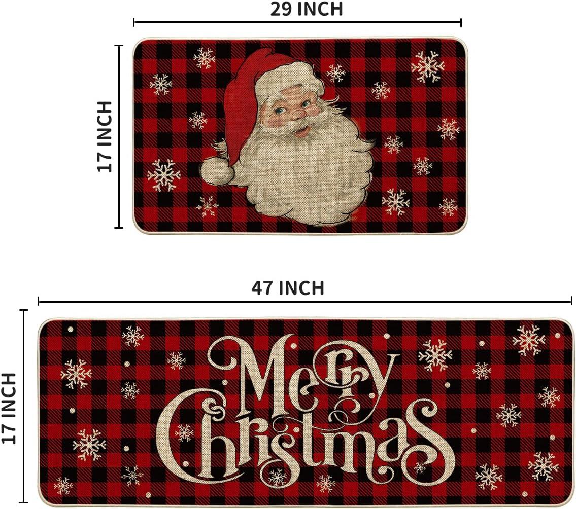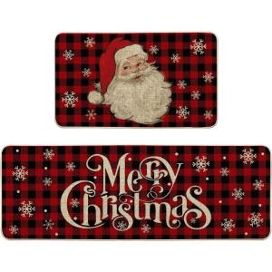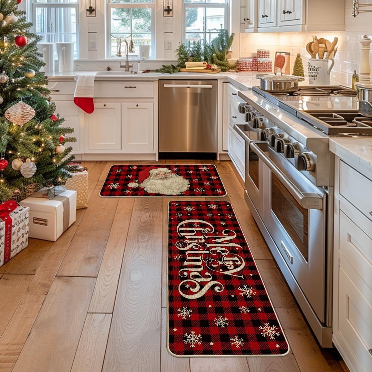 Artoid Mode Buffalo Plaid Snow Santa Claus Christmas Kitchen Rugs Set of 2, Winter Low-Profile Floor Mat Merry Christmas Decorations for Home Kitchen – 17×29 and 17×47 Inch
