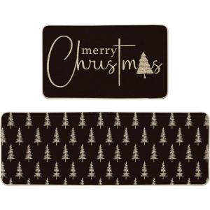 Artoid Mode Black Xmas Tree Merry Christmas Kitchen Mats Set of 2, Winter Home Decor Low-Profile Kitchen Rugs for Floor – 17×29 and 17×47 Inch(Black)