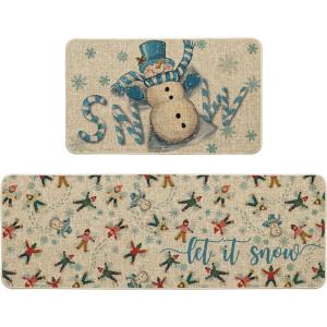 Artoid Mode Blue Candy Cane Snowman Let It Snow Winter Kitchen Mats Set of 2, Christmas Low-Profile Home Decor Kitchen Rugs for Floor – 17×29 and 17×47 Inch(Blue)