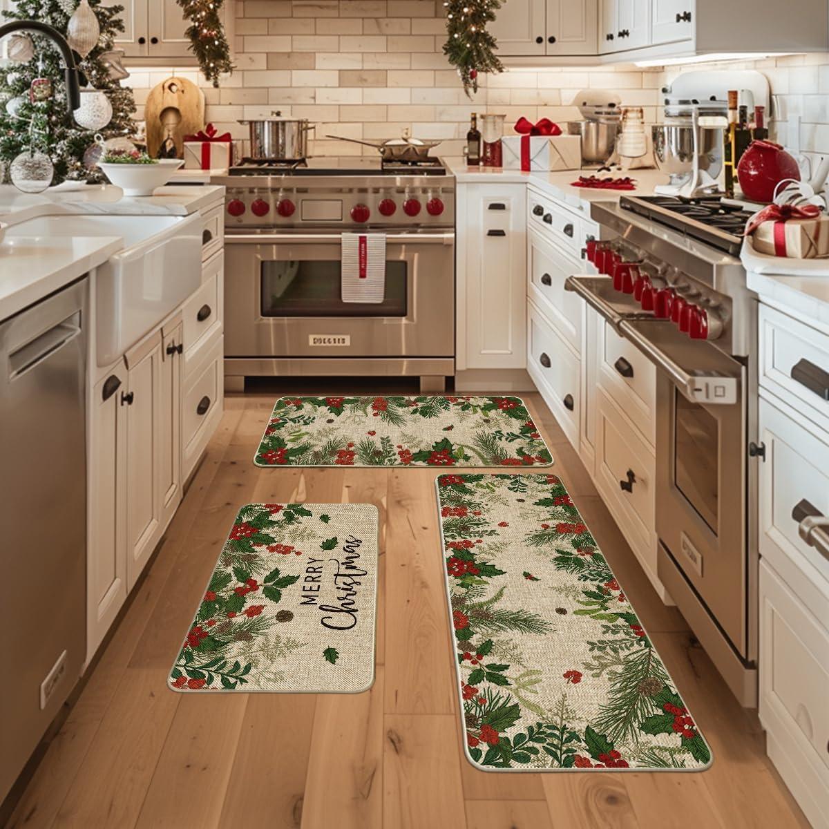 Artoid Mode Leaves Holly Merry Christmas Kitchen Mats Set of 2, Winter Home Decor Low-Profile Kitchen Rugs for Floor – 17×29 and 17×47 Inch(Green/Beige)