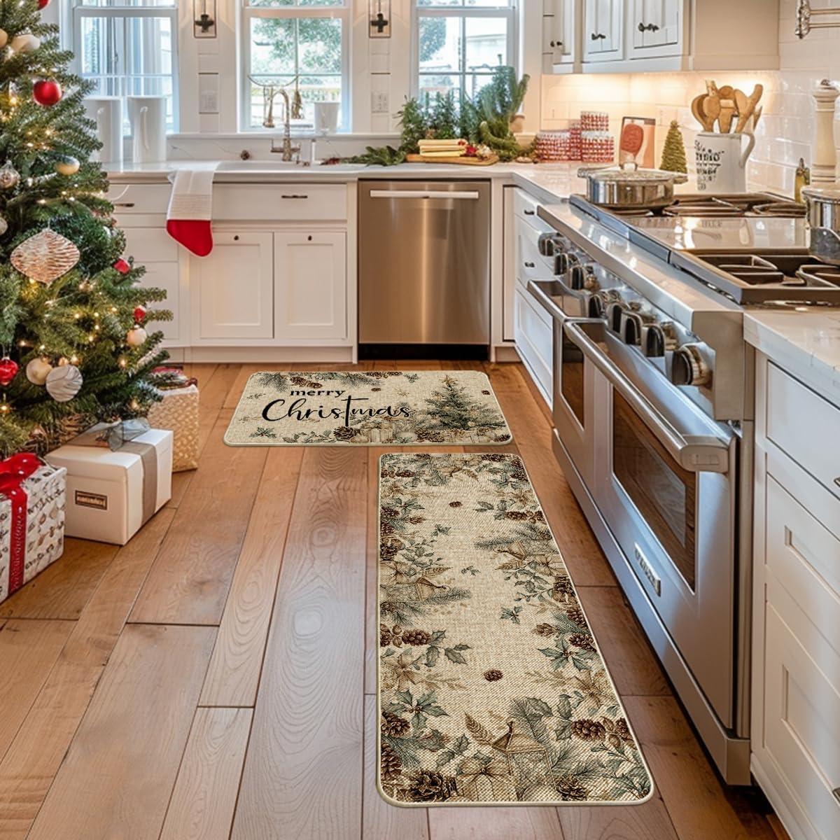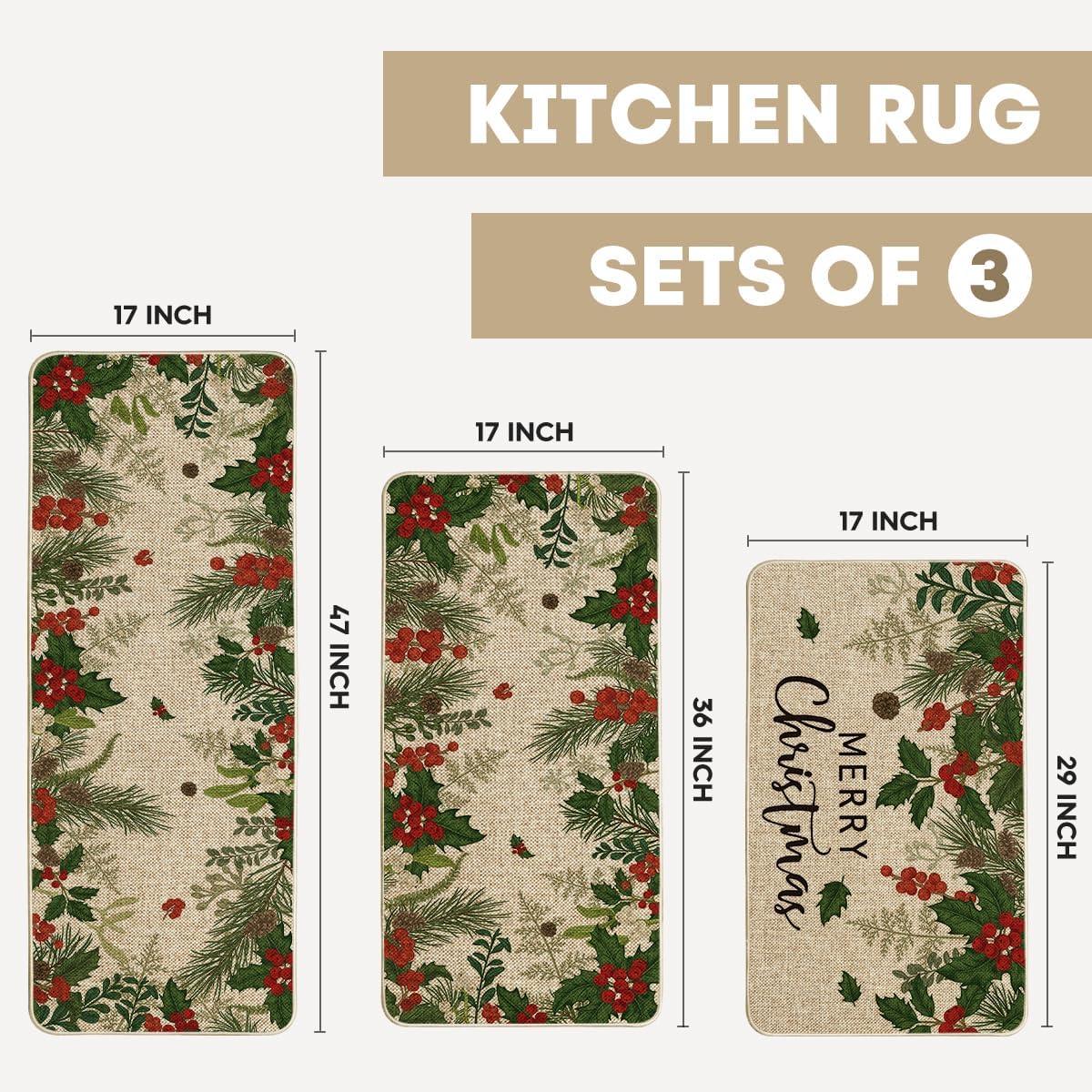 Artoid Mode Holly Ornament Merry Christmas Kitchen Mats Set of 2, Winter Home Decor Low-Profile Kitchen Rugs for Floor – 17×29 and 17×47 Inch(Beige)