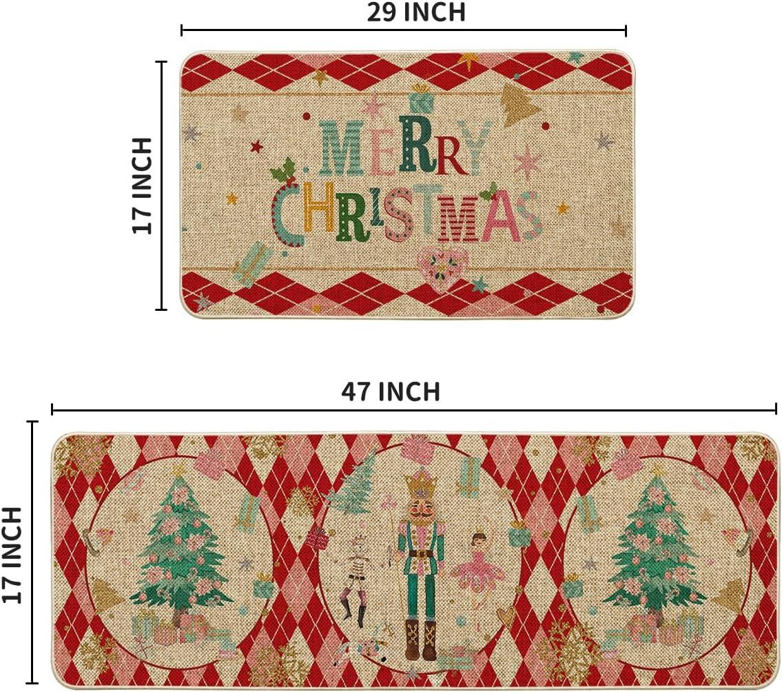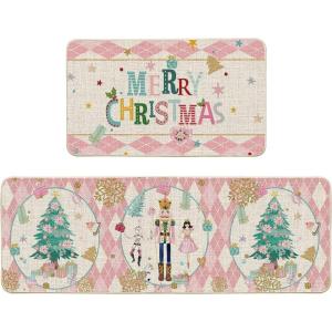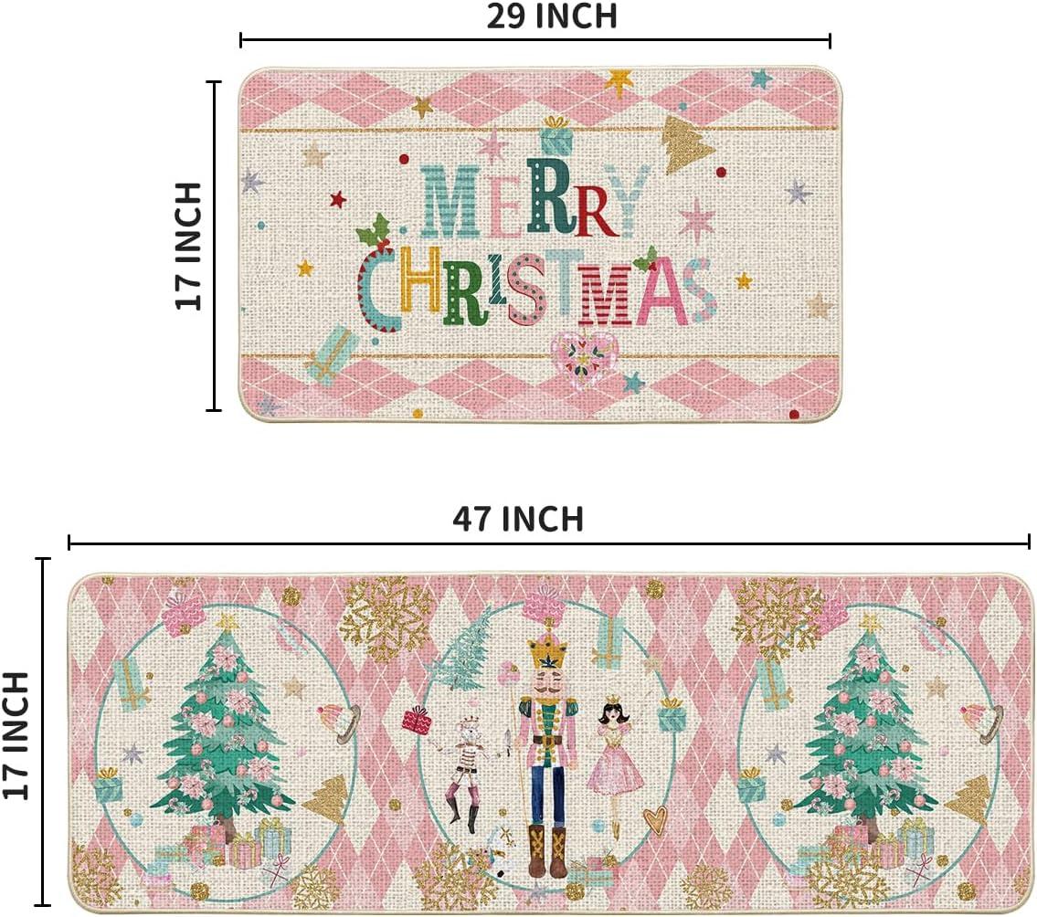 Artoid Mode Red Diamond Plaid Nutcracker Merry Christmas Kitchen Mats Set of 2, Winter Decor Low-Profile Kitchen Rugs for Floor – 17×29 and 17×47 Inch(Pink)