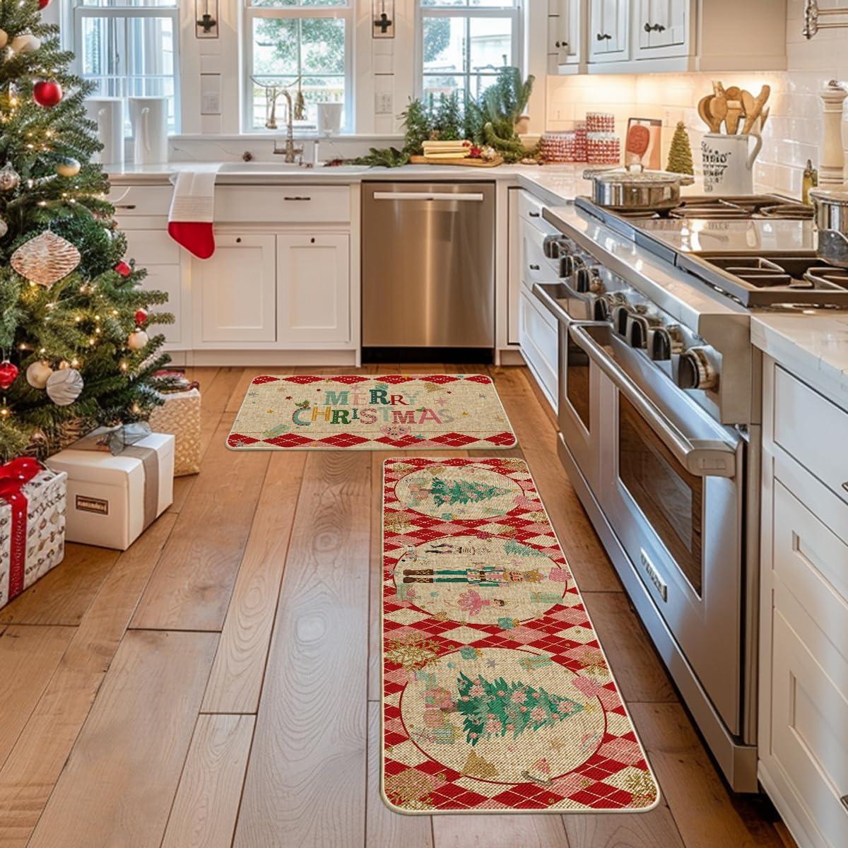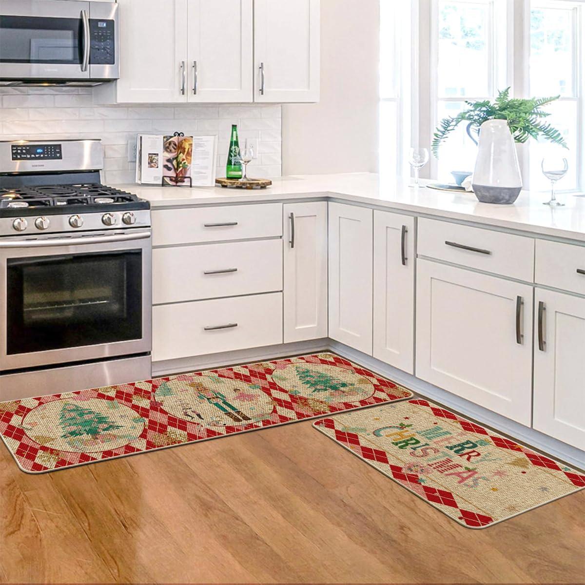 Artoid Mode Green Buffalo Plaid Xmas Tree Merry Christmas Kitchen Mats Set of 2, Winter Home Decor Low-Profile Kitchen Rugs for Floor – 17×29 and 17×47 Inch(Red/Beige)