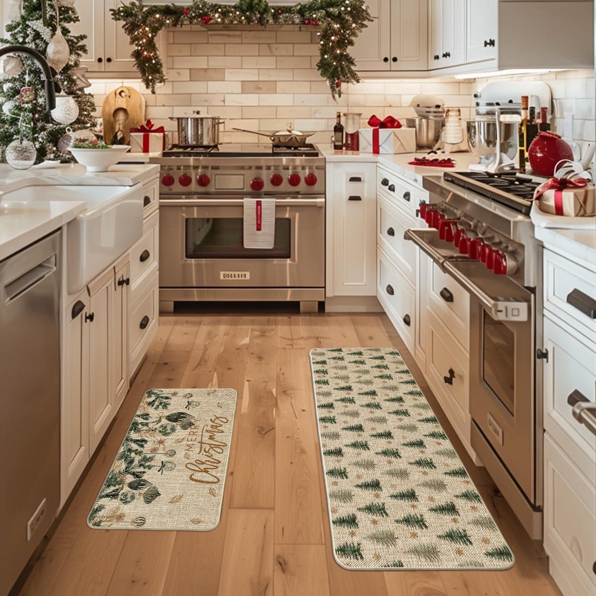 Artoid Mode Green Buffalo Plaid Xmas Tree Merry Christmas Kitchen Mats Set of 2, Winter Home Decor Low-Profile Kitchen Rugs for Floor – 17×29 and 17×47 Inch(Green/Beige)