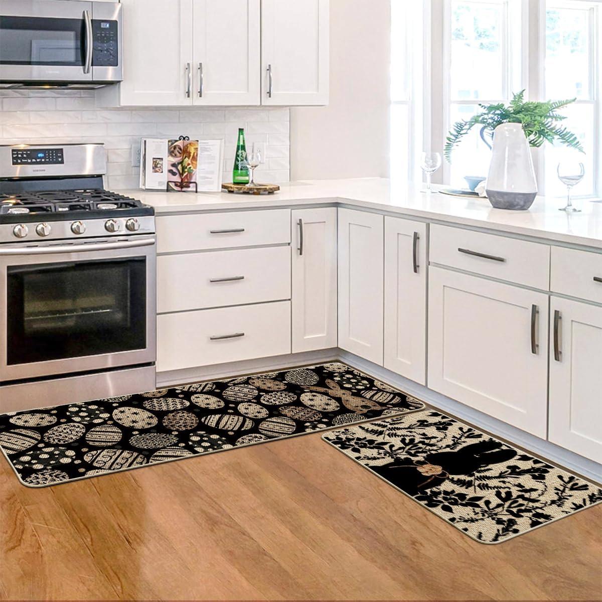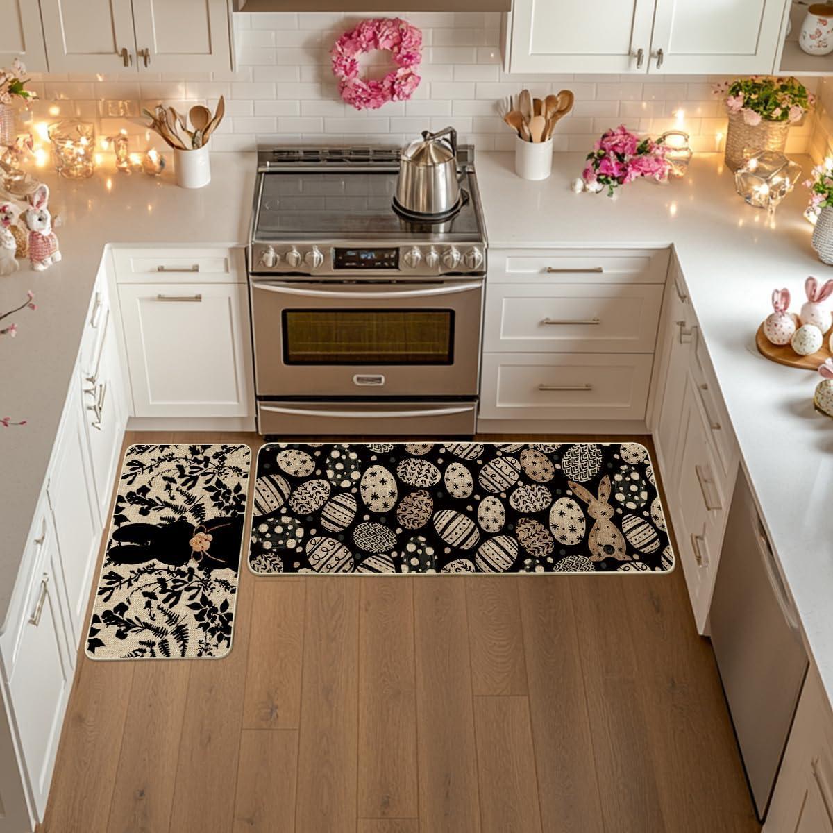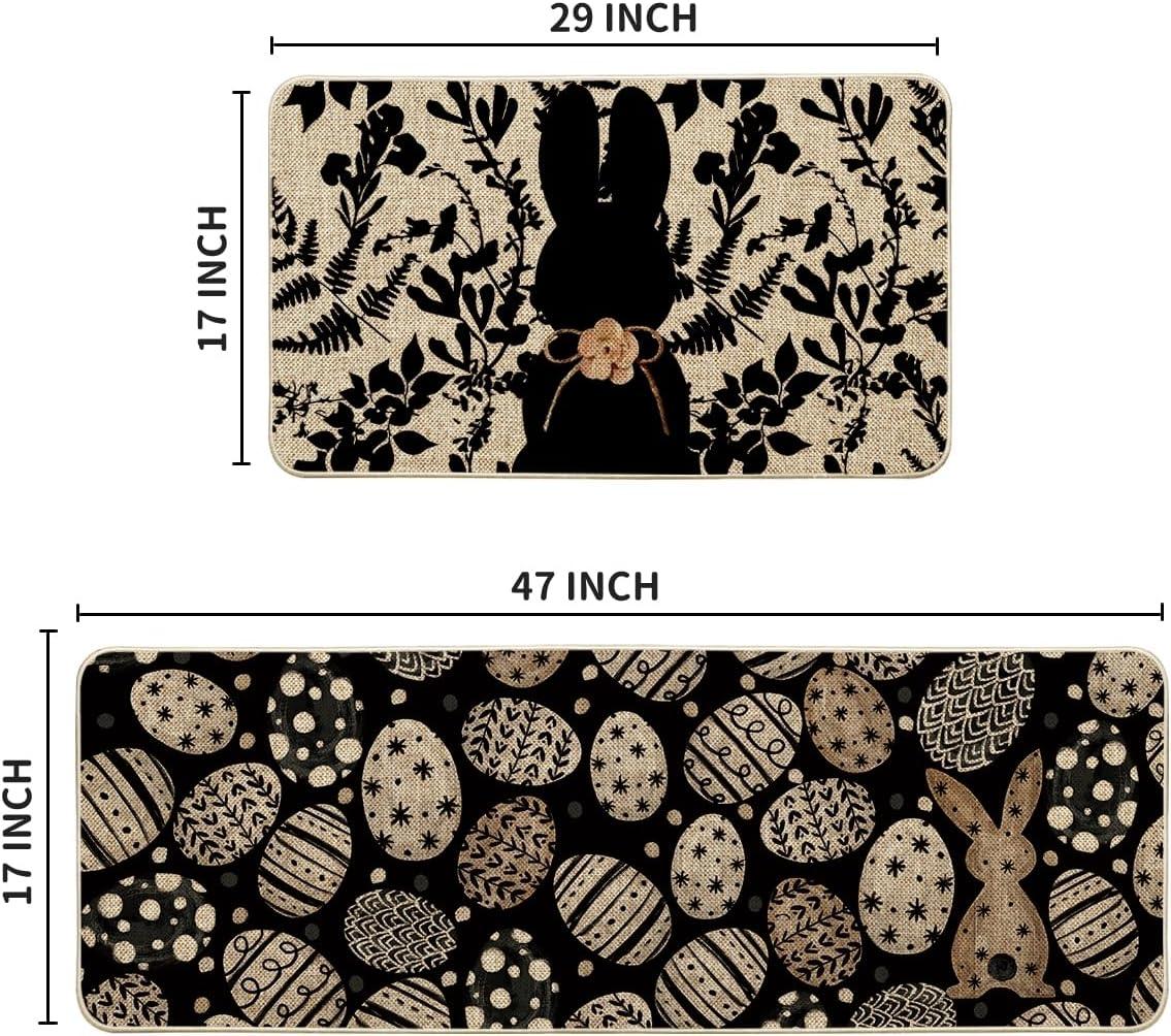 Artoid Mode Black Bunny Egg Leaves Easter Kitchen Mats Set of 2, Spring Home Decor Low-Profile Kitchen Rugs for Floor – 17×29 and 17×47 Inch(Black)
