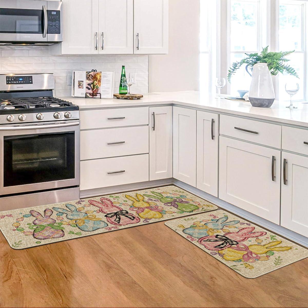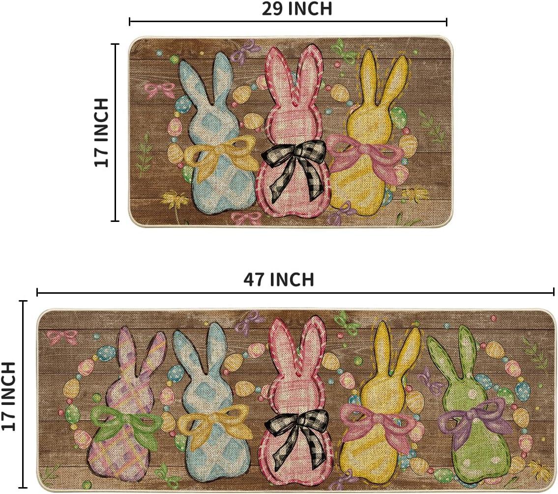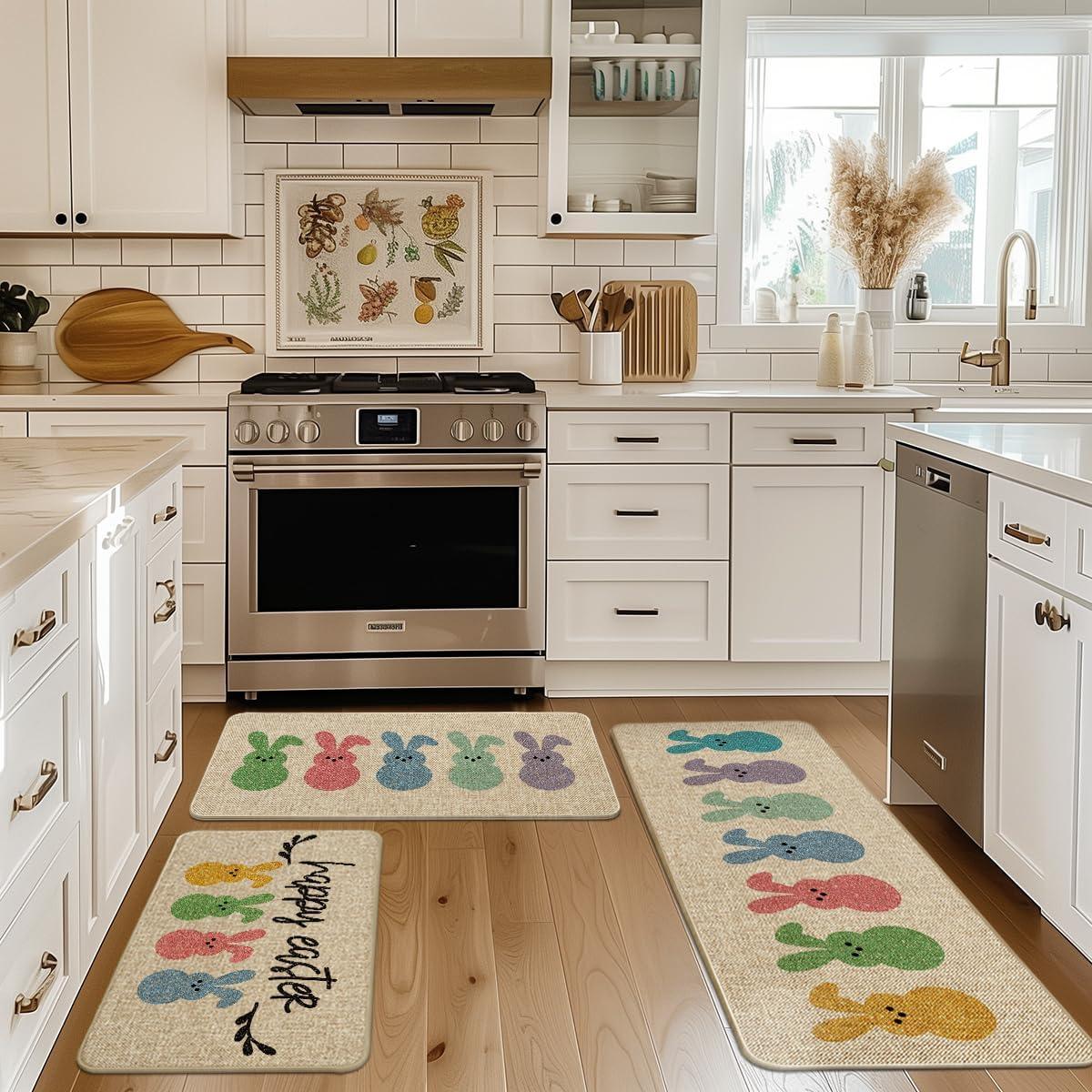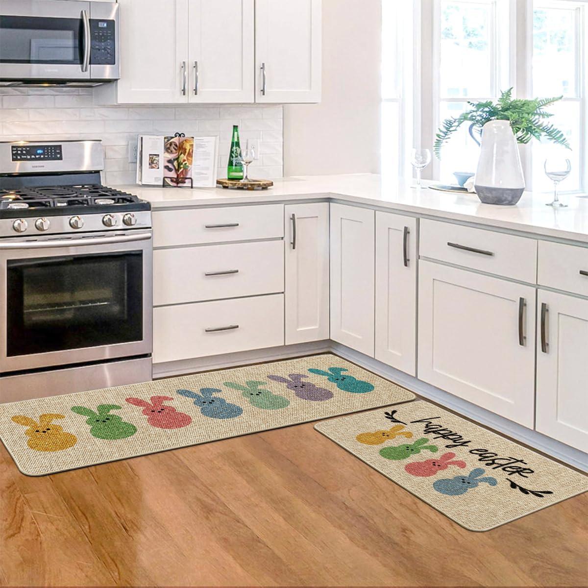 Artoid Mode Happy Easter Rabbits Decorative Kitchen Mats Set of 2, Home Seasonal Spring Easter Holiday Holiday Party Low-Profile Floor Mat – 17×29 and 17×47 Inch(Beige)