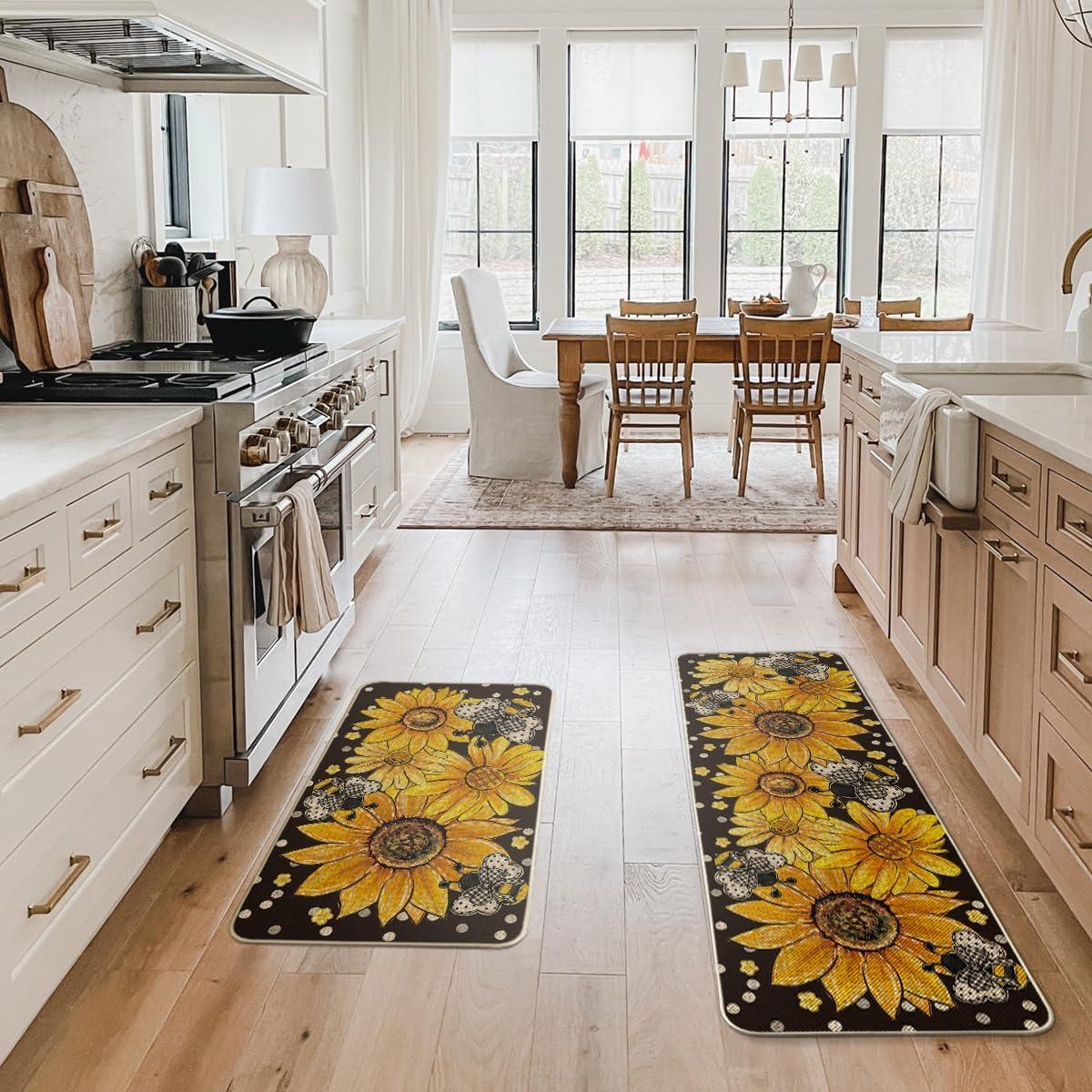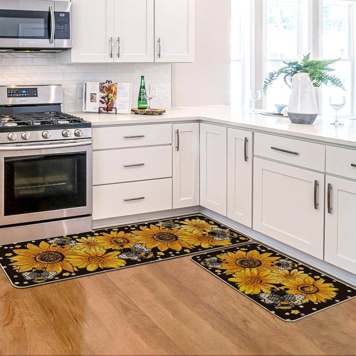 Artoid Mode Bee Sunflower Daisy Spring Kitchen Mats Set of 2, Black Summer Home Decor Low-Profile Kitchen Rugs for Floor – 17×29 and 17×47 Inch(Black)