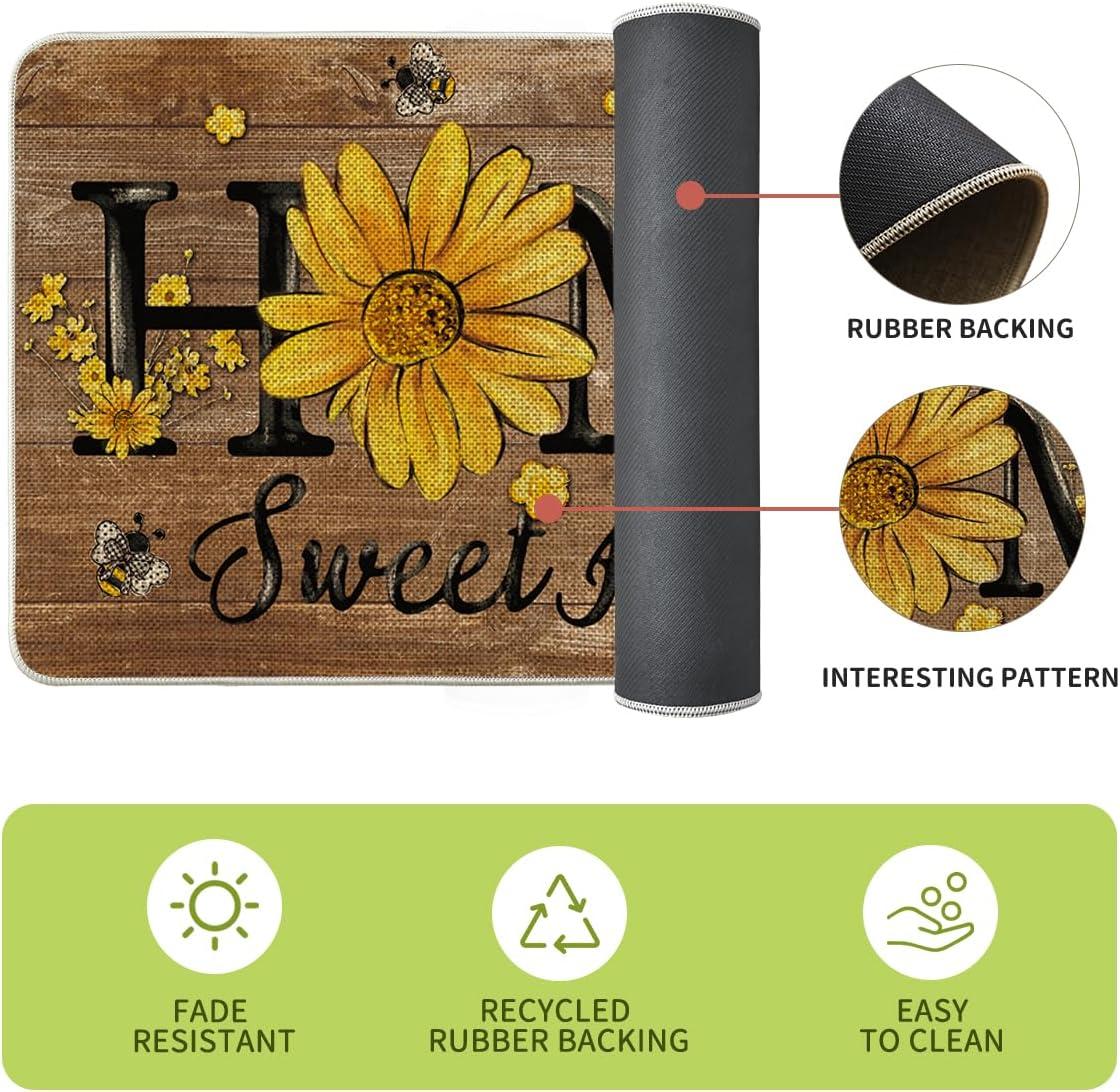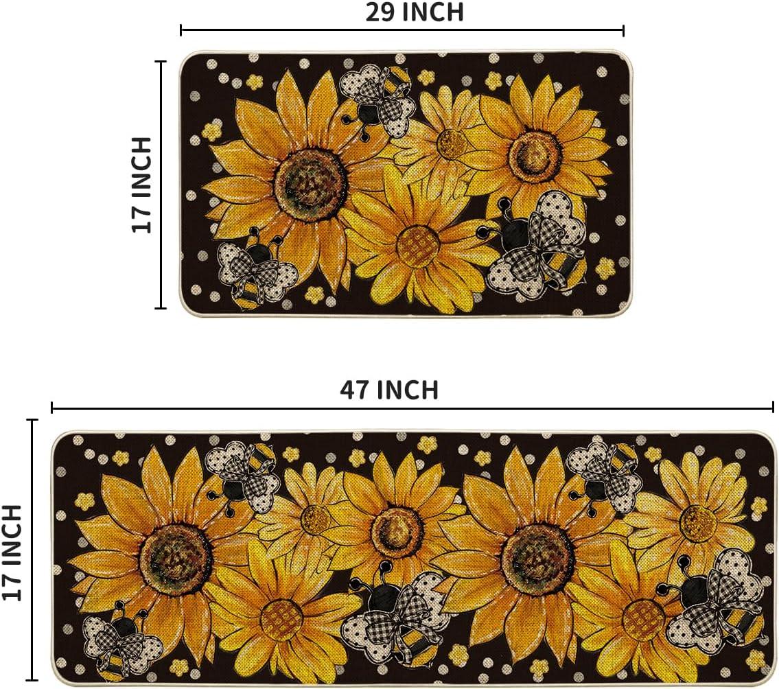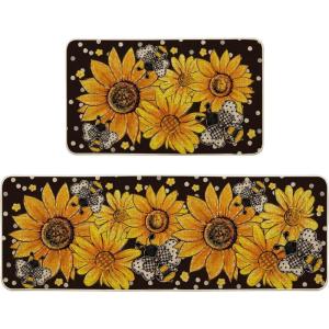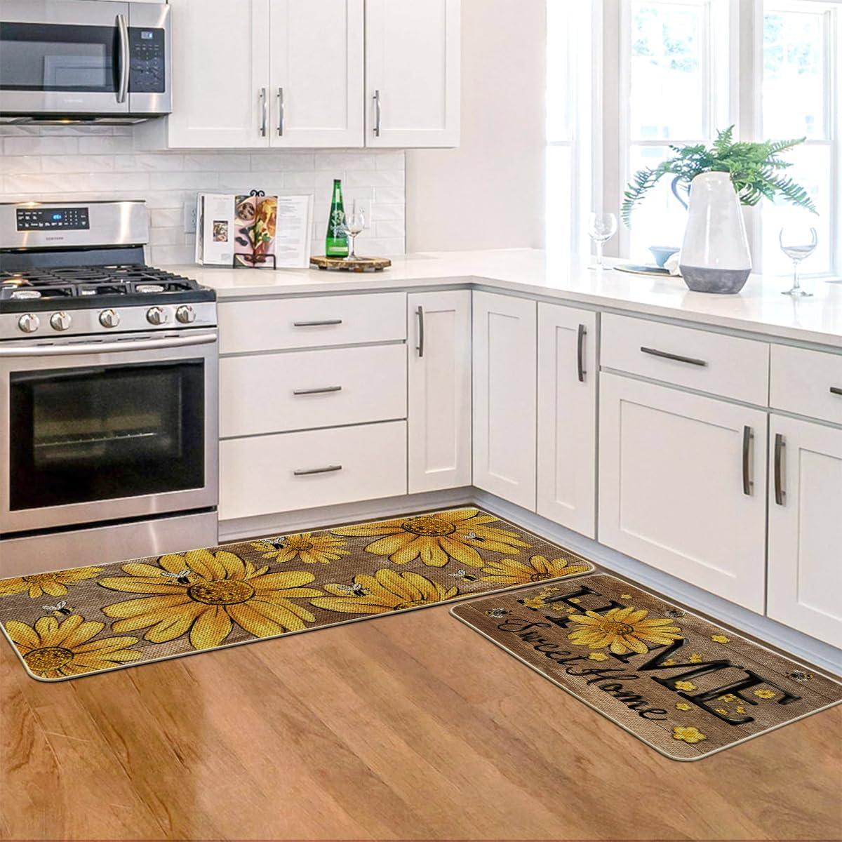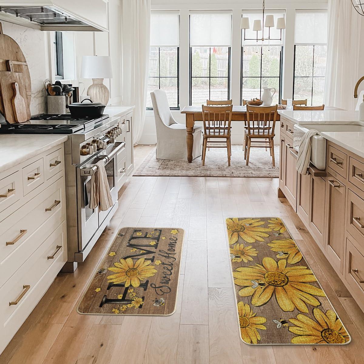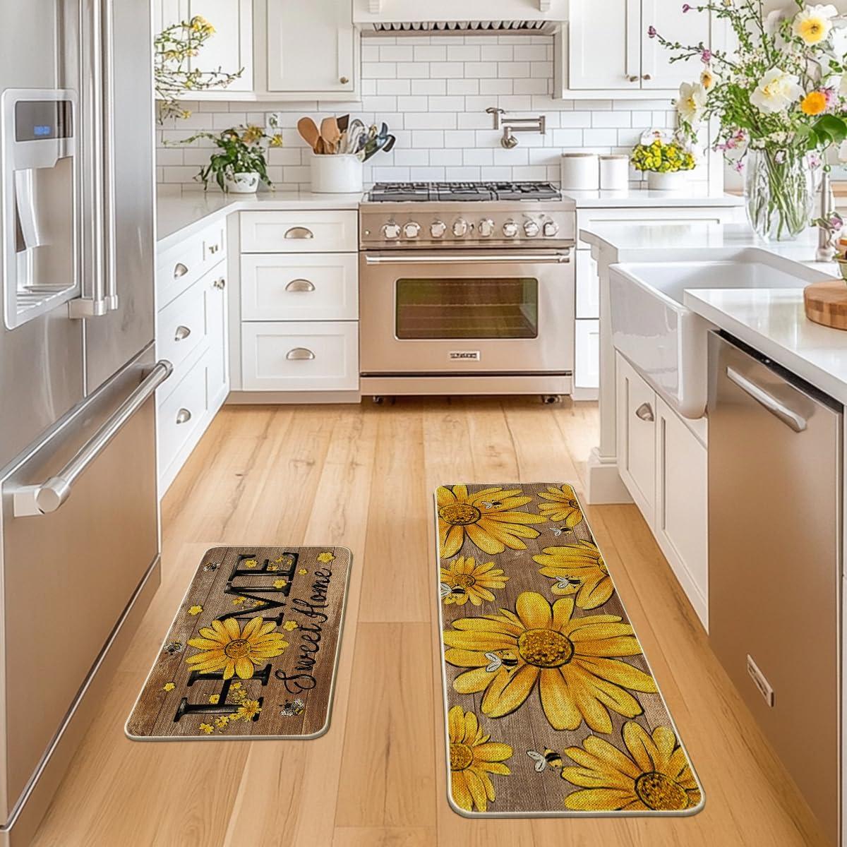 Artoid Mode Wood Bee Sunflower Daisy Home Spring Kitchen Mats Set of 2, Summer Home Decor Low-Profile Kitchen Rugs for Floor – 17×29 and 17×47 Inch(Brown)
