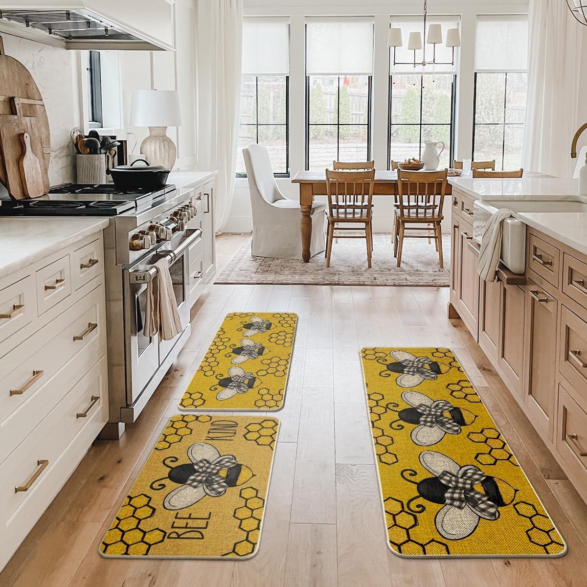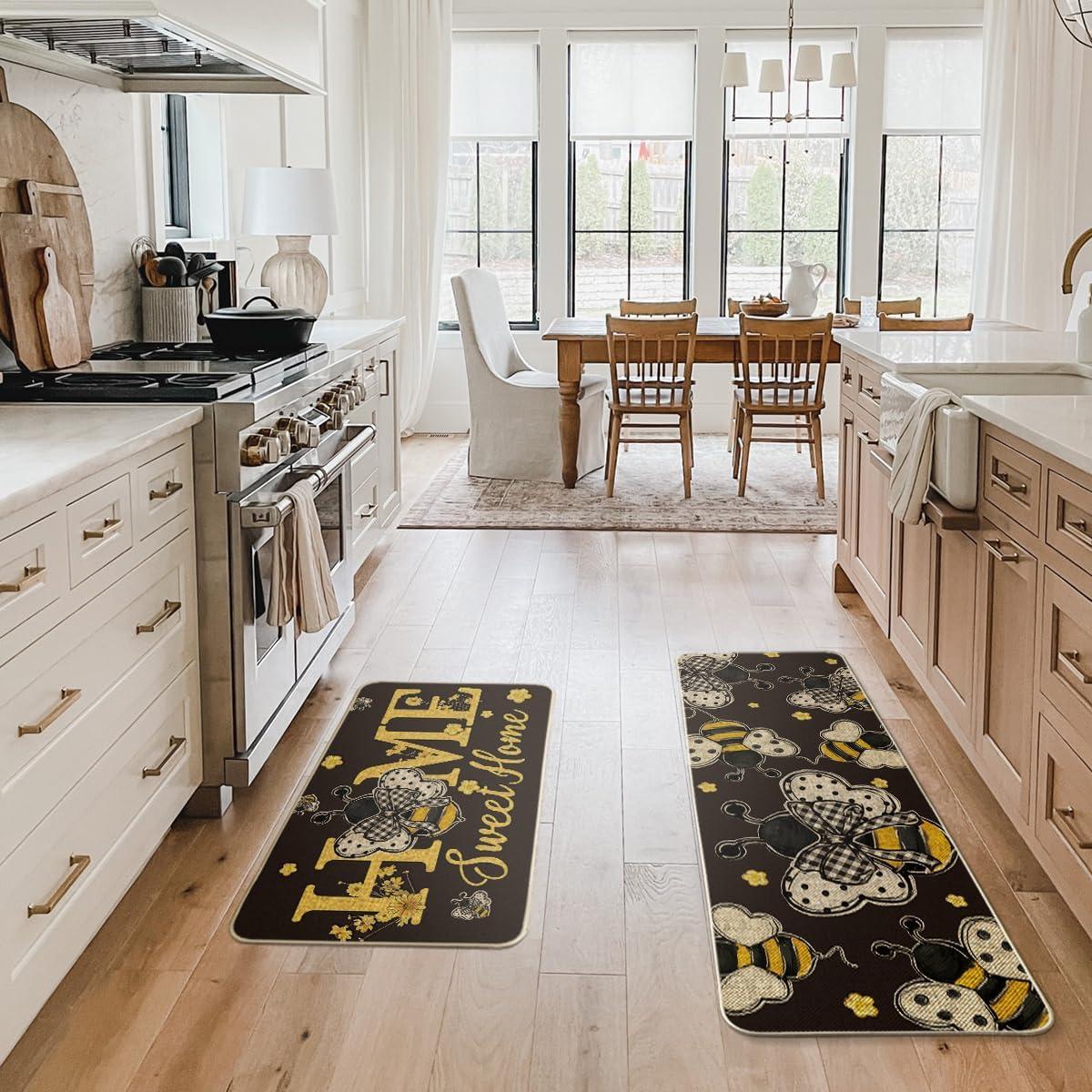Artoid Mode Black Bee Home Sweet Home Spring Kitchen Mats Set of 2, Summer Home Decor Low-Profile Kitchen Rugs for Floor – 17×29 and 17×47 Inch(Yellow)